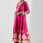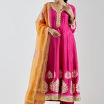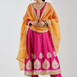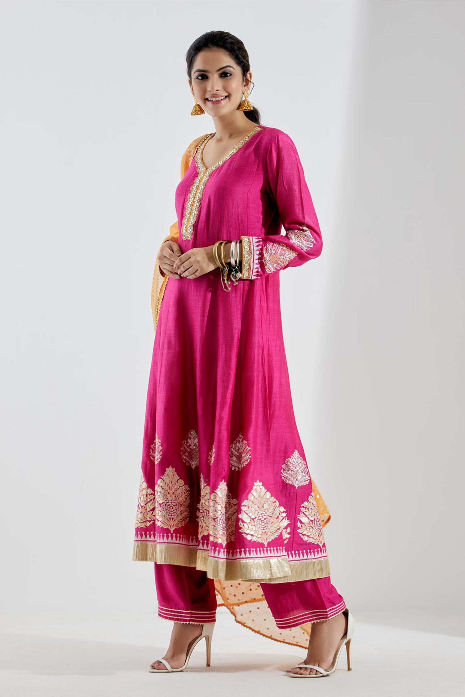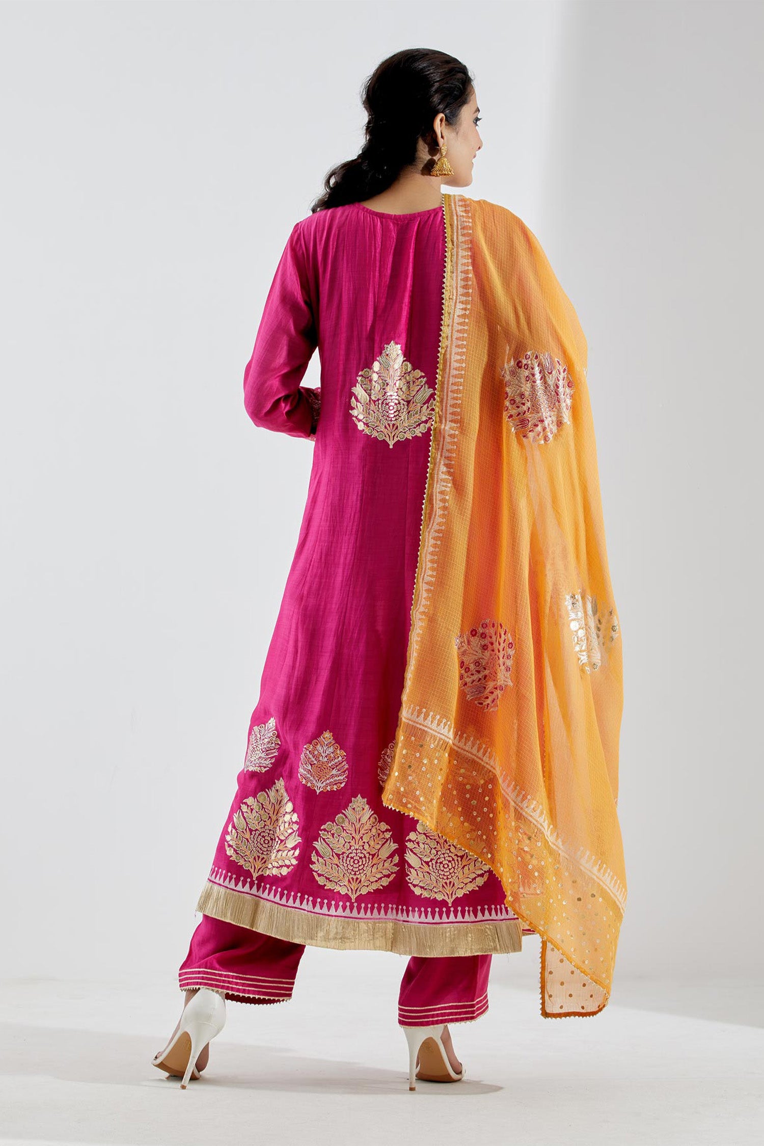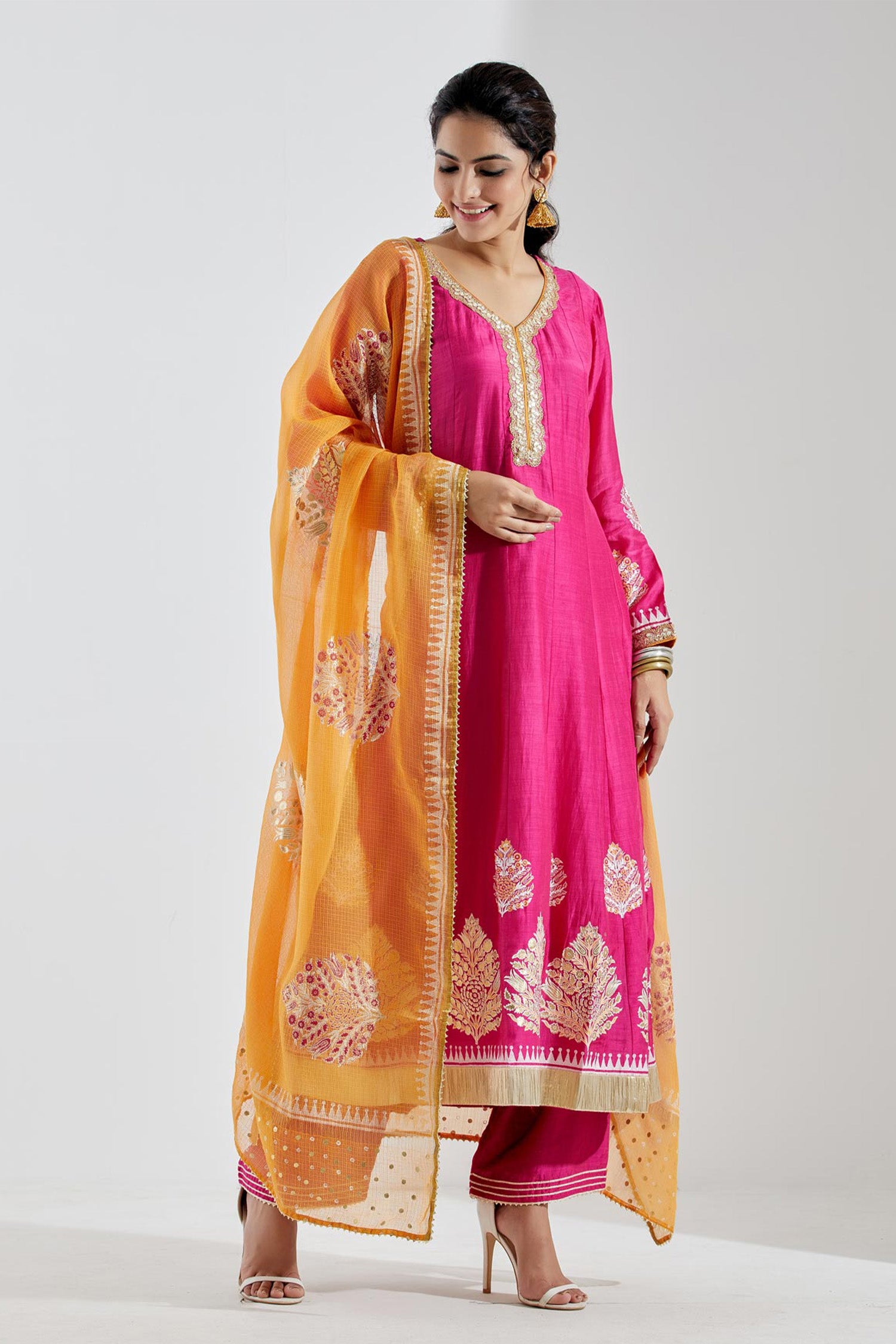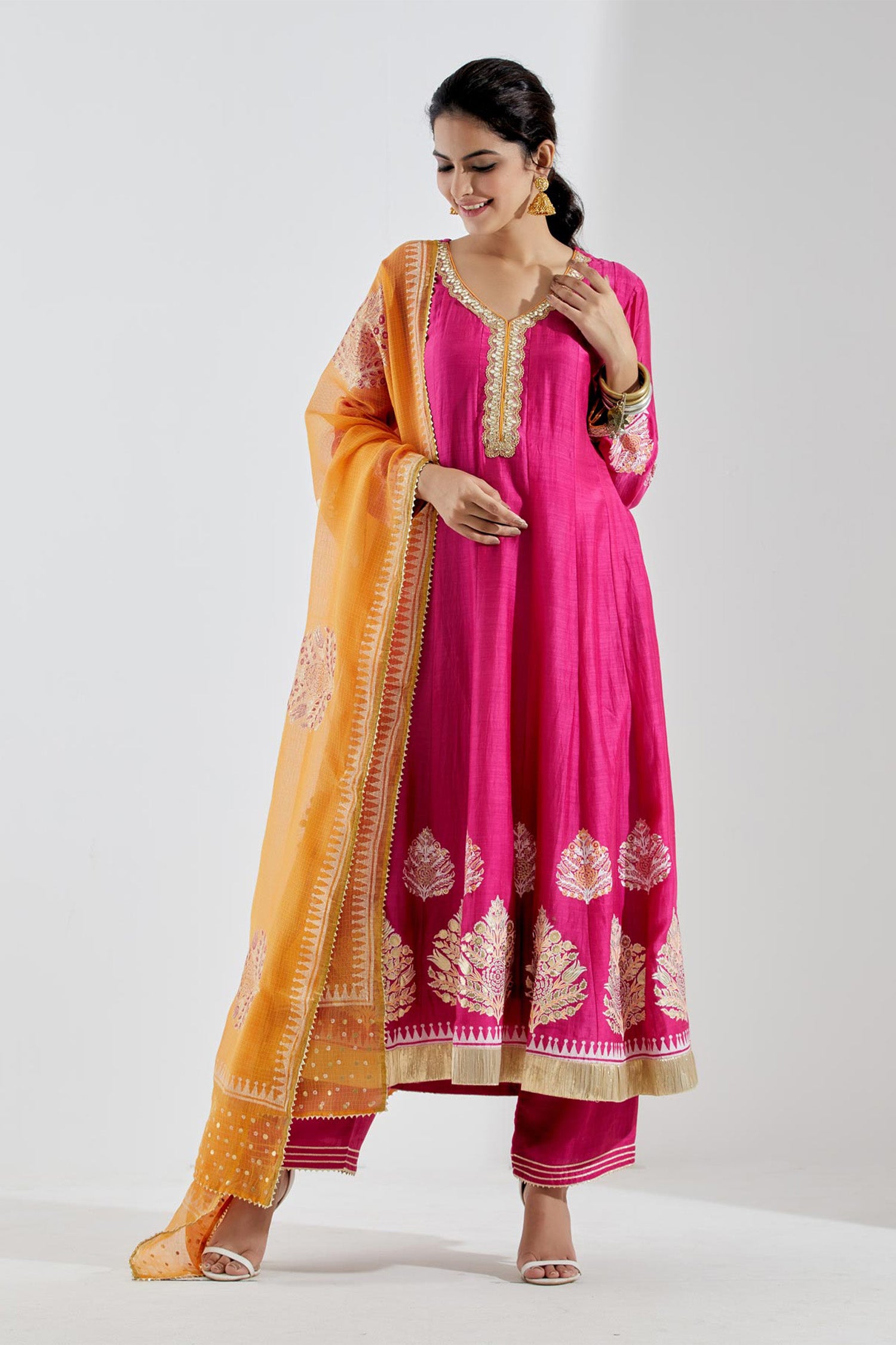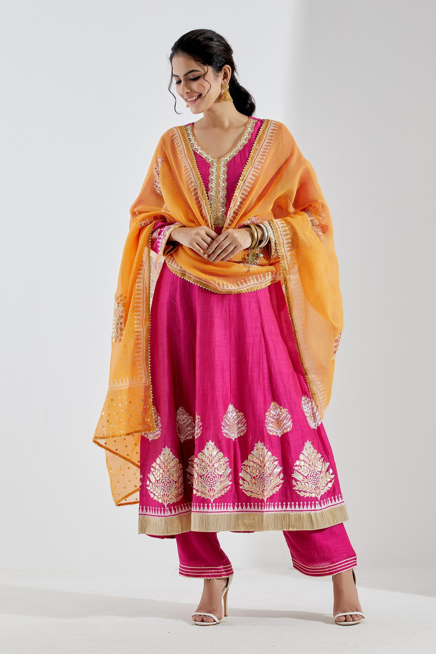 The beautiful Pink cotton silk anarkali set with subtle golden floral patterns gota patti work along with the contrasting Orange dupatta with lace and subtle golden printed design for an charismatic and stand out look.