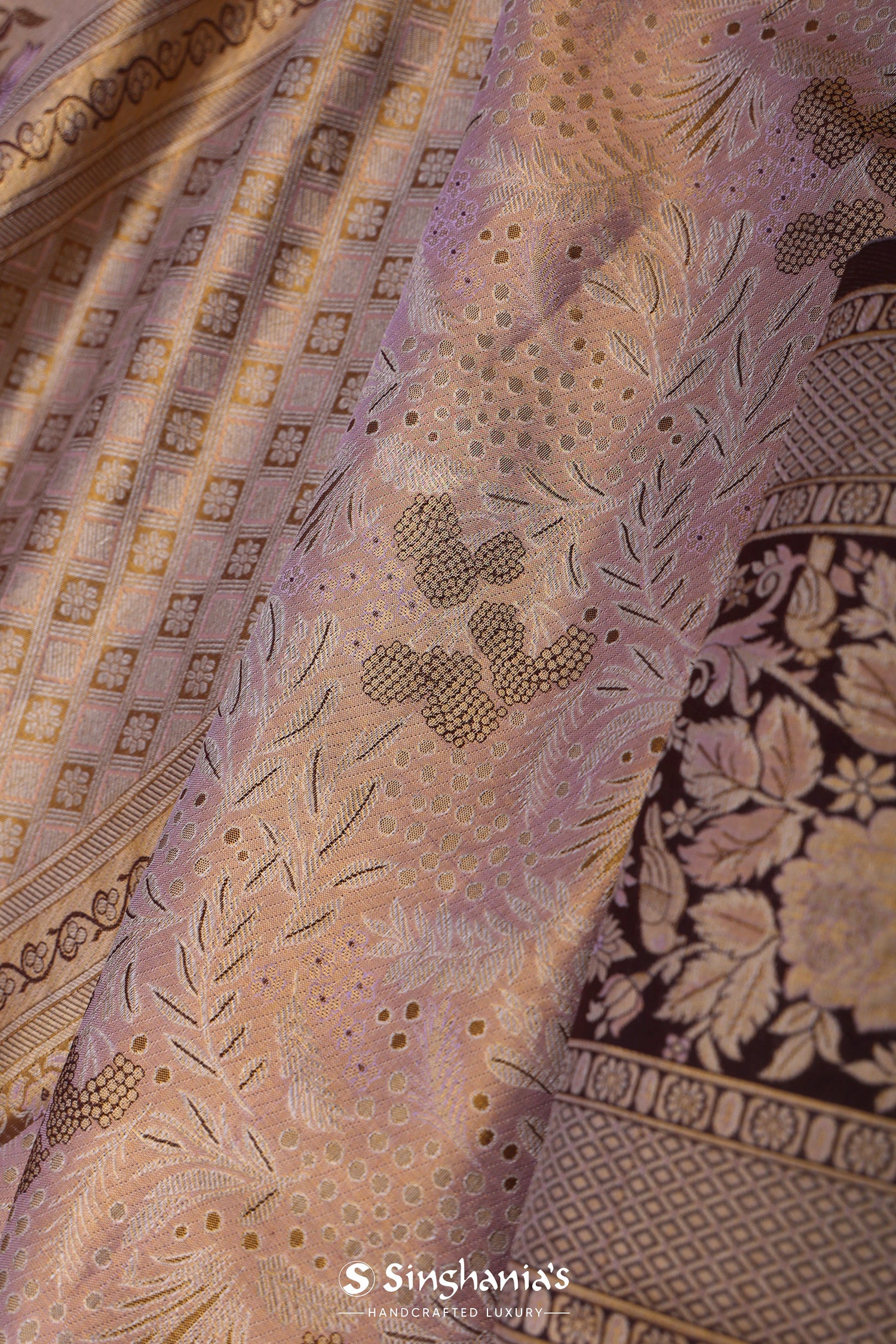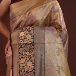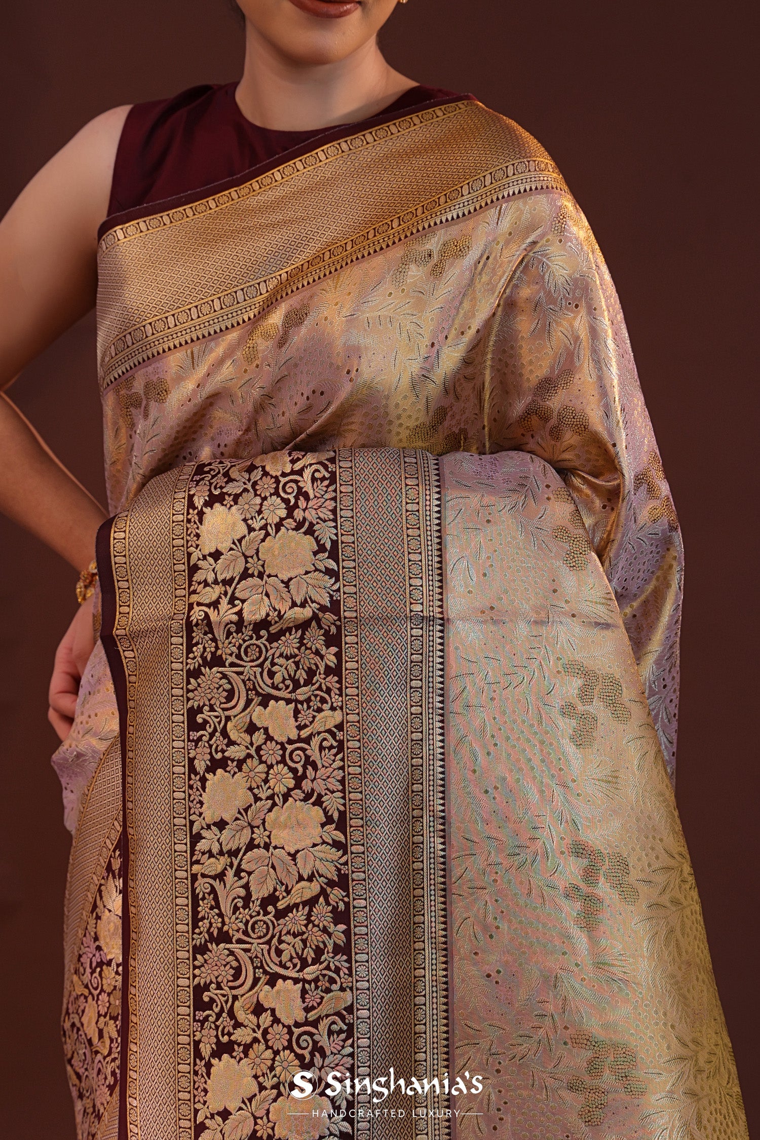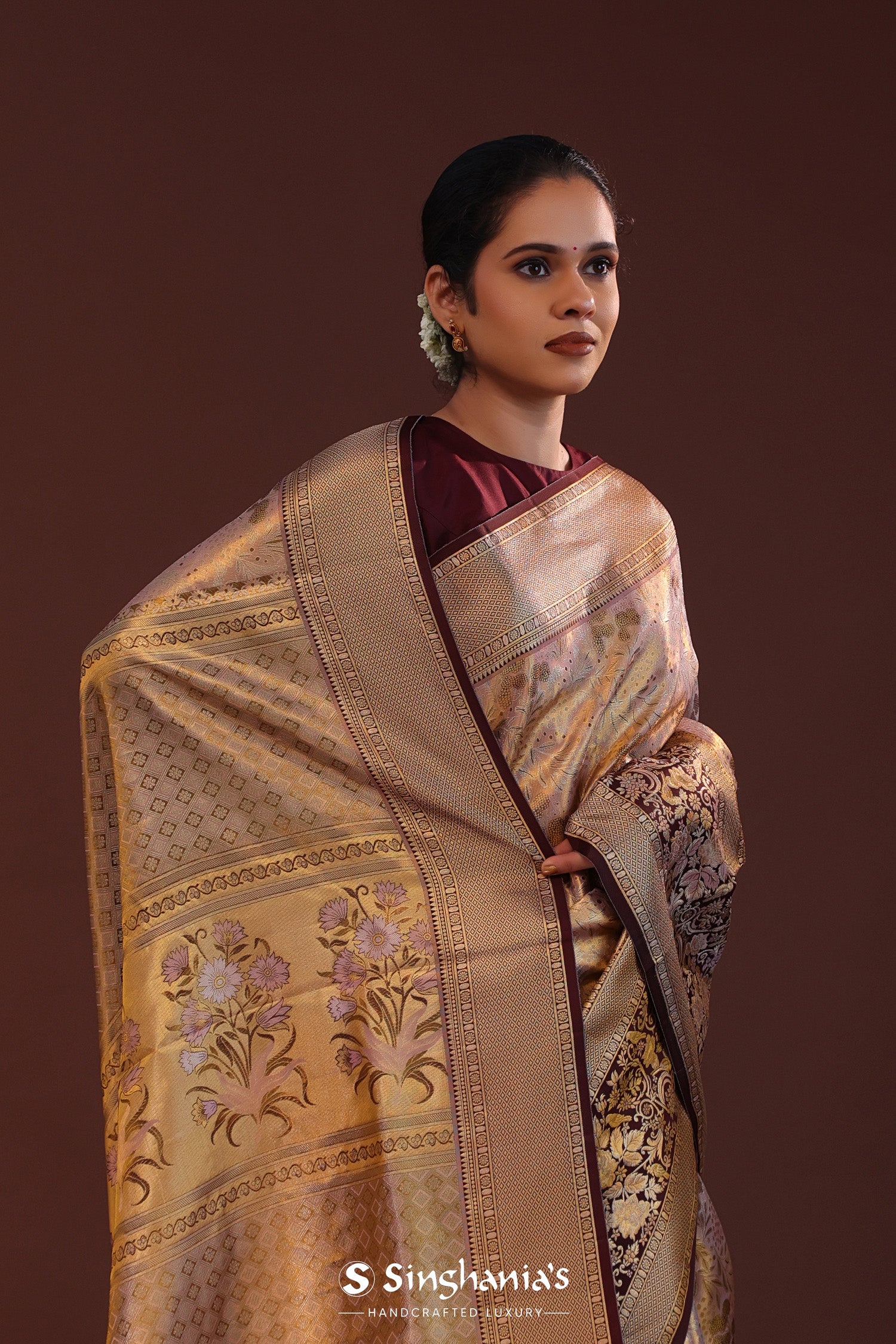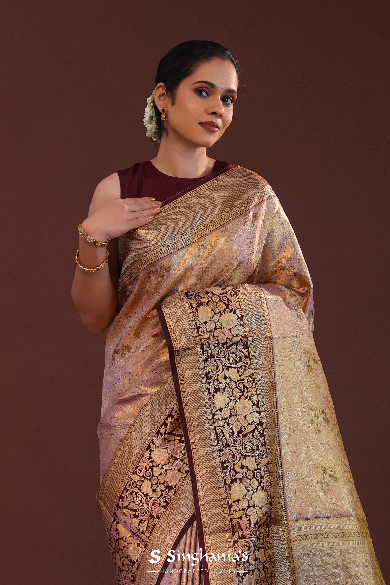 The brocades woven on body with silver and gold zari of Beige kanjivaram tissue saree complemented with dark brown contrast border adorned with floral design and contrast unstitched blouse