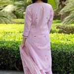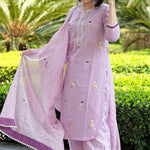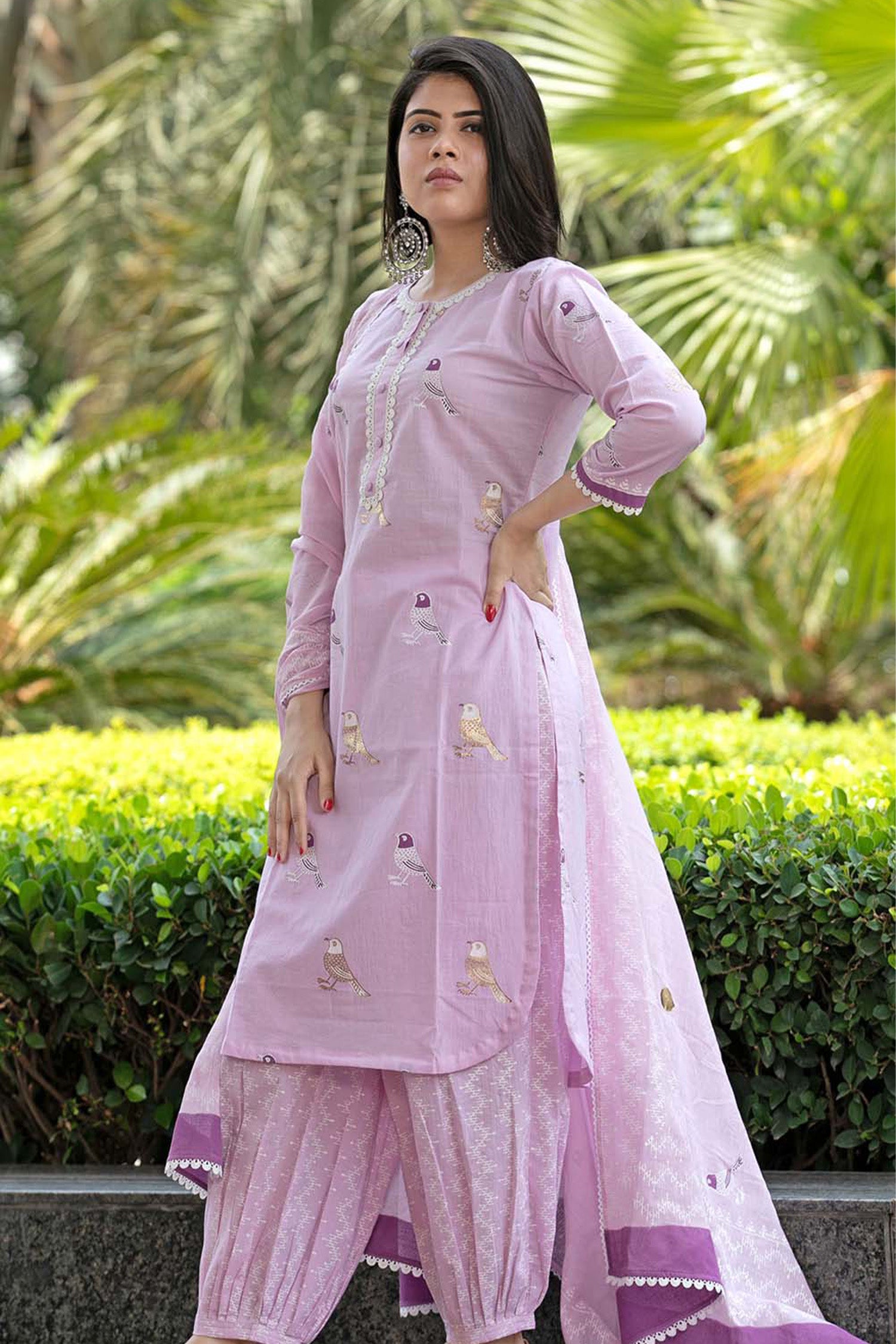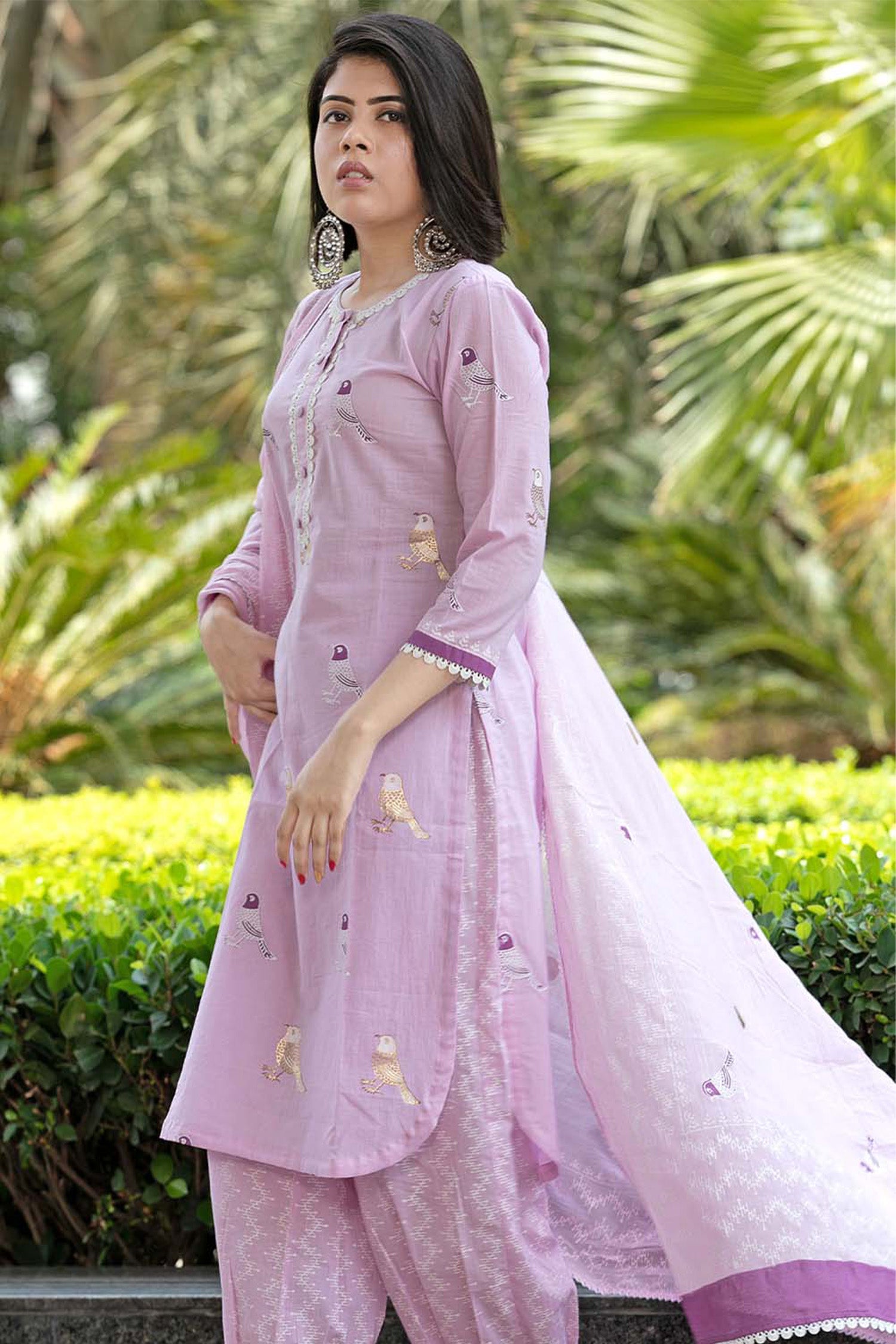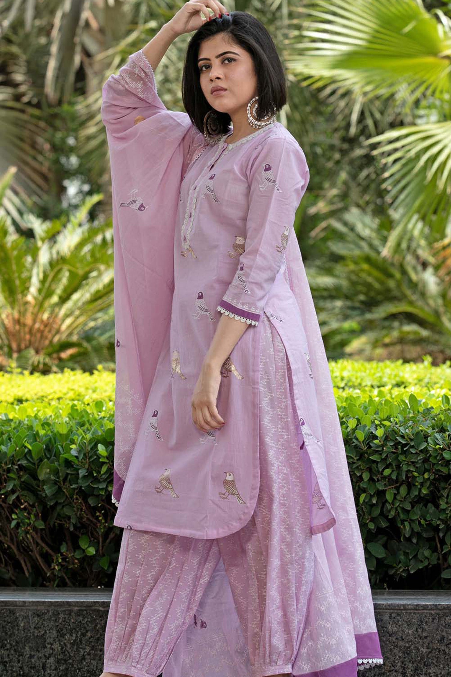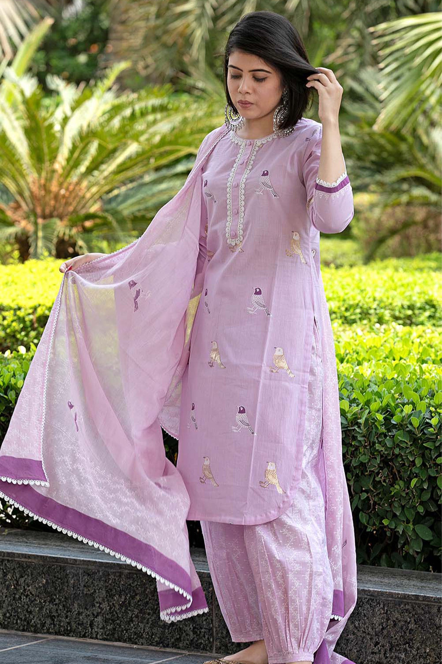 The elegant light purple kurta set crafted from the cotton with the bird print pattern along with a salwar style bottom and a matching dupatta with it's soft pattern gives it a comfortable and stylish look.