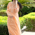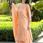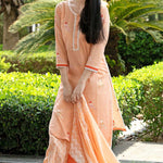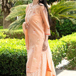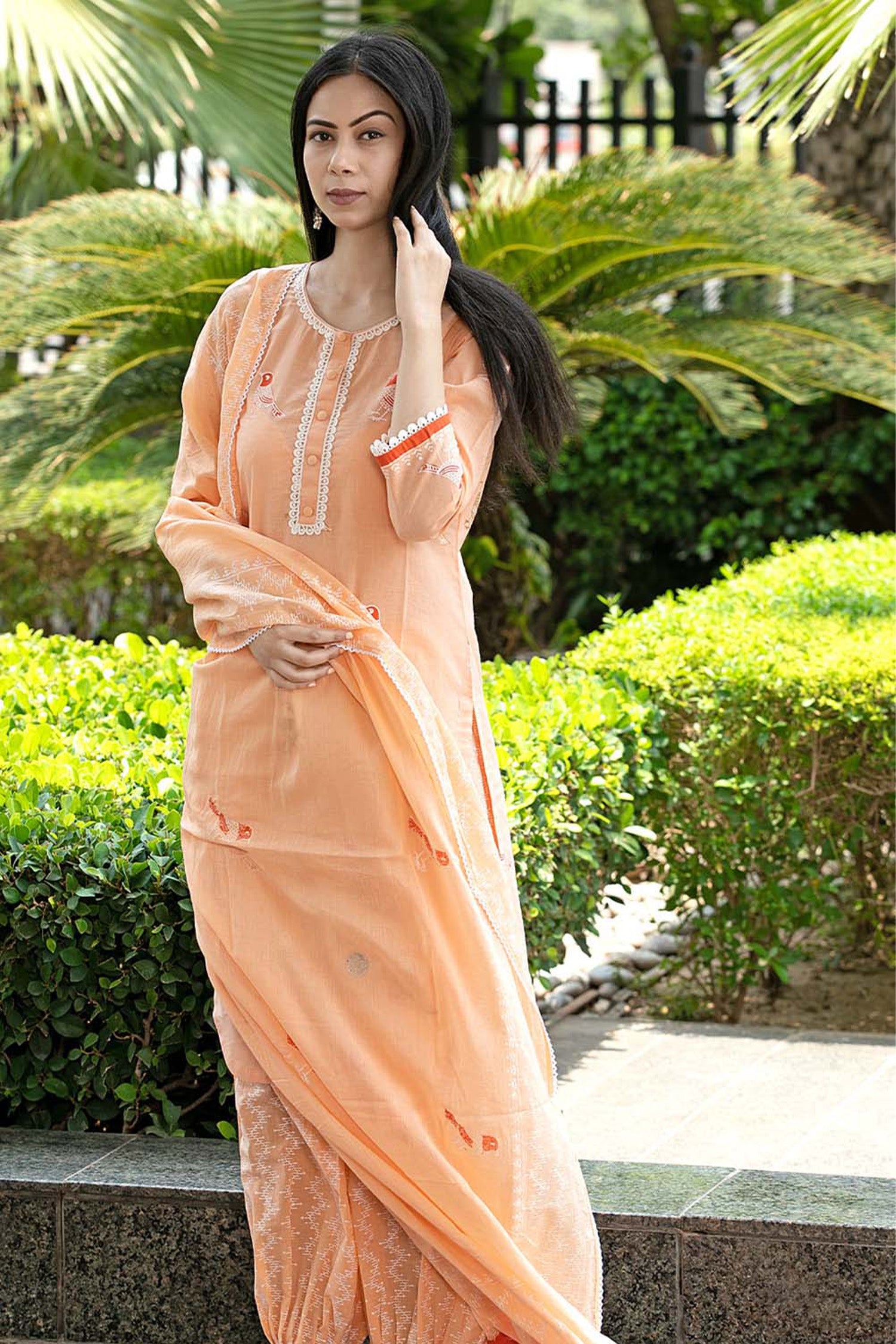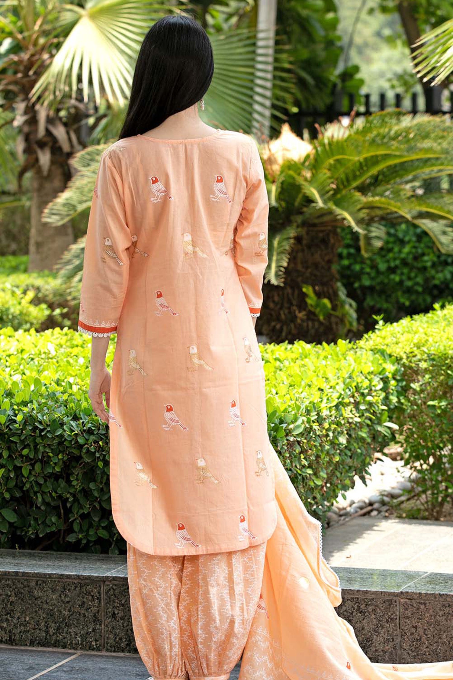 The elegant peach kurta set crafted from the cotton with the bird print pattern along with a salwar style bottom and a matching dupatta with it's soft pattern gives it a comfortable and stylish look.