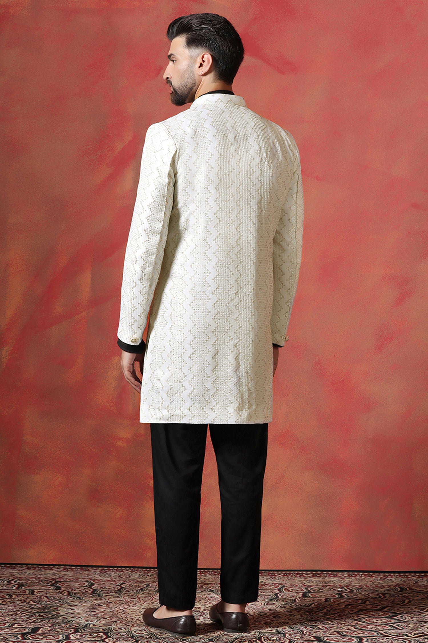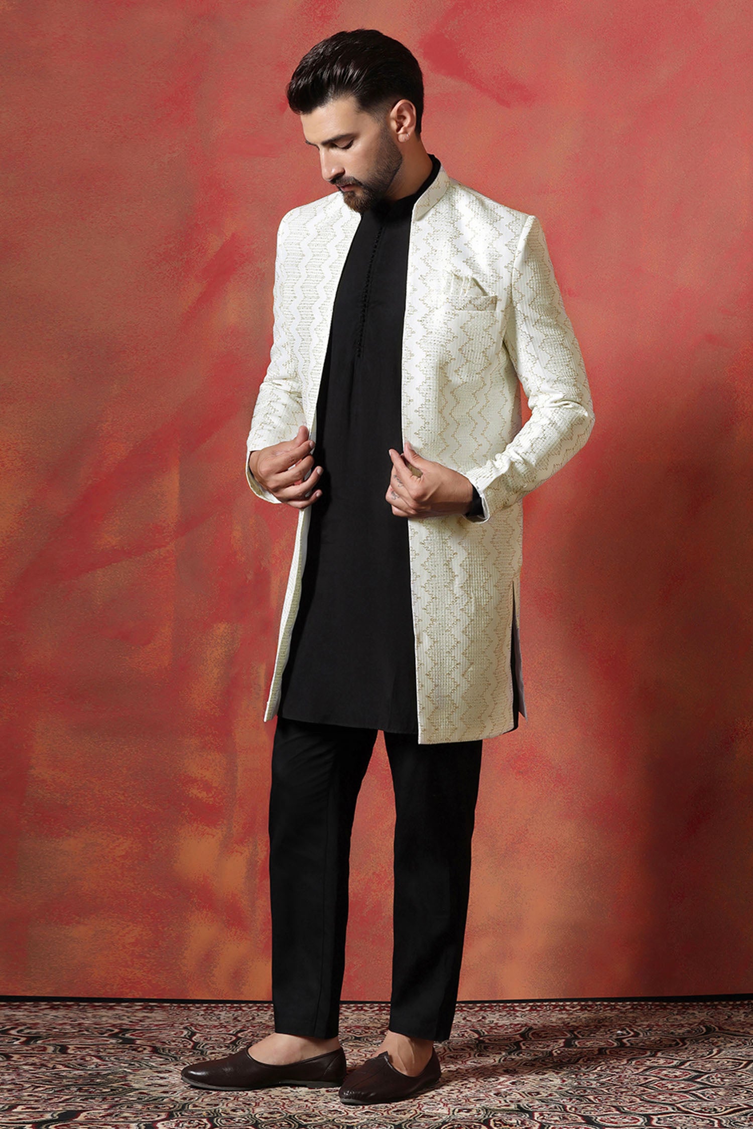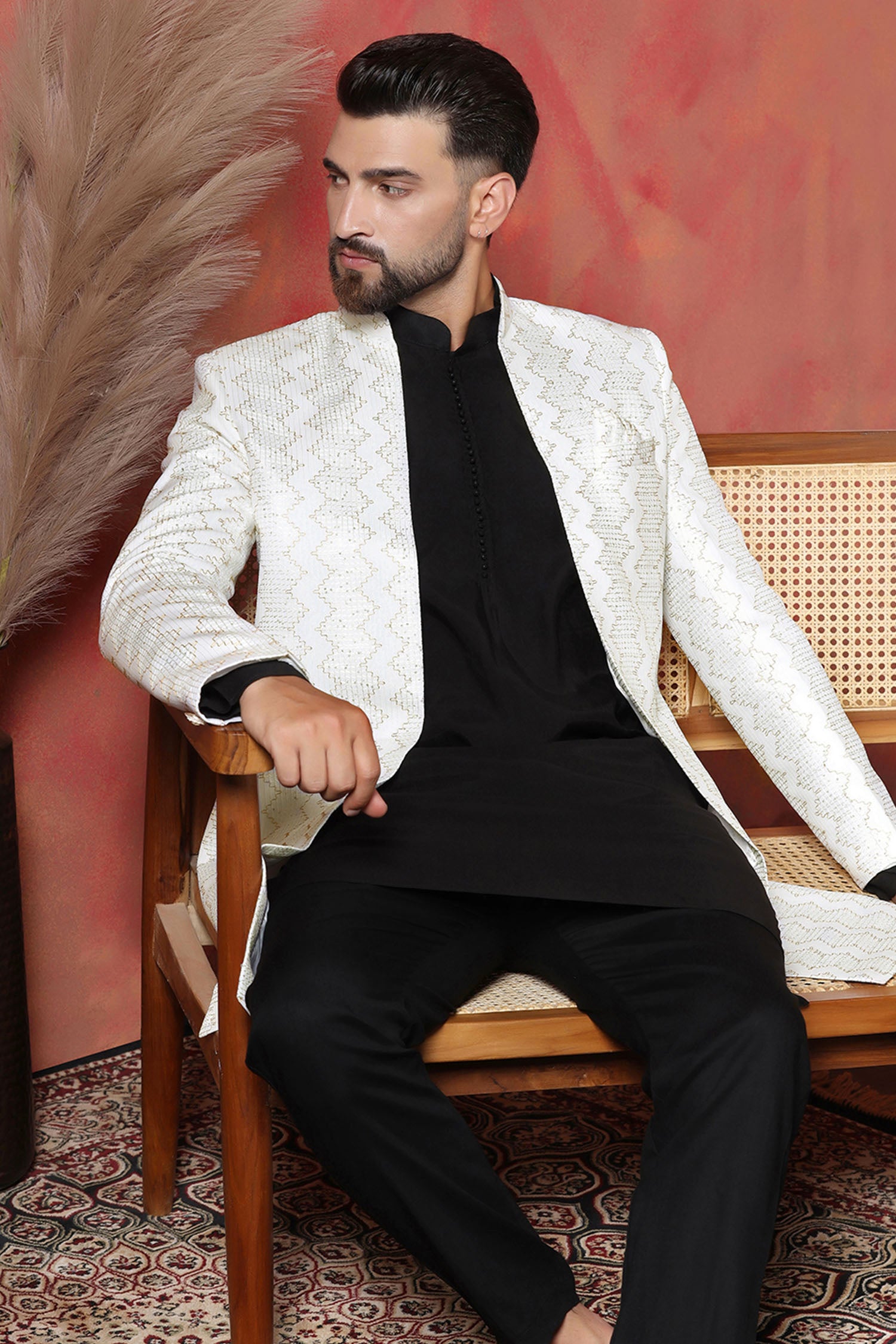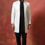 The black and white cotton blend solid sherwani set with subtle embroidered open prince coat for a neat and classy look.