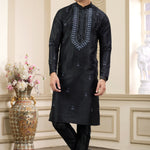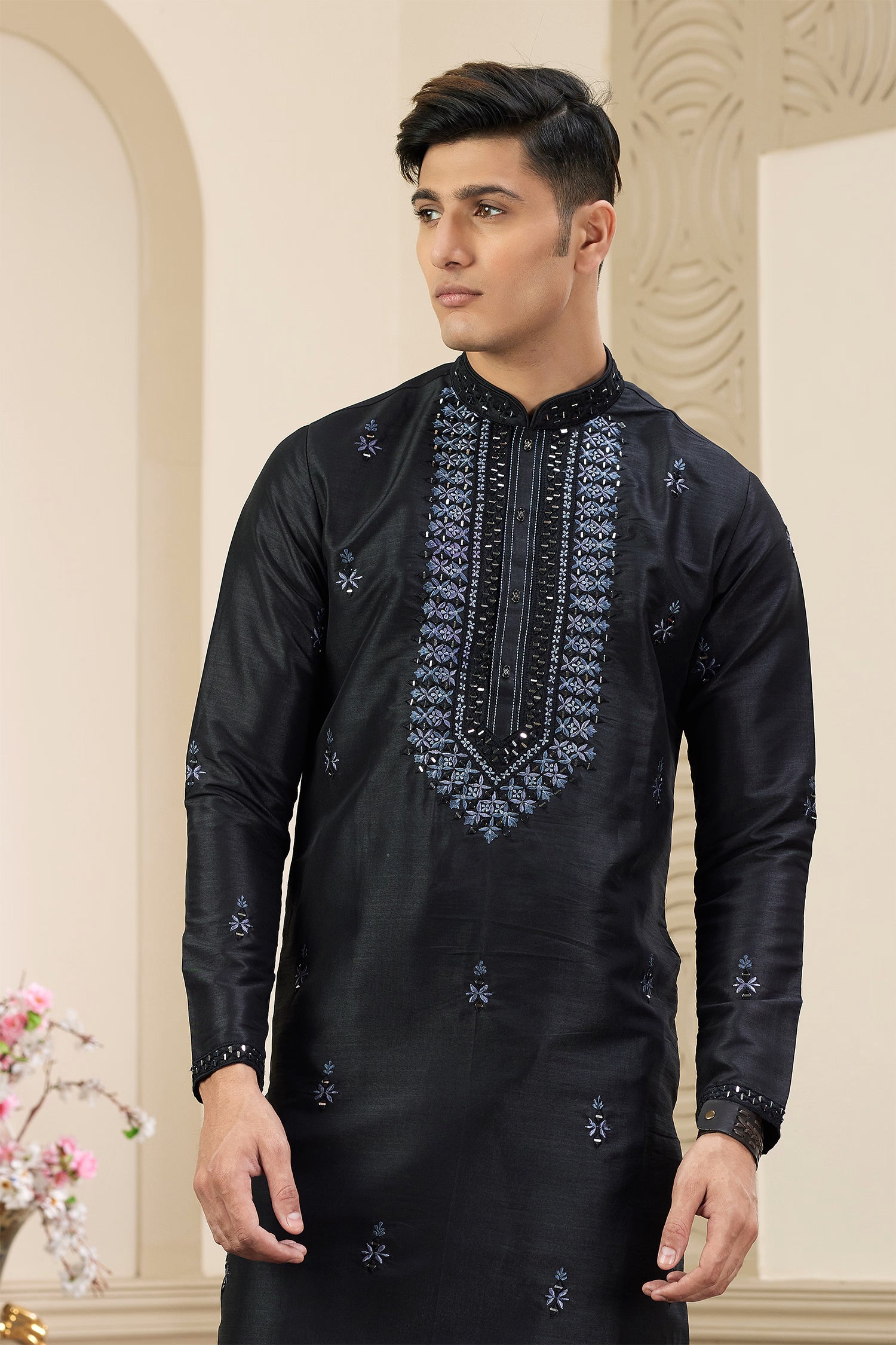 A black comforting straight kurta set adorned with shisha work and embroidery work with blue thread around the collar neck and making ideal choice for any causal events