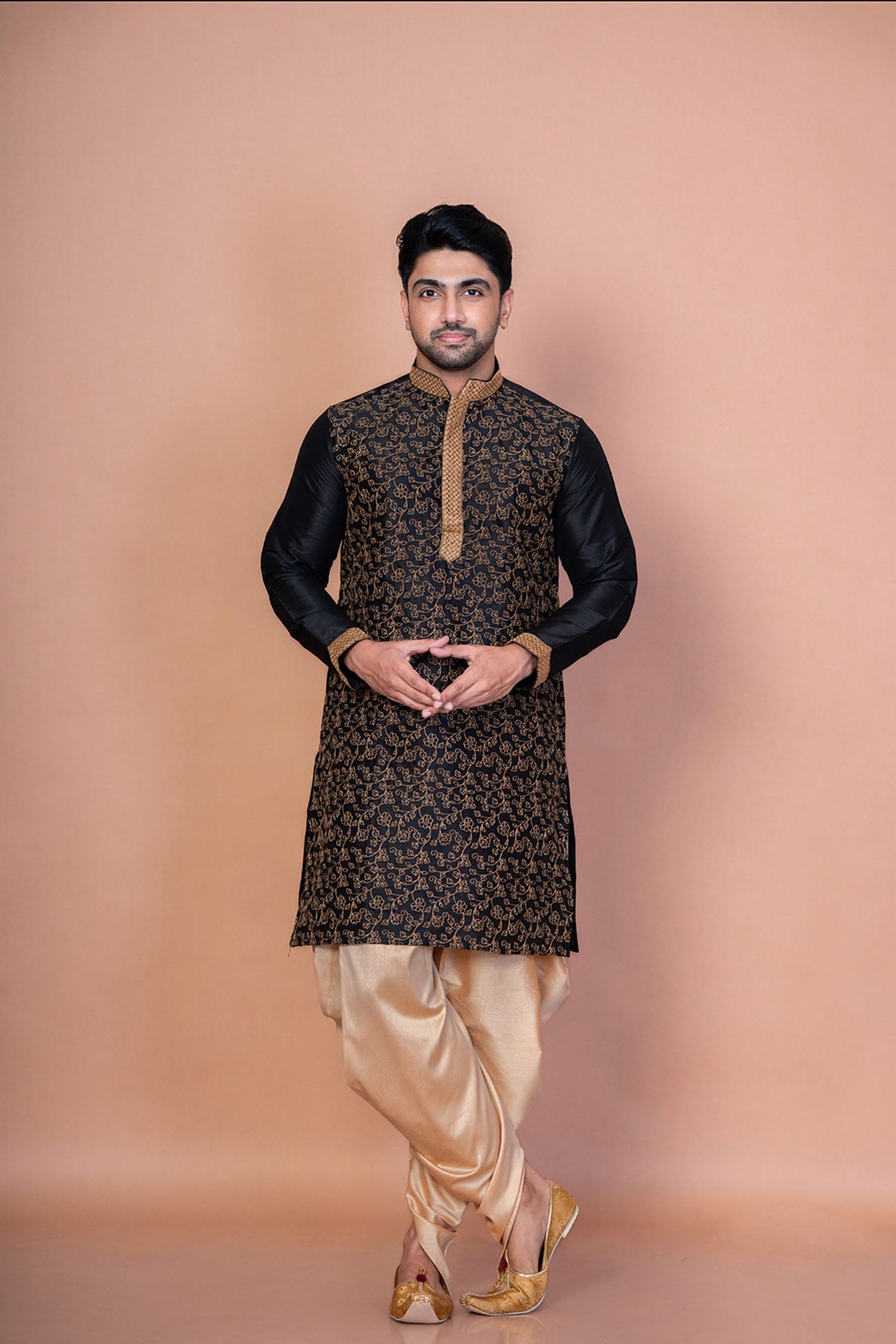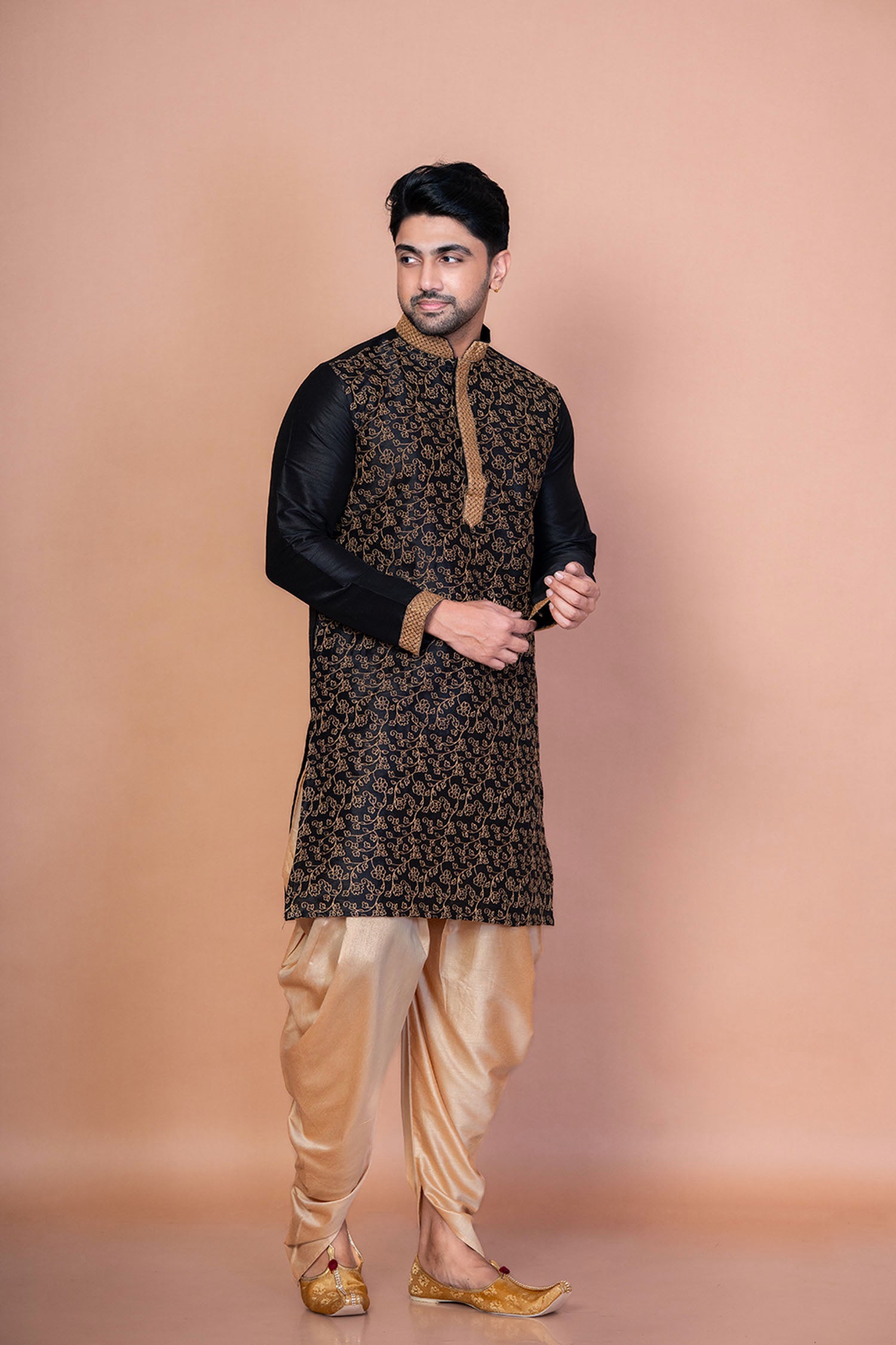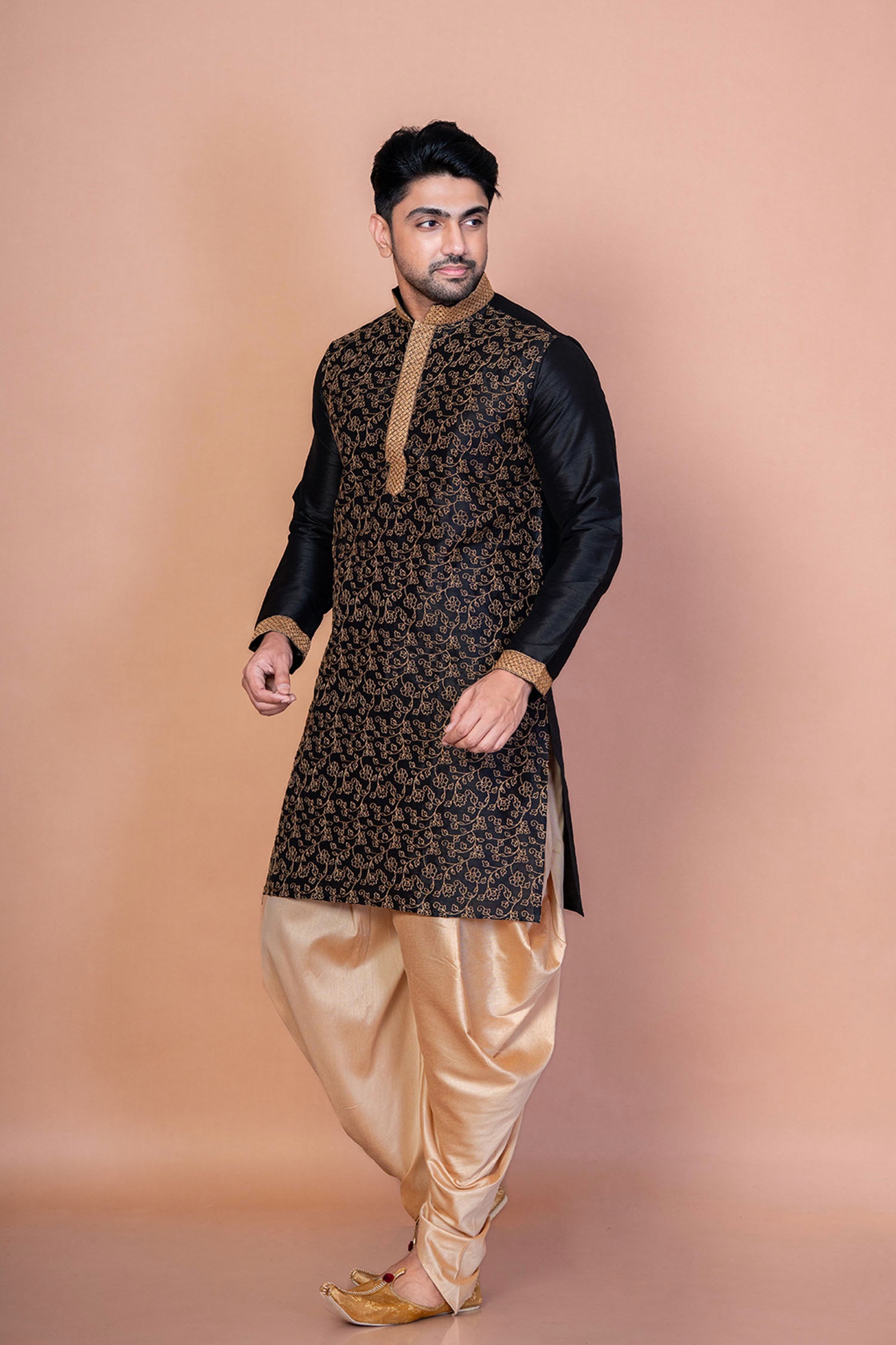 Black embroidered kurta with mandarin neckline and full sleeves complemented with beige patiala pants