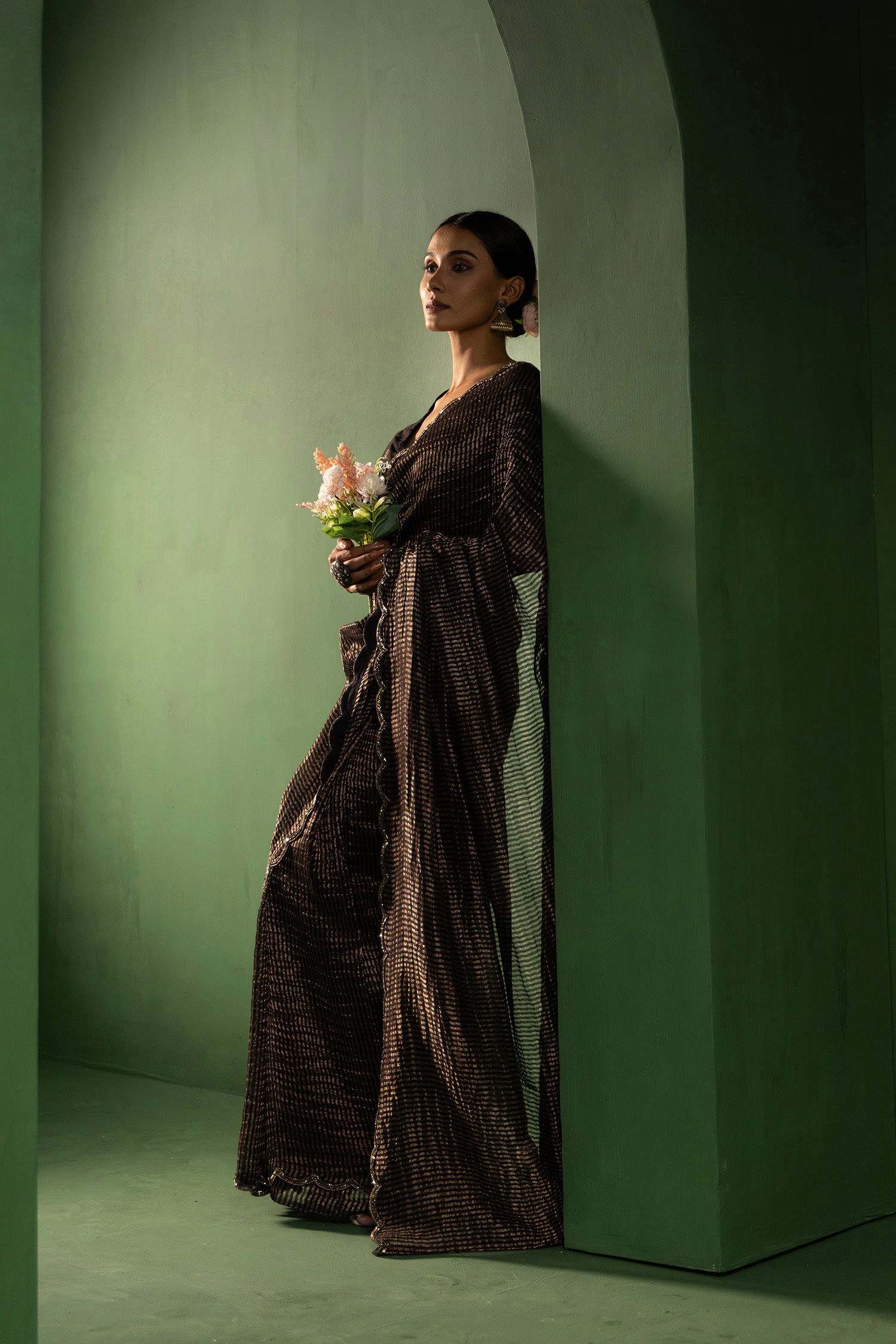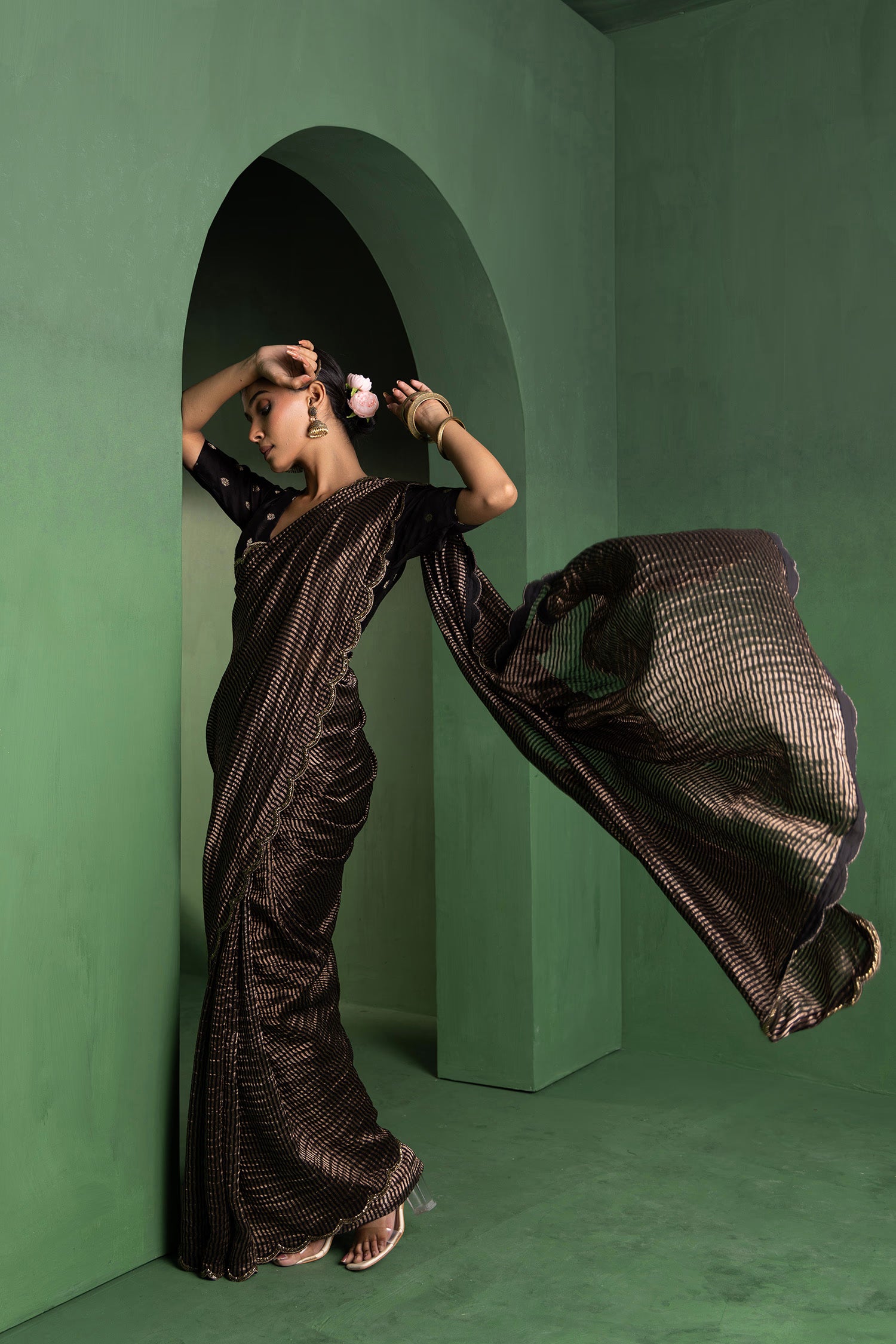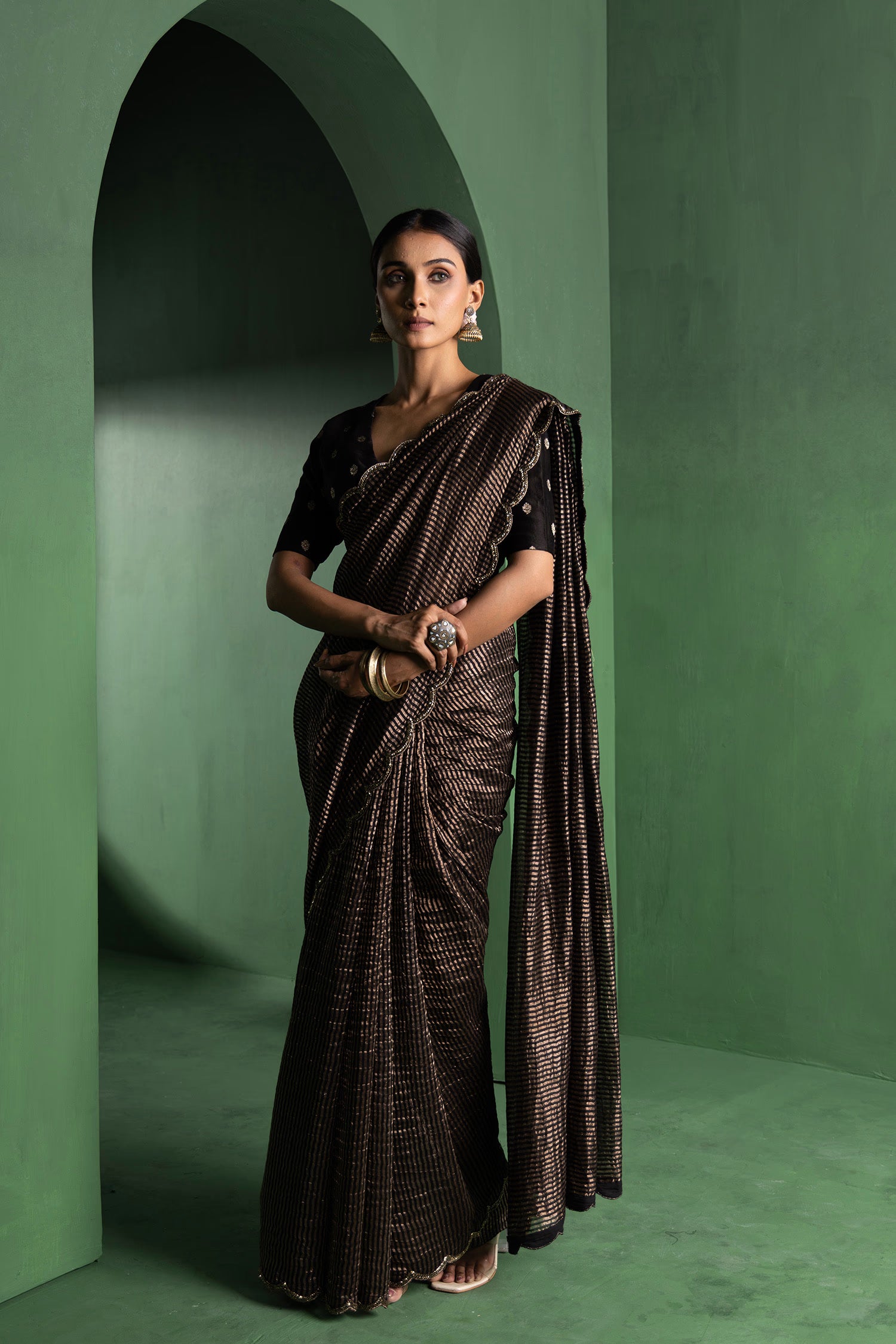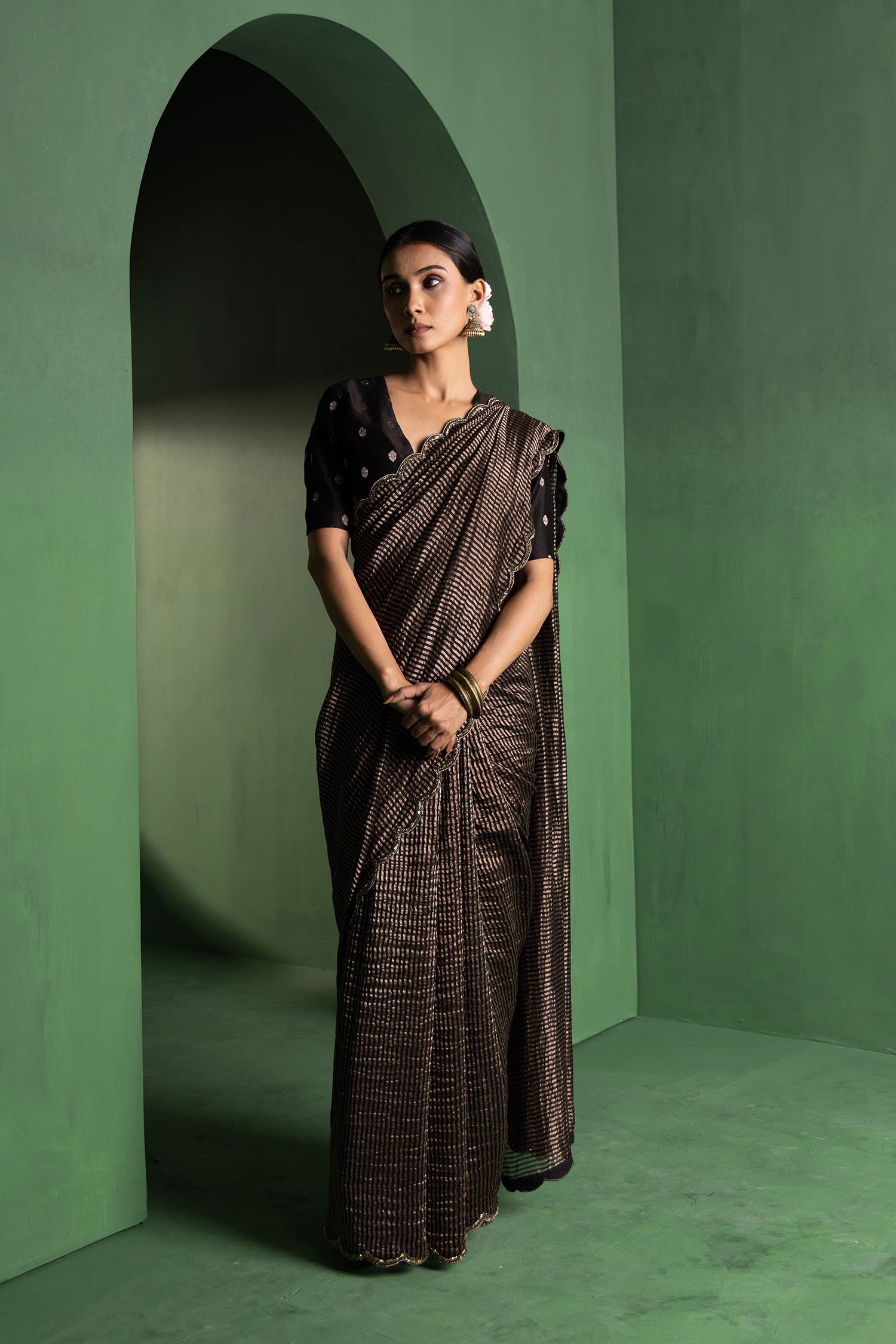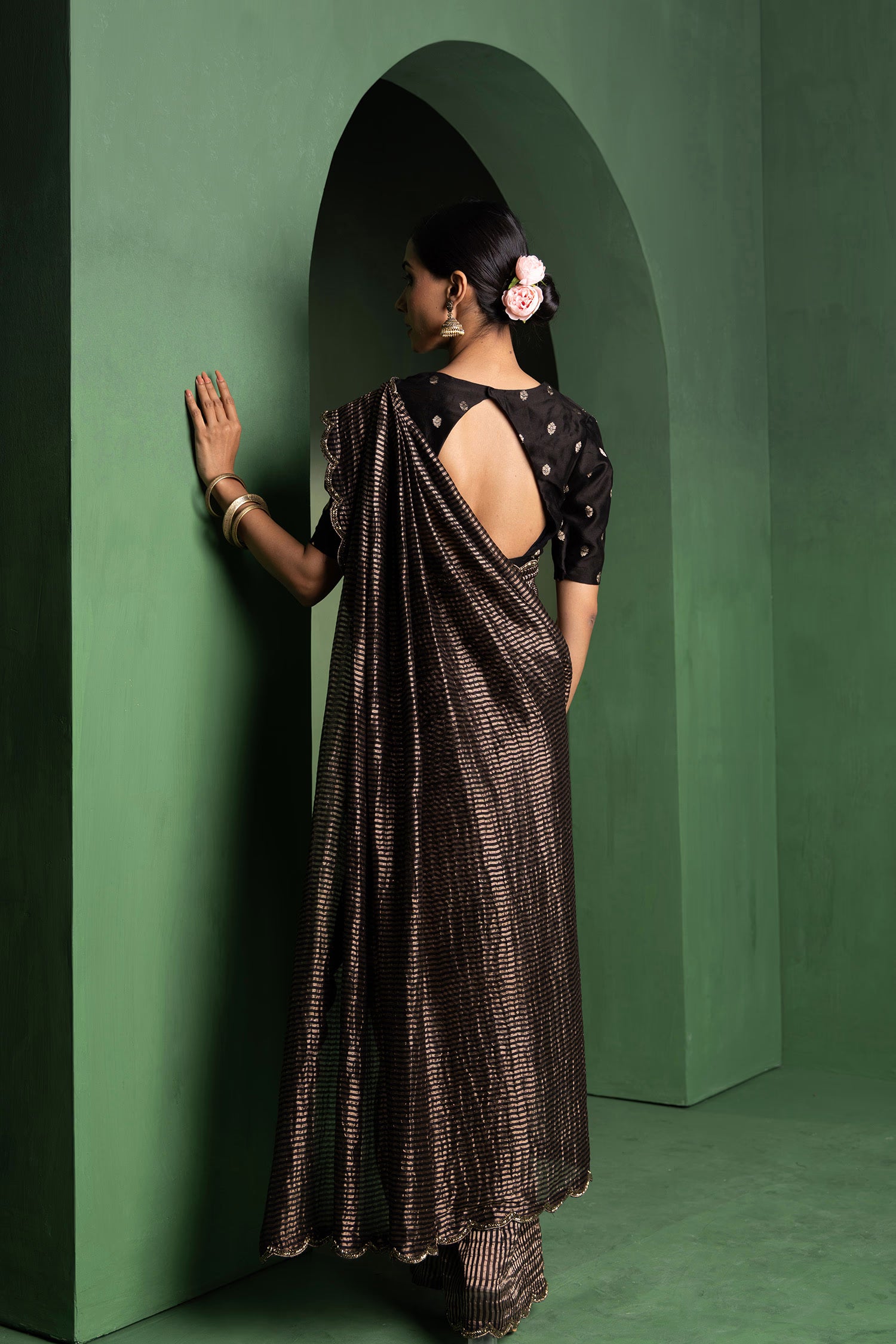 Pair with minimal jewellery and soft makeup to highlight the timeless elegance Singhania’s is known for.