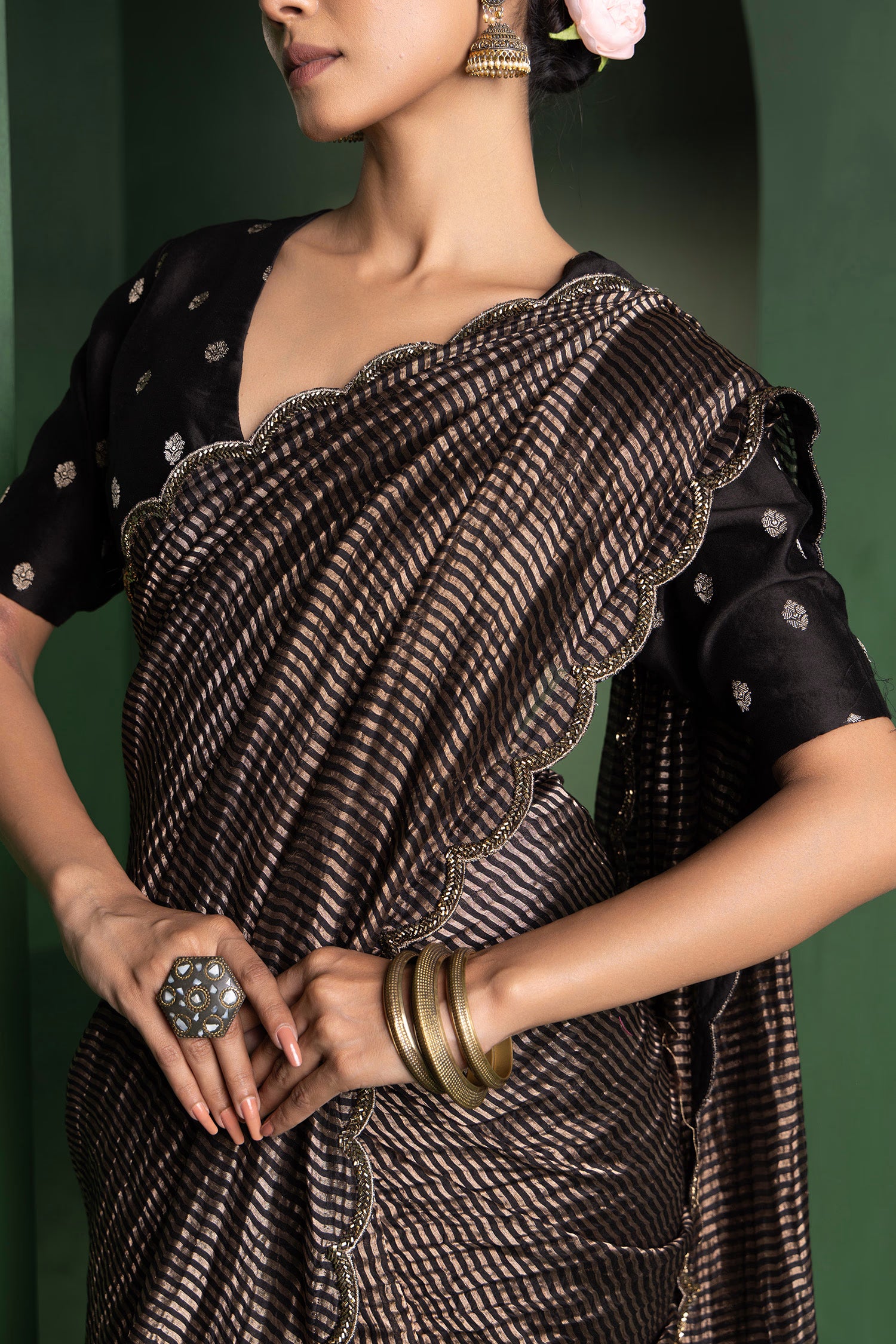The zari stripes on the body of Black chanderi saree with scallop border complemented with chanderi jacquard unstitched blouse making it perfect choice for your special occasions .