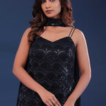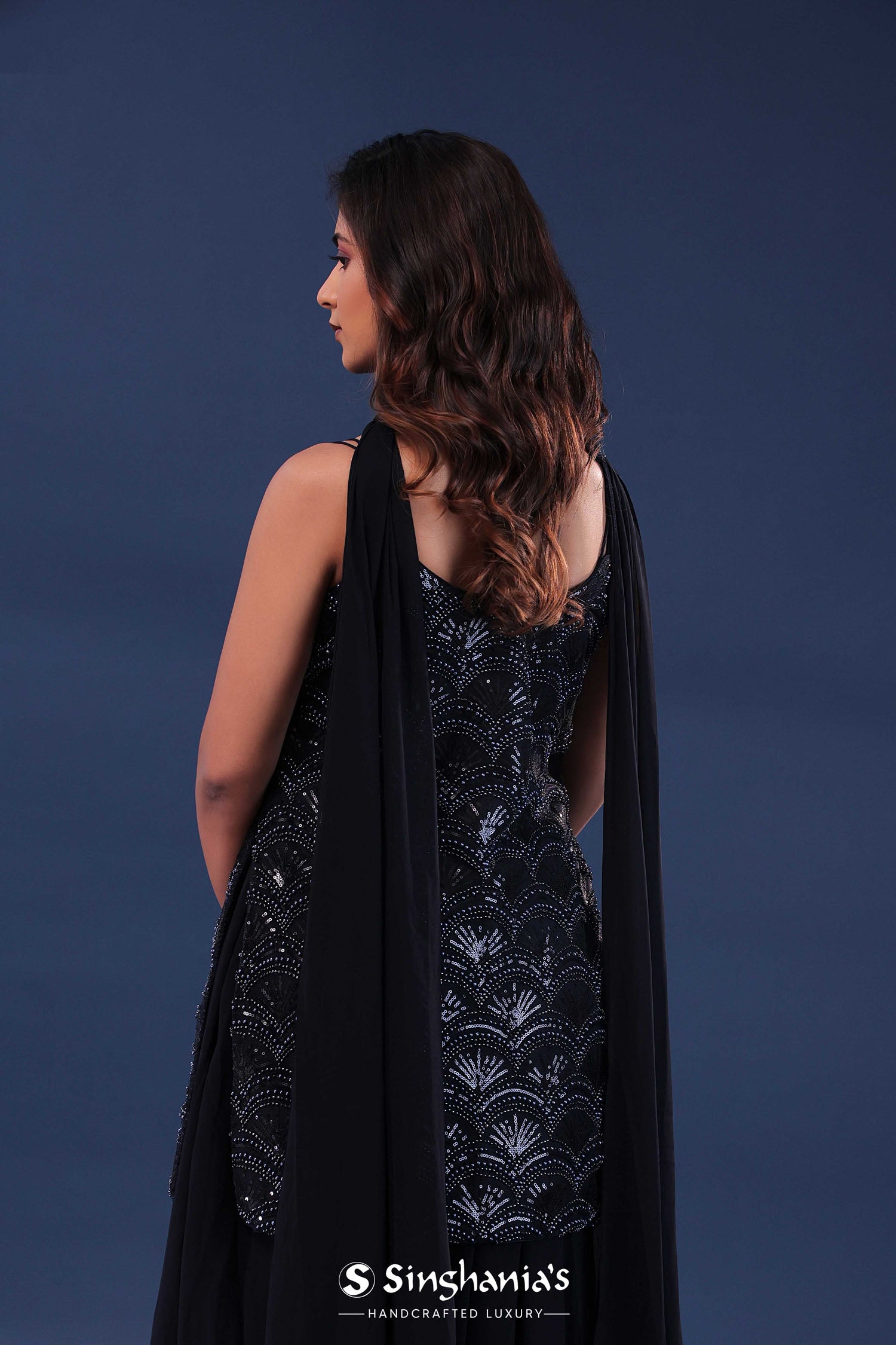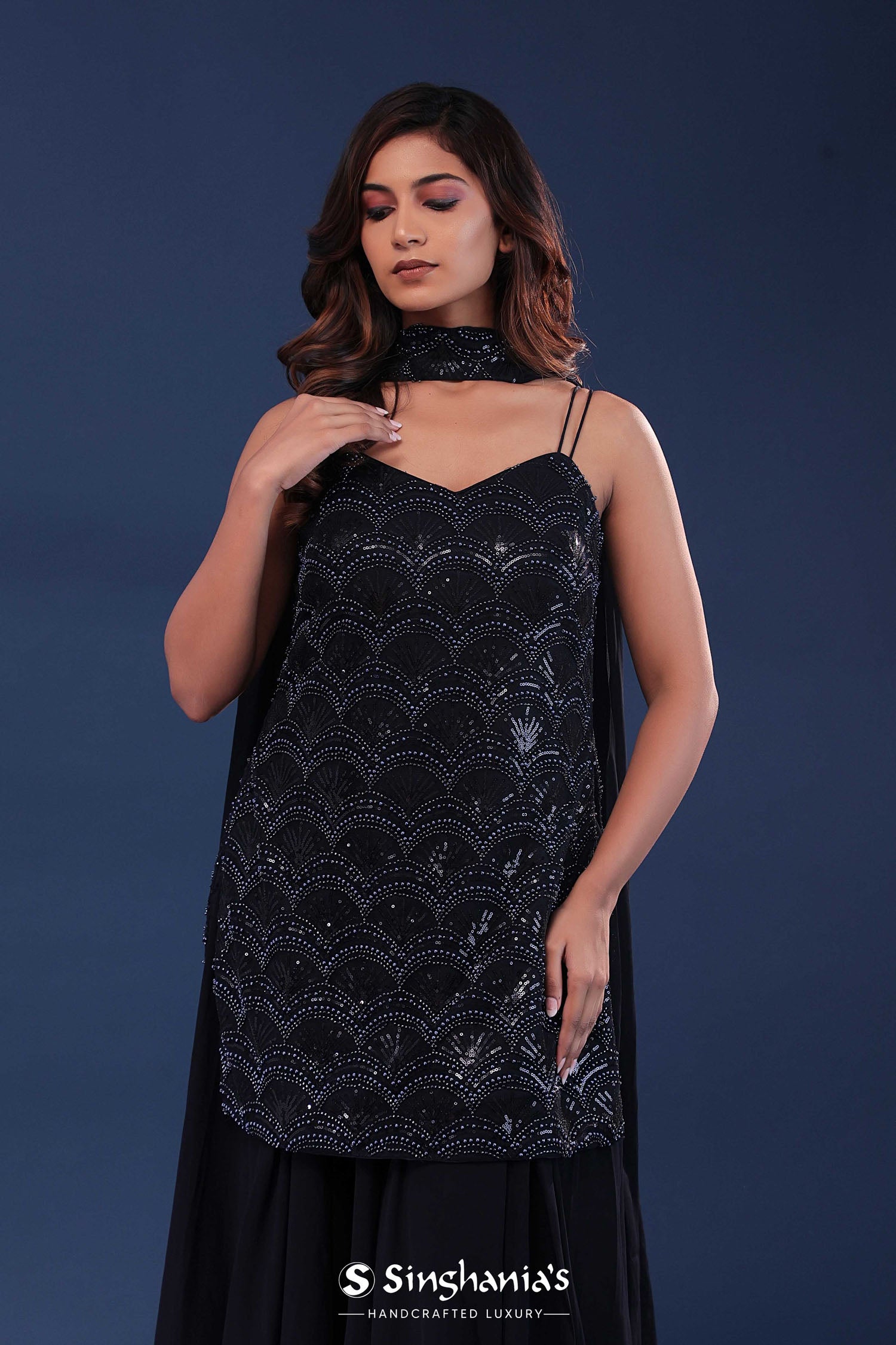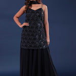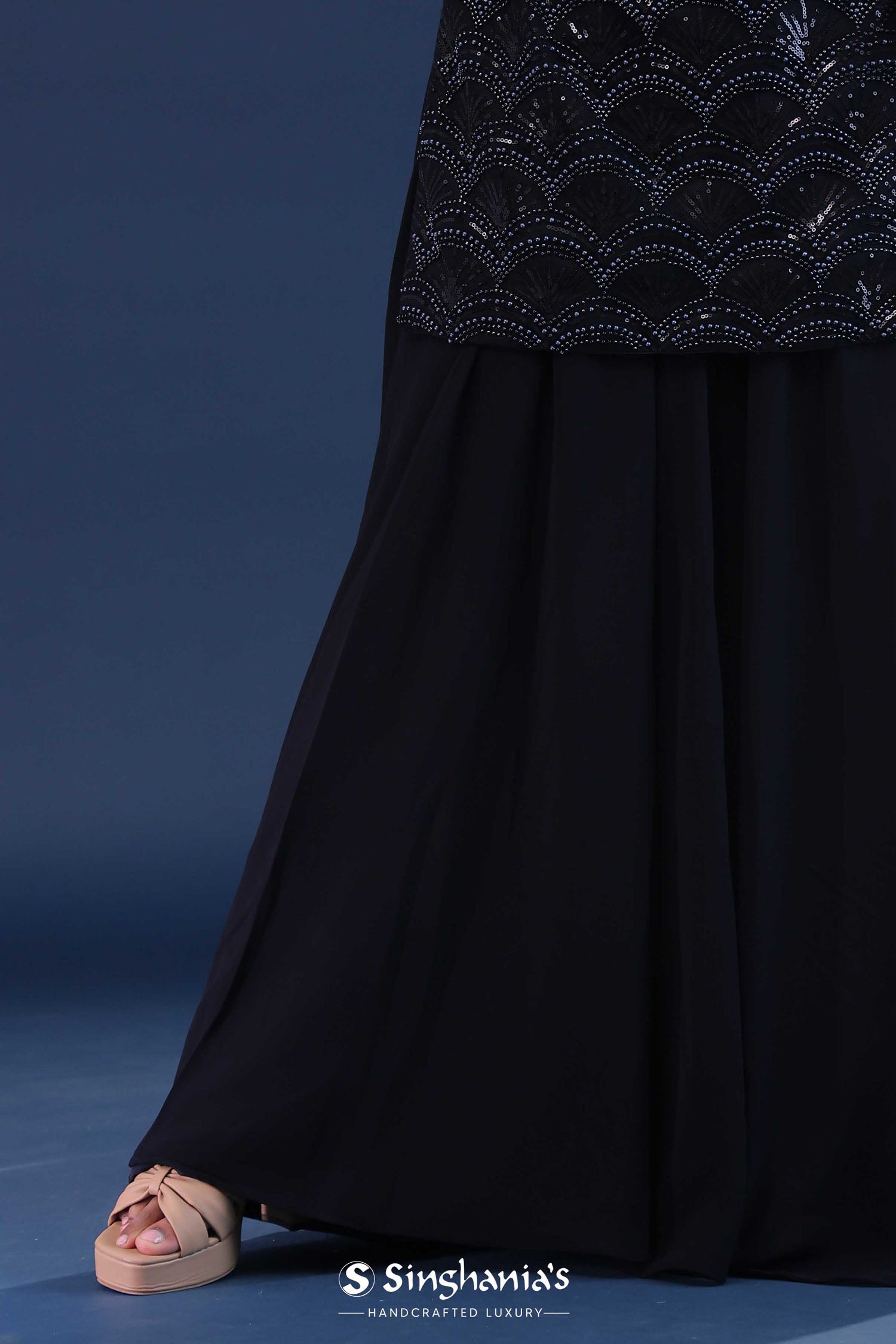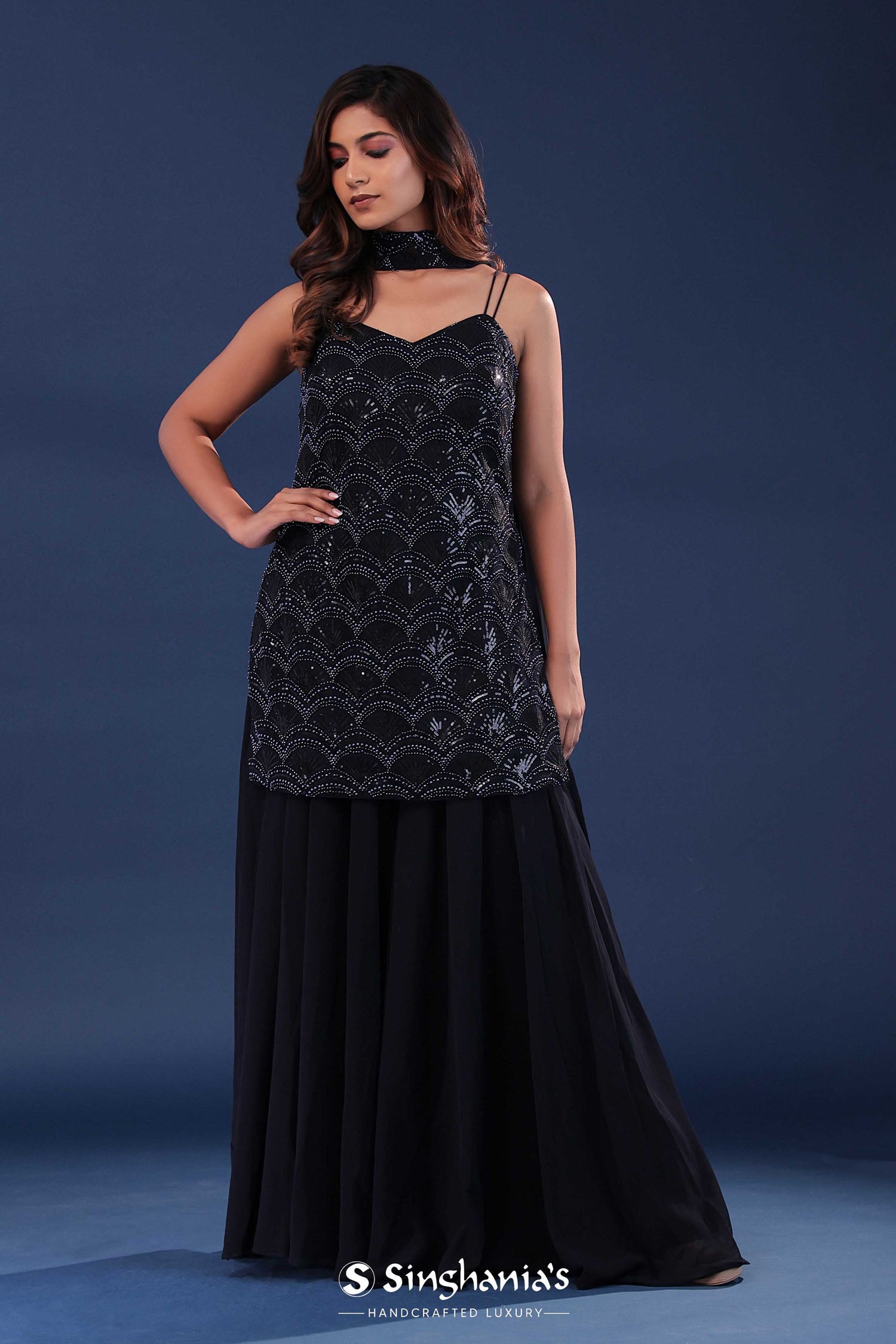Black georgette straight cut palazzo set features sequins work forming a scallop pattern on kurta along with matching plain palazzo pants. The plain dupatta adds the finishing touch to the entire garments