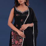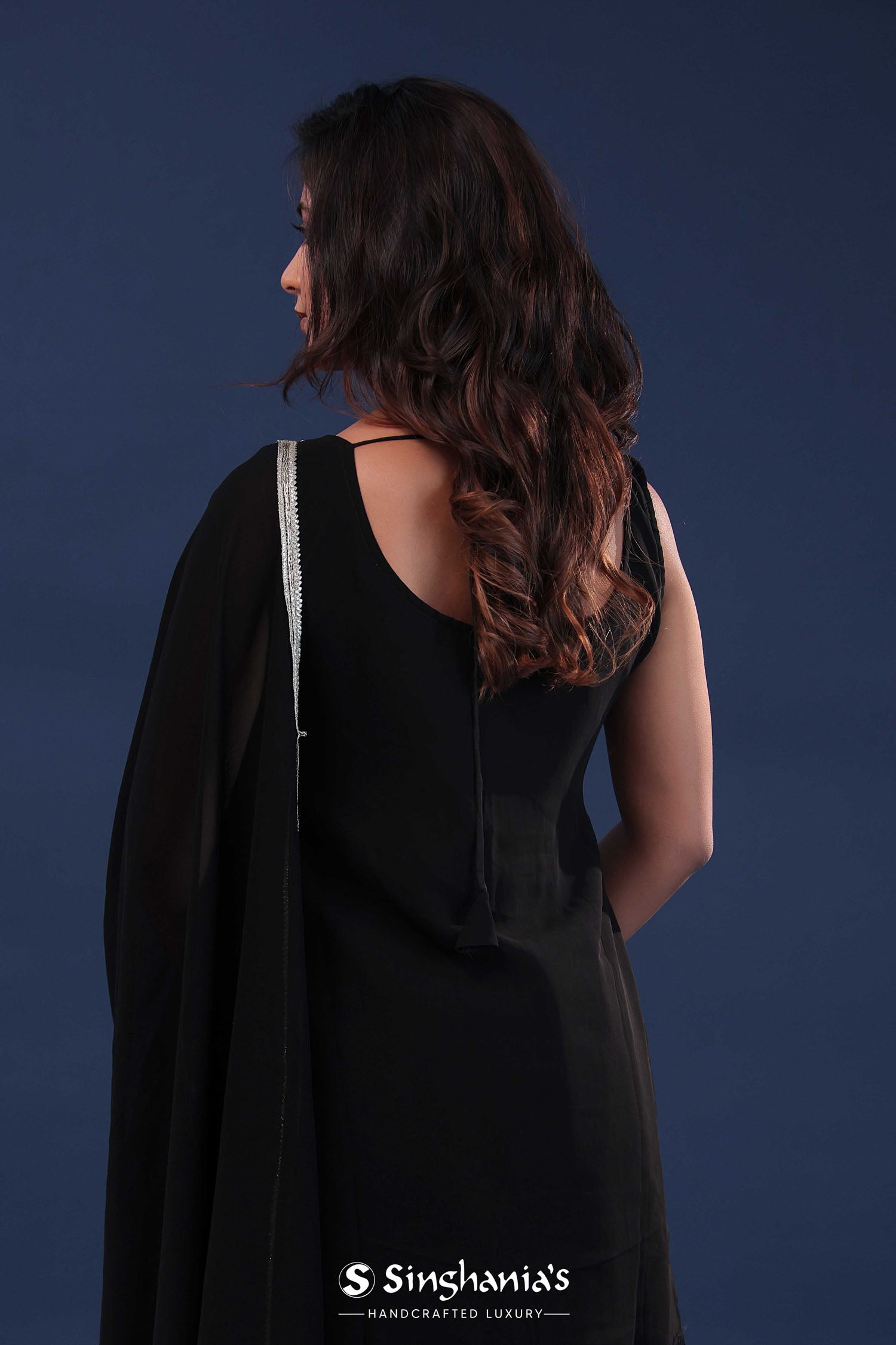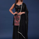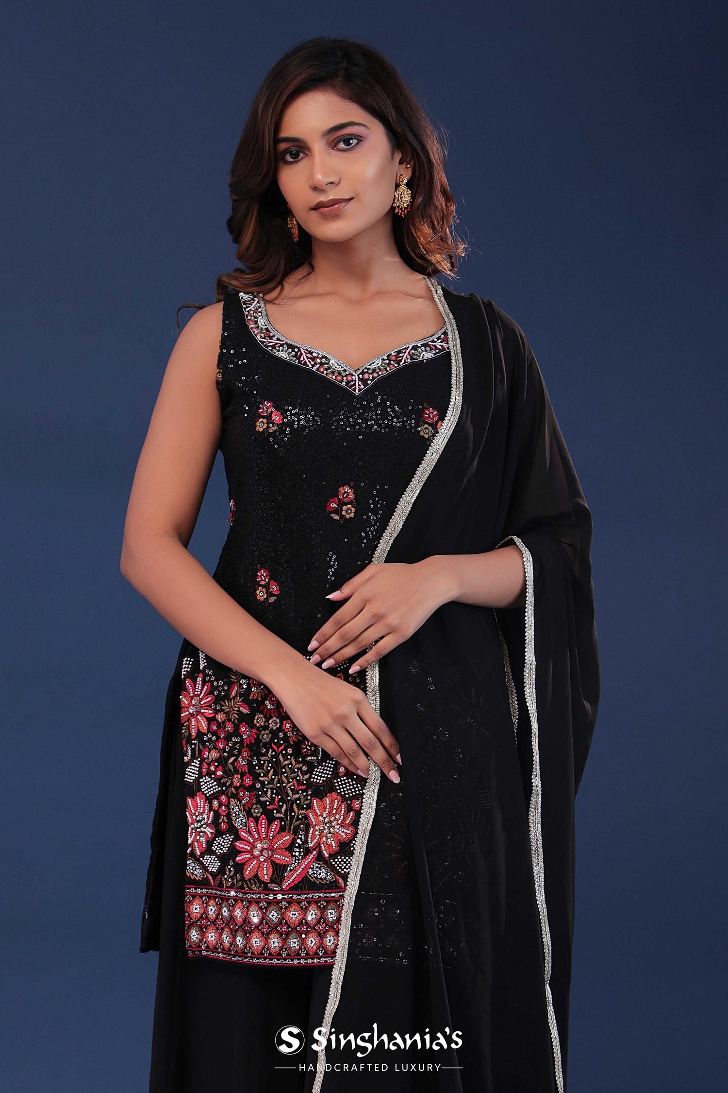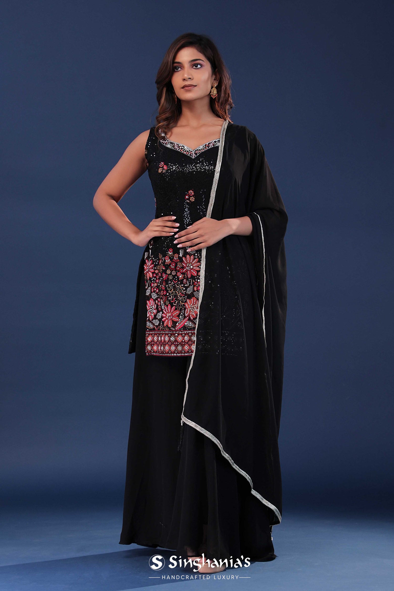Black georgette straight cut palazzo set features sequins, embroidery and beads work on kurta along with matching plain palazzo pants. The plain dupatta adds the finishing touch to the entire garments