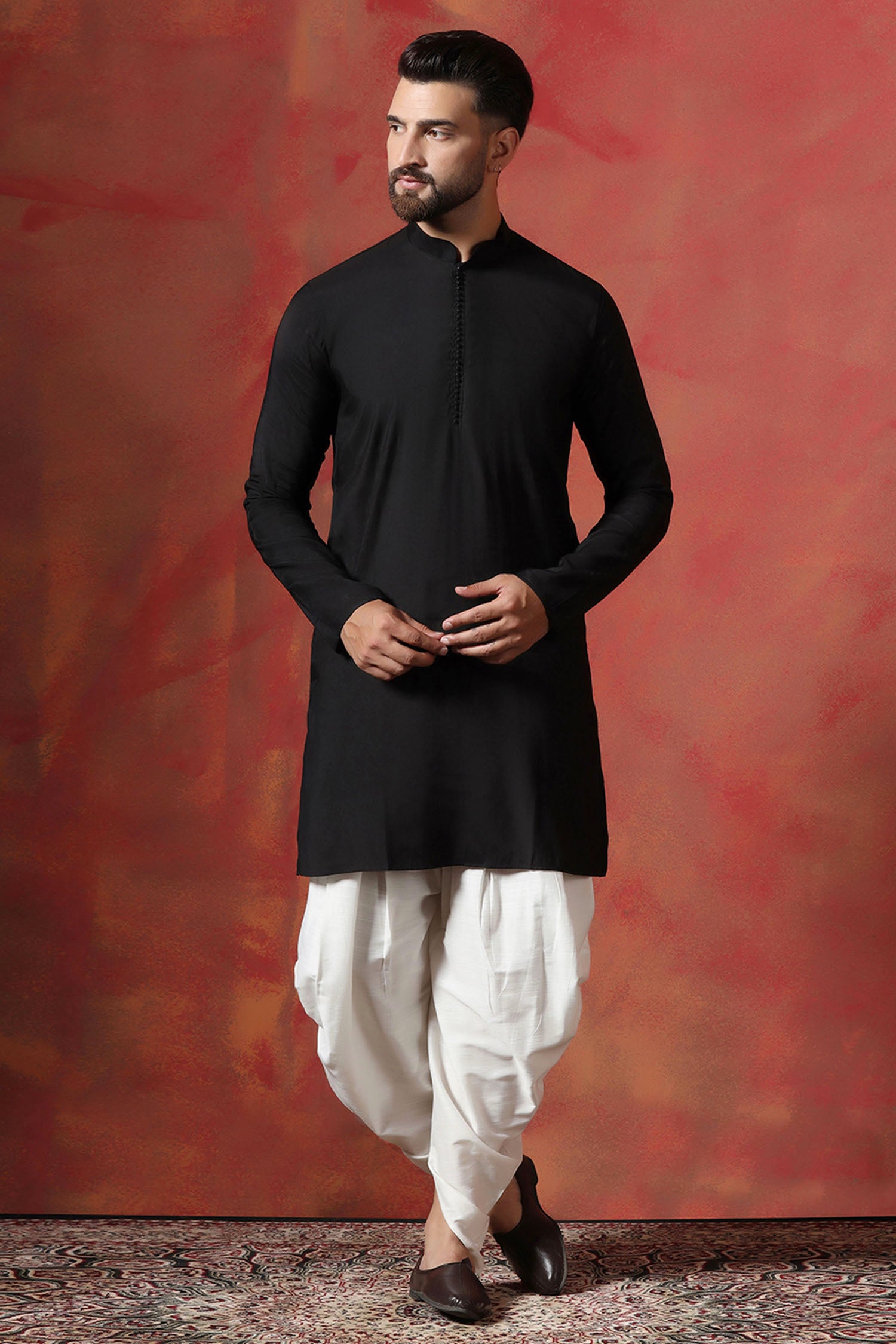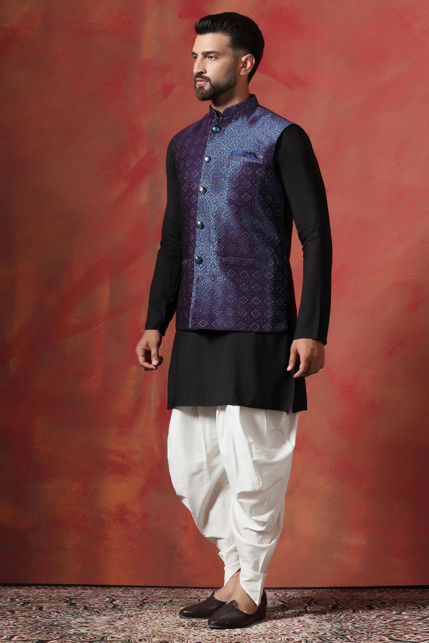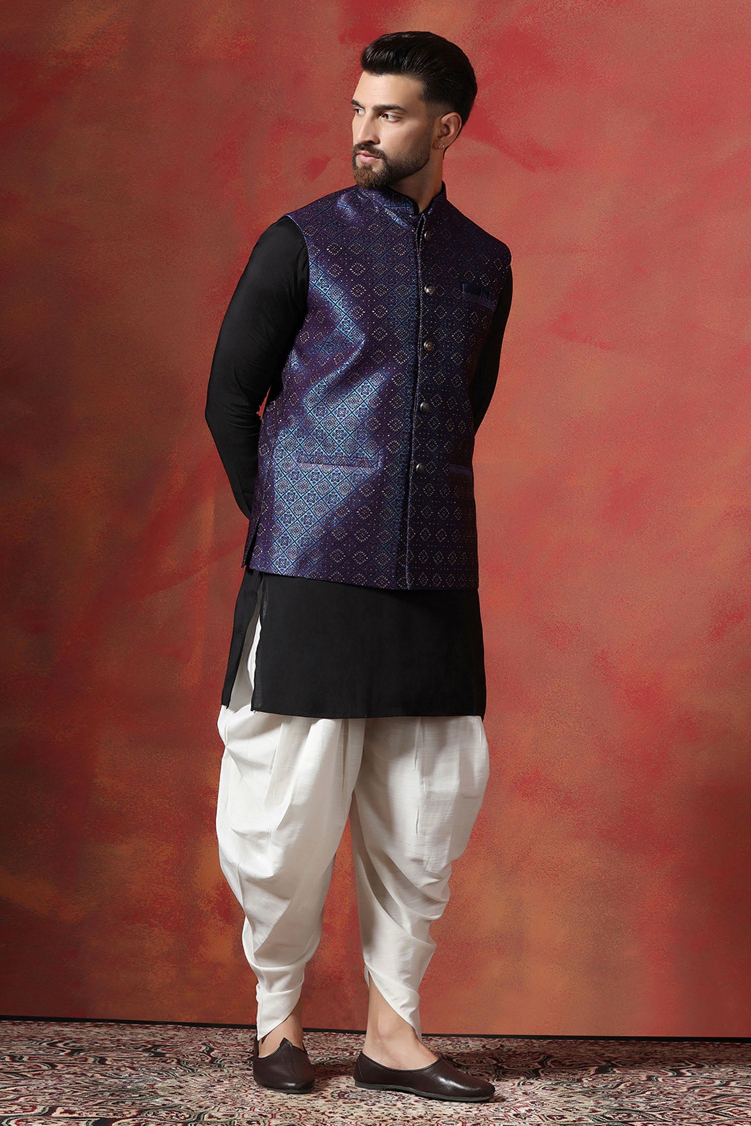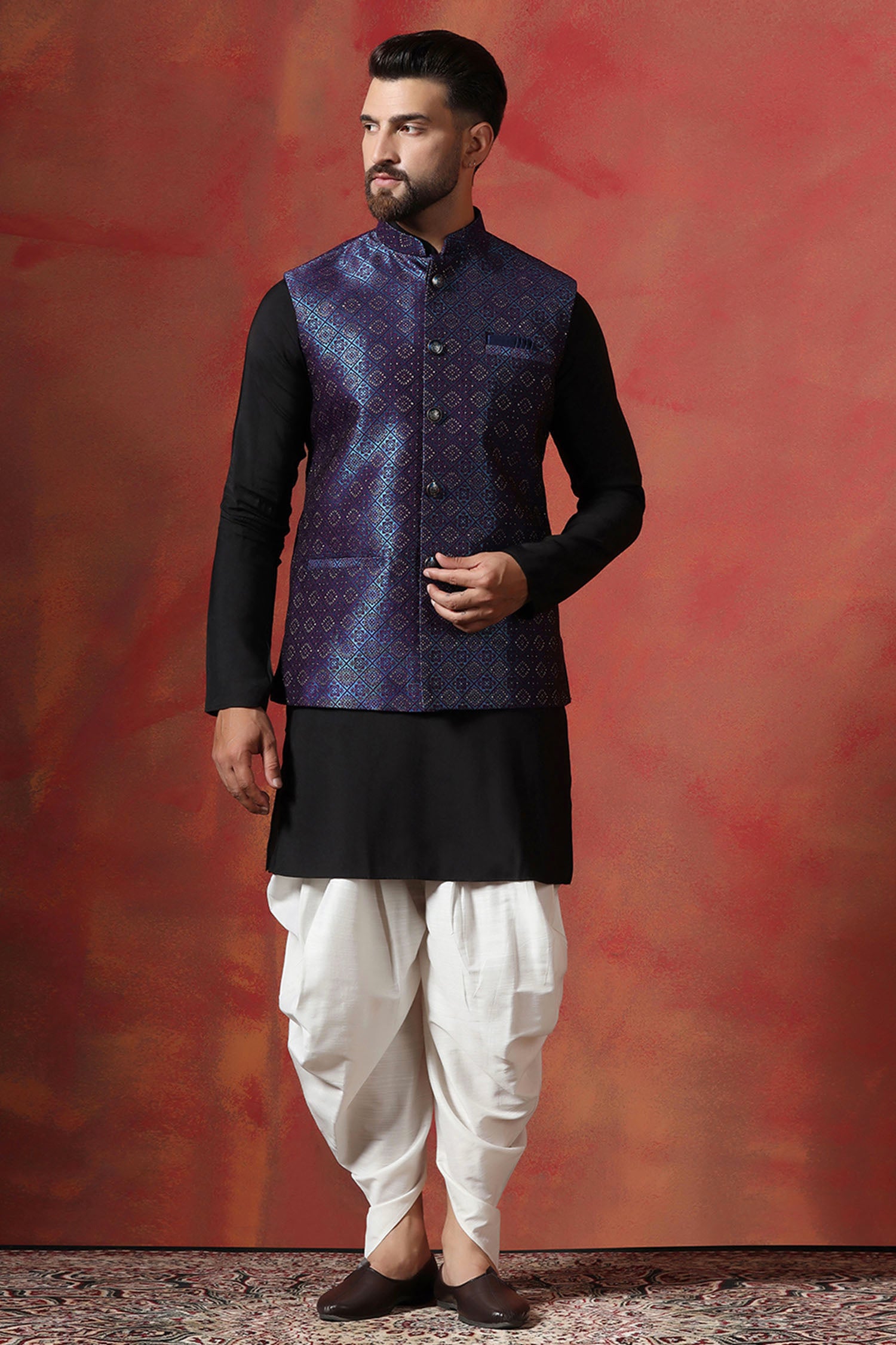 This black kurta complemented with indigo blue nehru jacket features mandarin neckline and sleeveless accompanied with white dhoti pant look rich and elegant to pair with any outfit