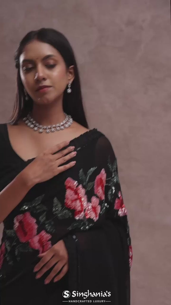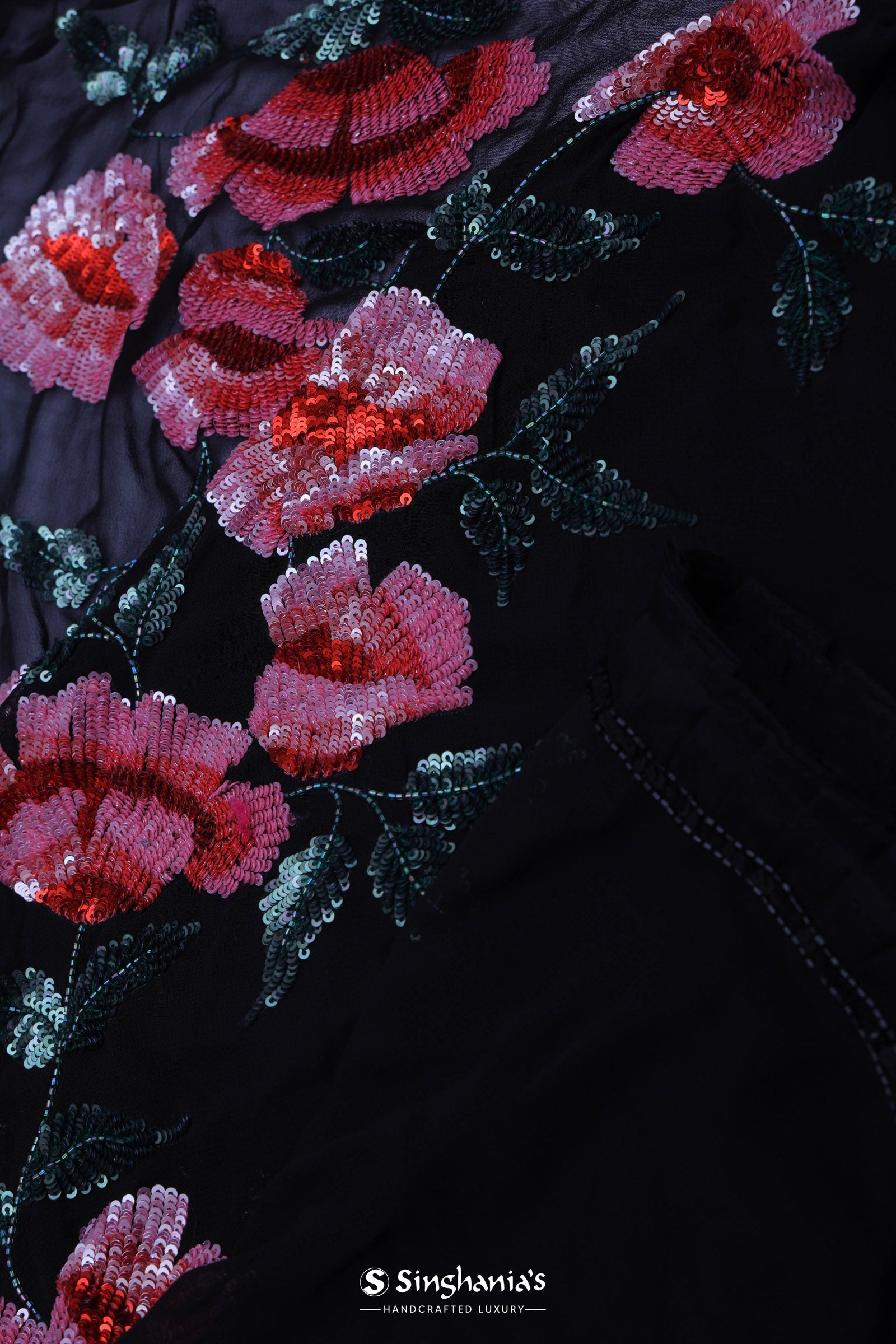 This black organza embroidery saree presents delicate sequins work along the upper border in shades of silver, red, and pink, adding a modern, shimmering touch. The rest of the saree is beautifully embroidered, making it a perfect choice for sophisticated events or evening occasions