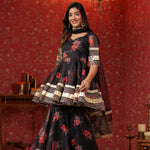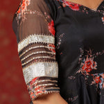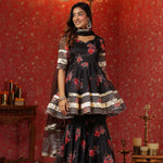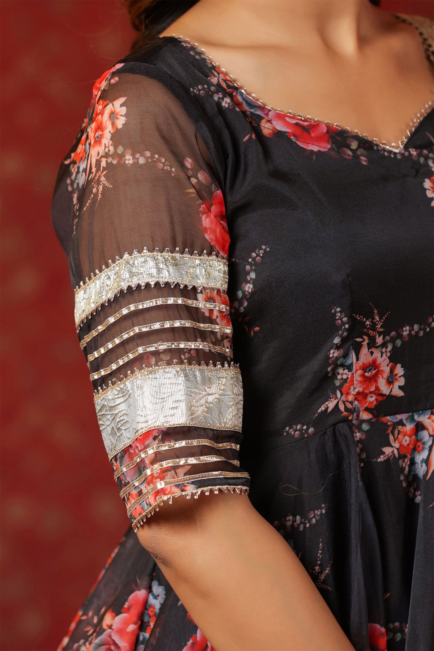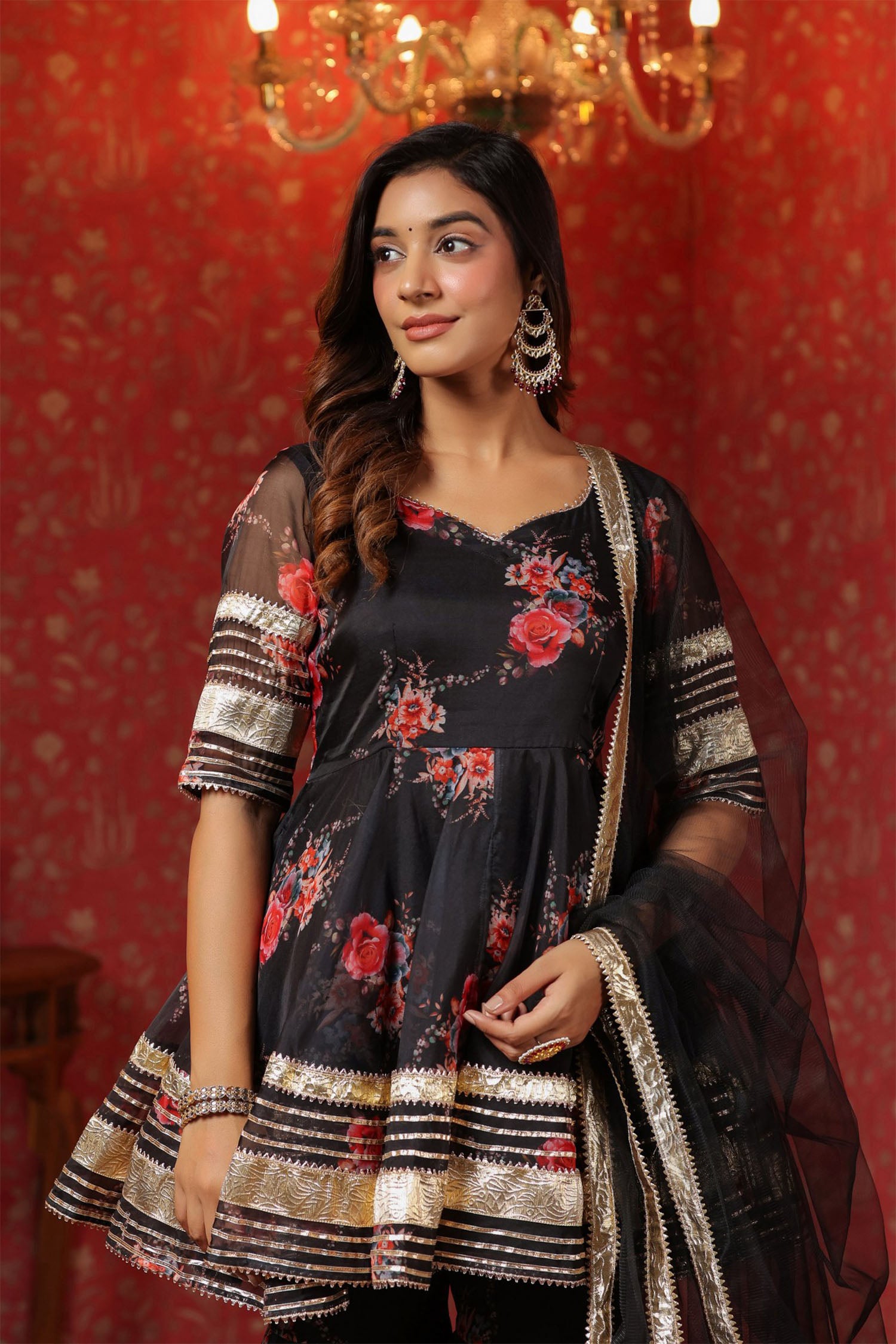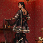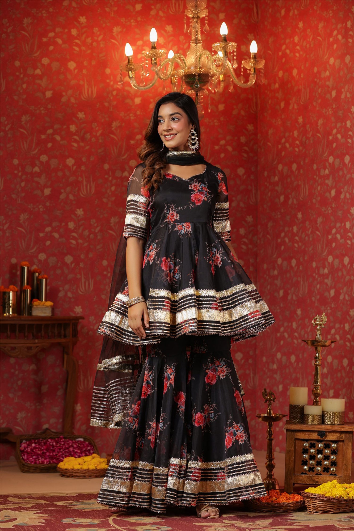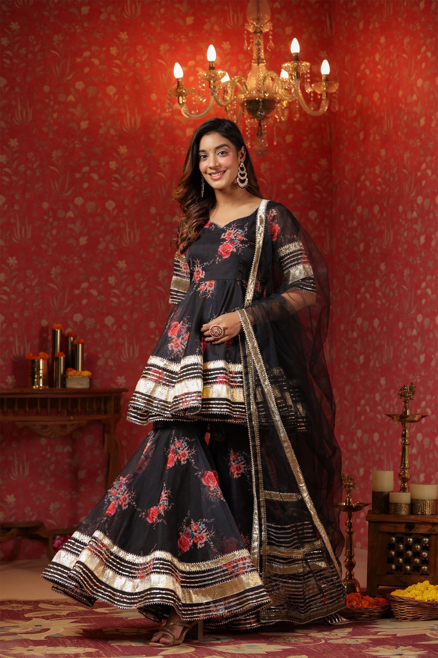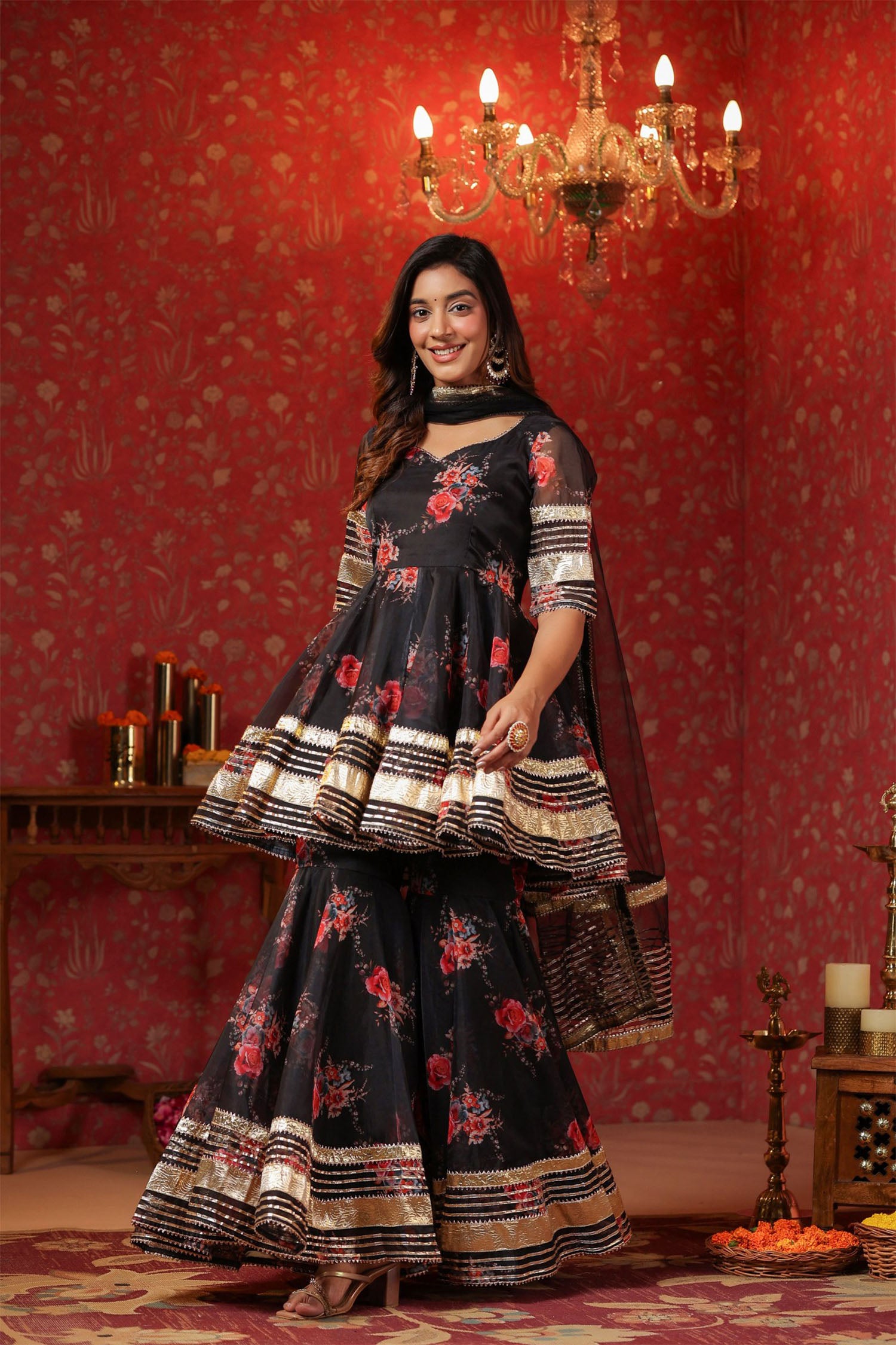The black organza floral printed gharara set with netted dupatta for a stylish and charming look.