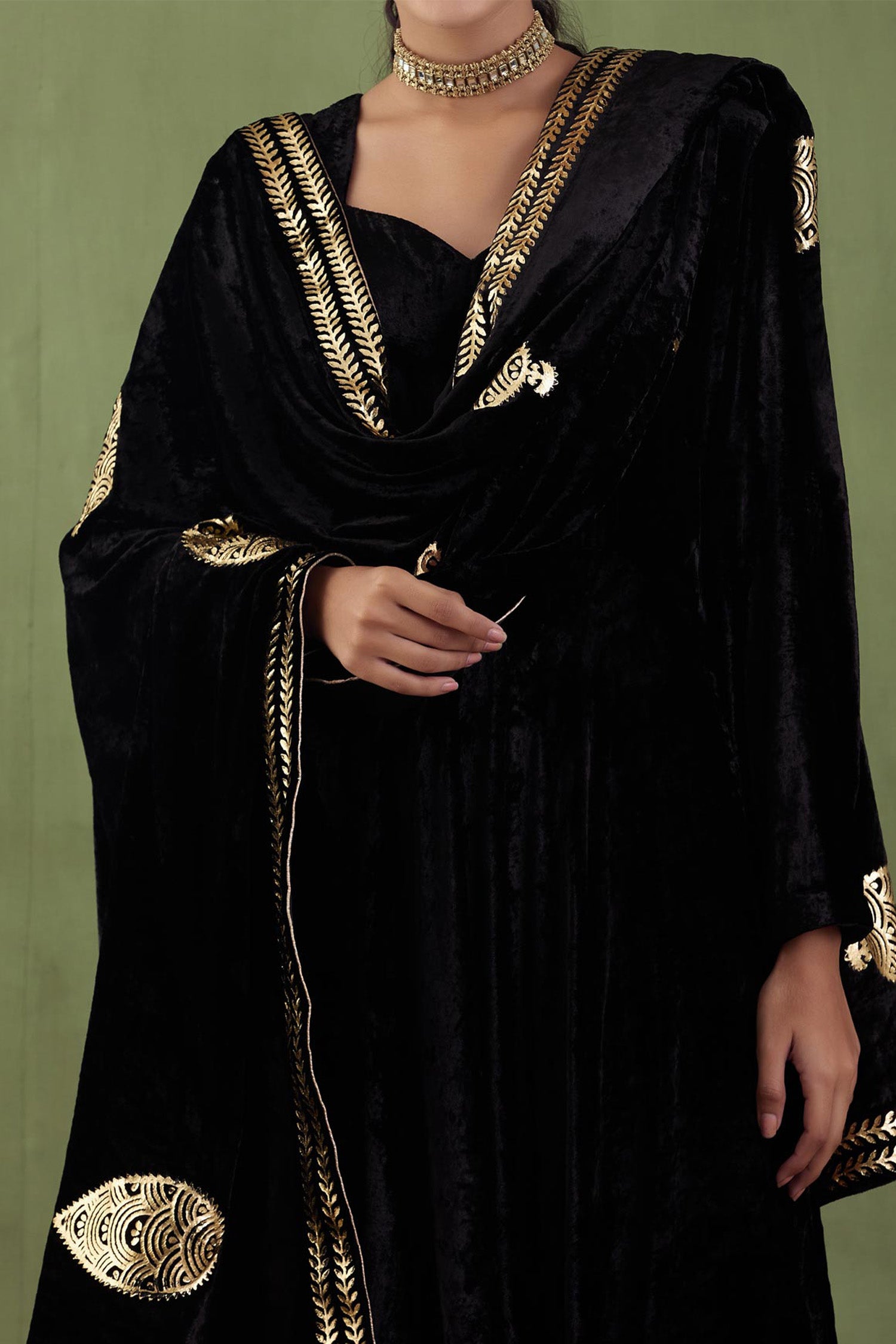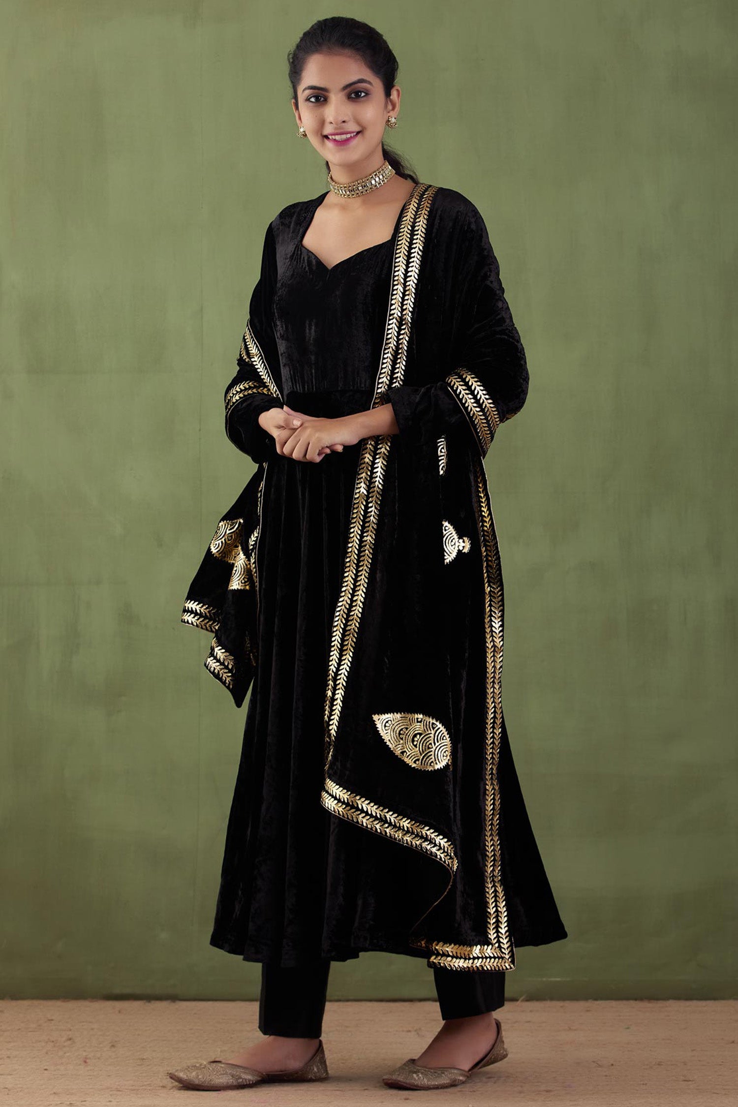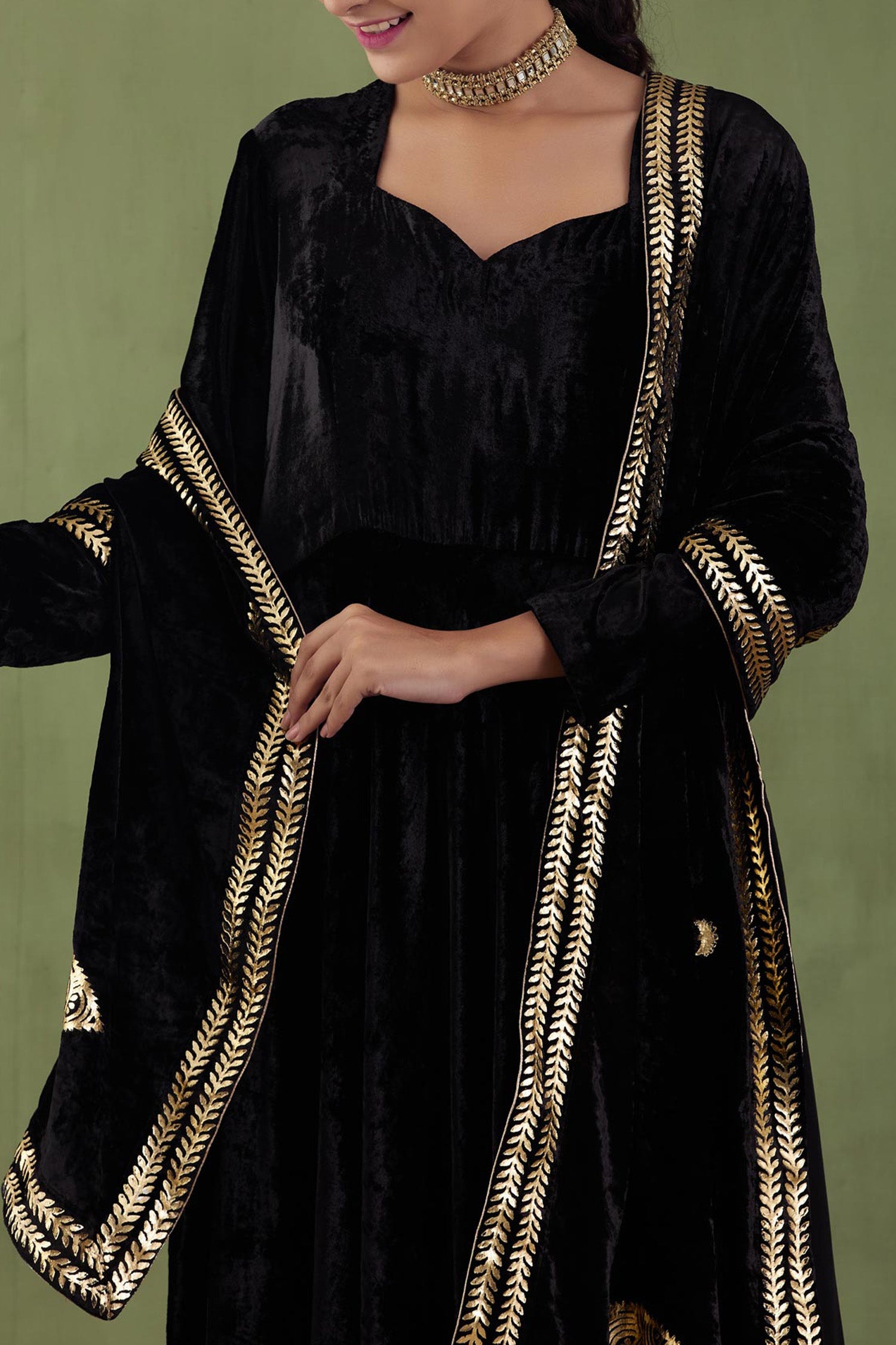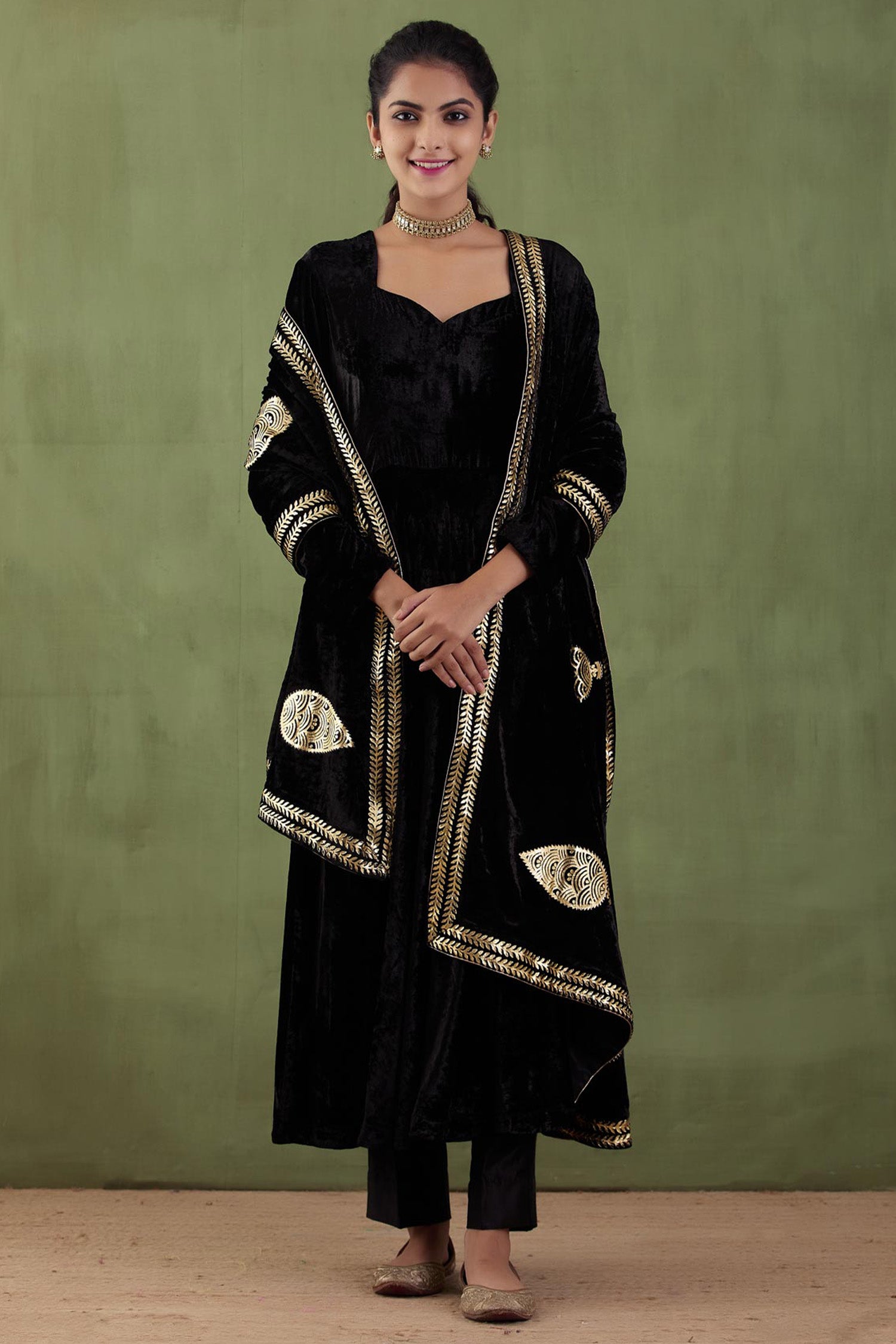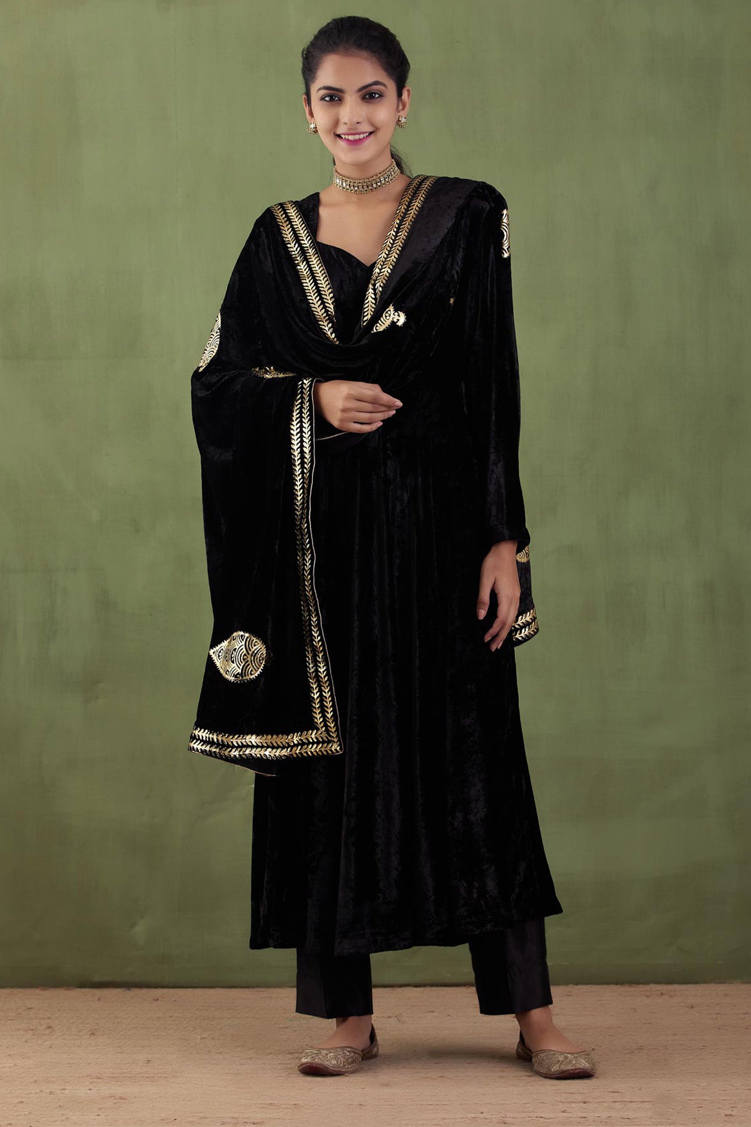 The black velvet straight zardosi work kurta and plain pant With gotta work for a rich and elegant look.