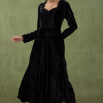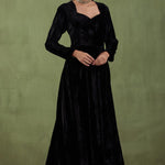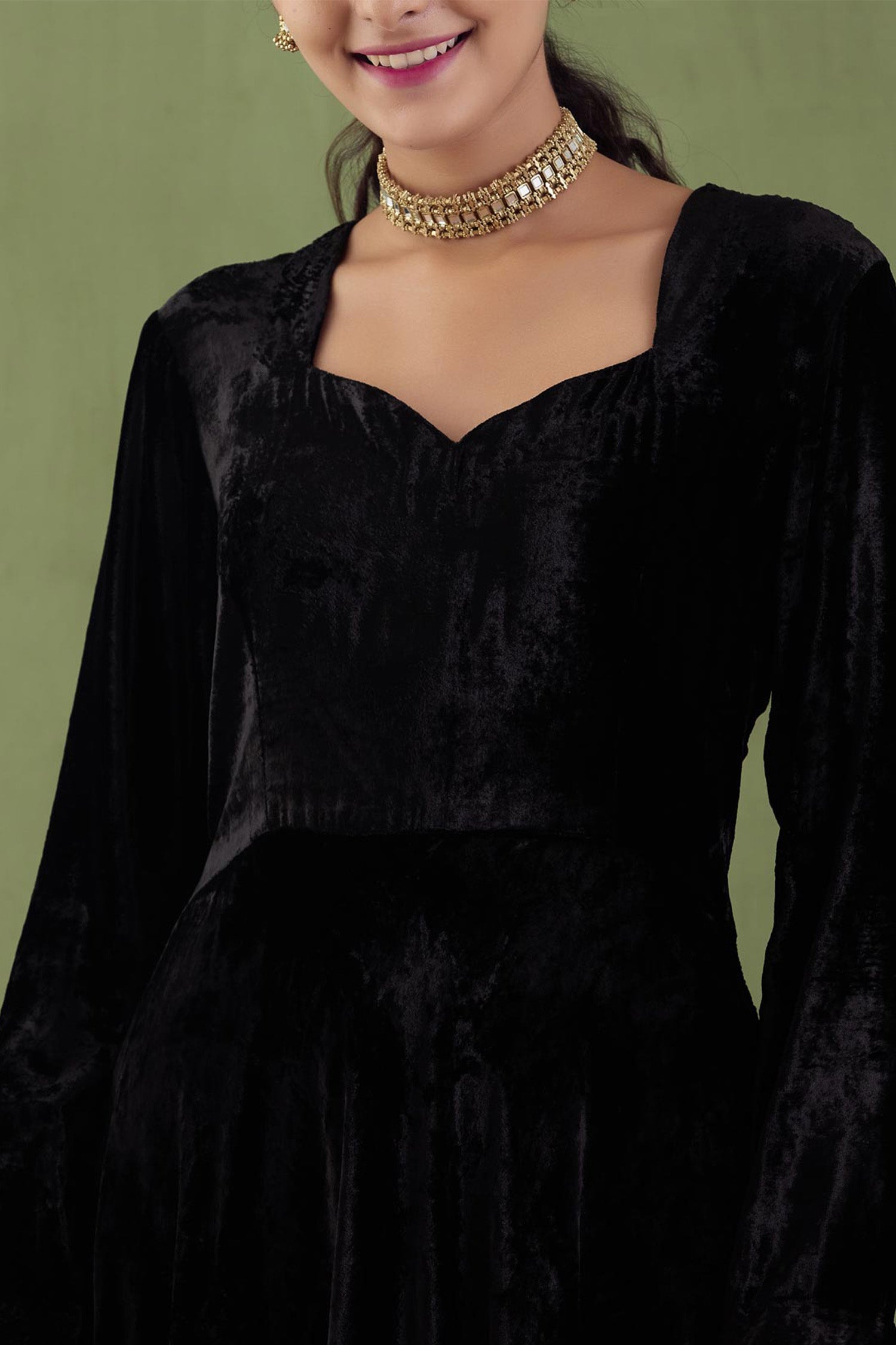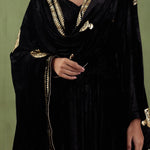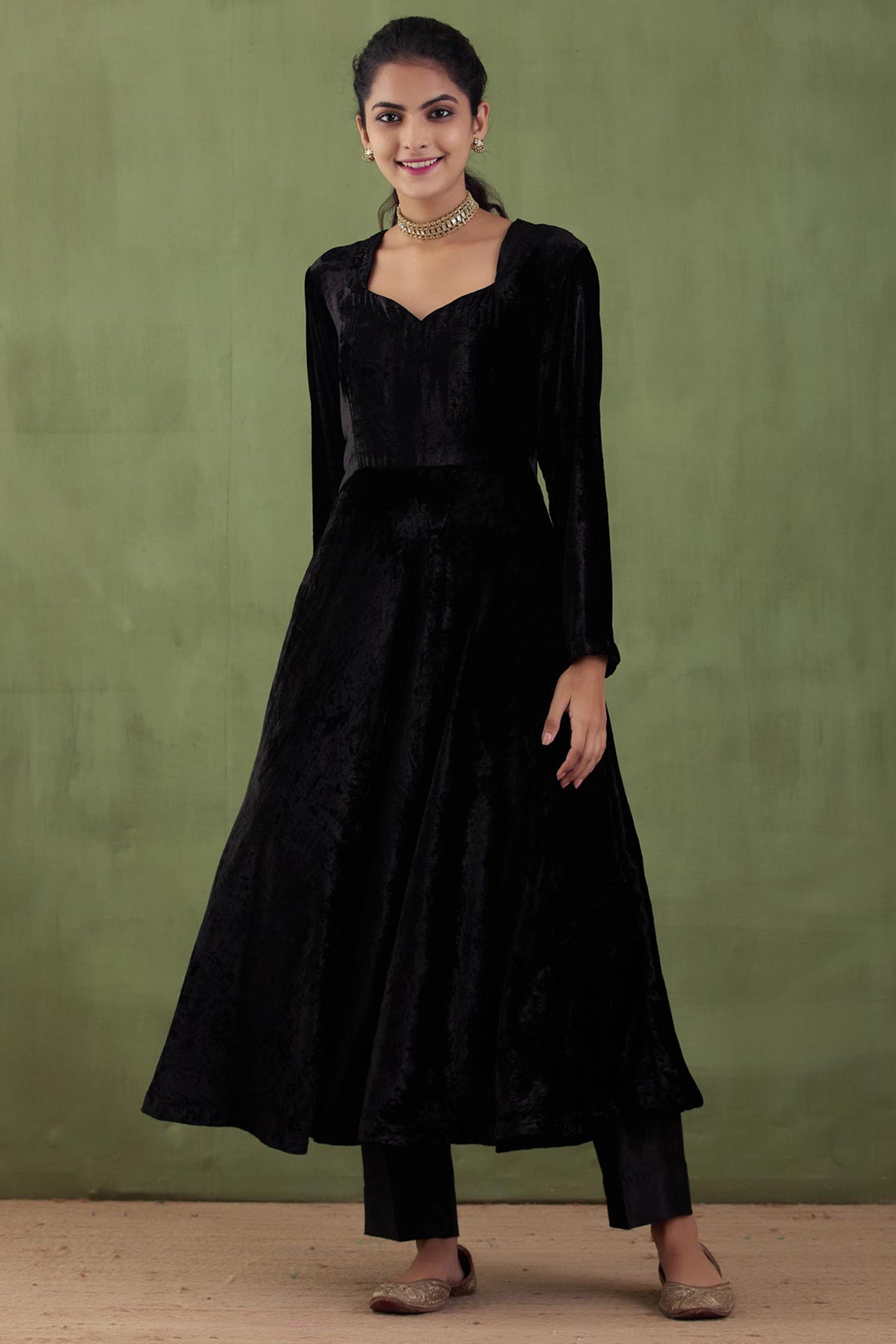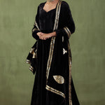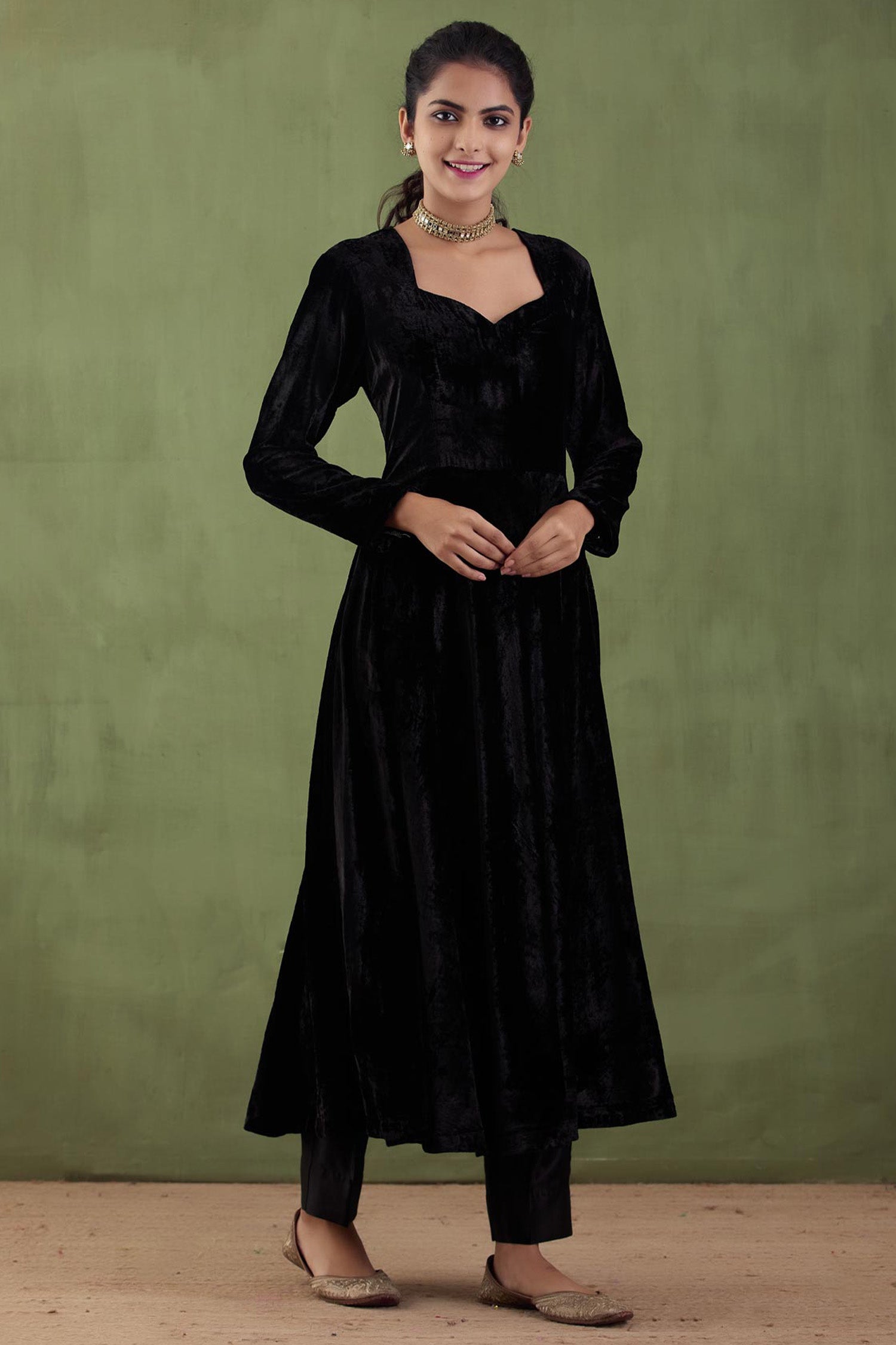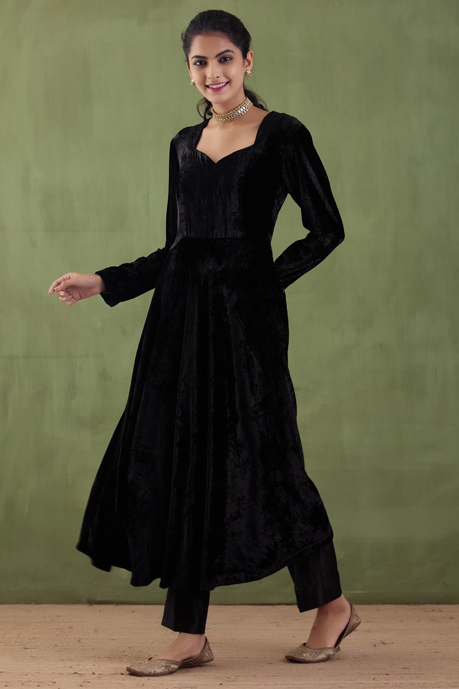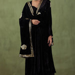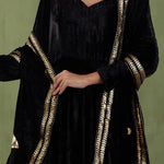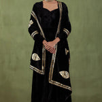 The black velvet straight zardosi work kurta and plain pant With gotta work for a rich and elegant look.