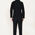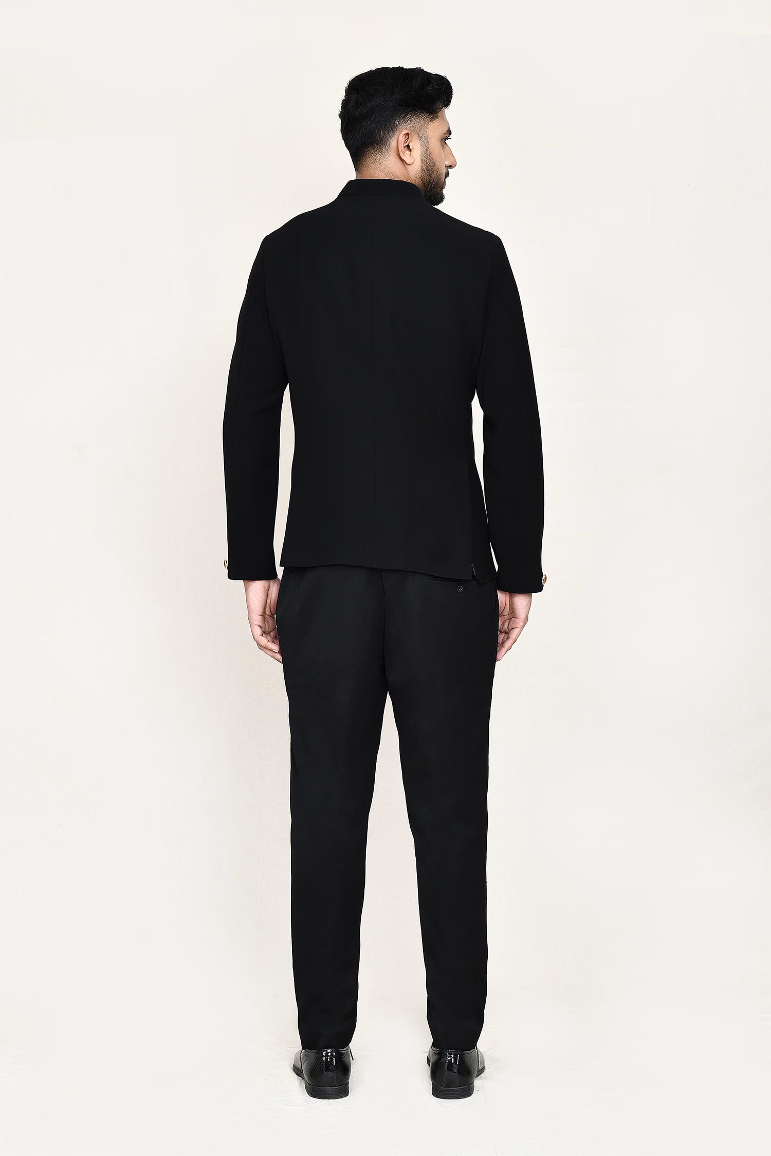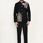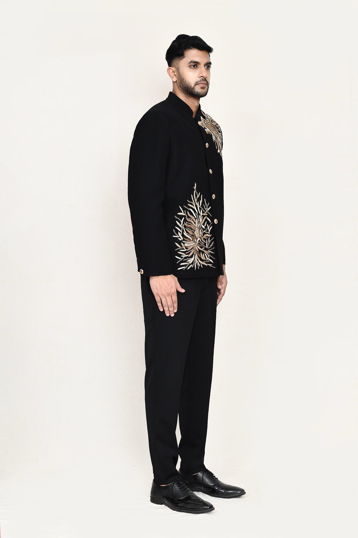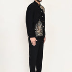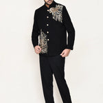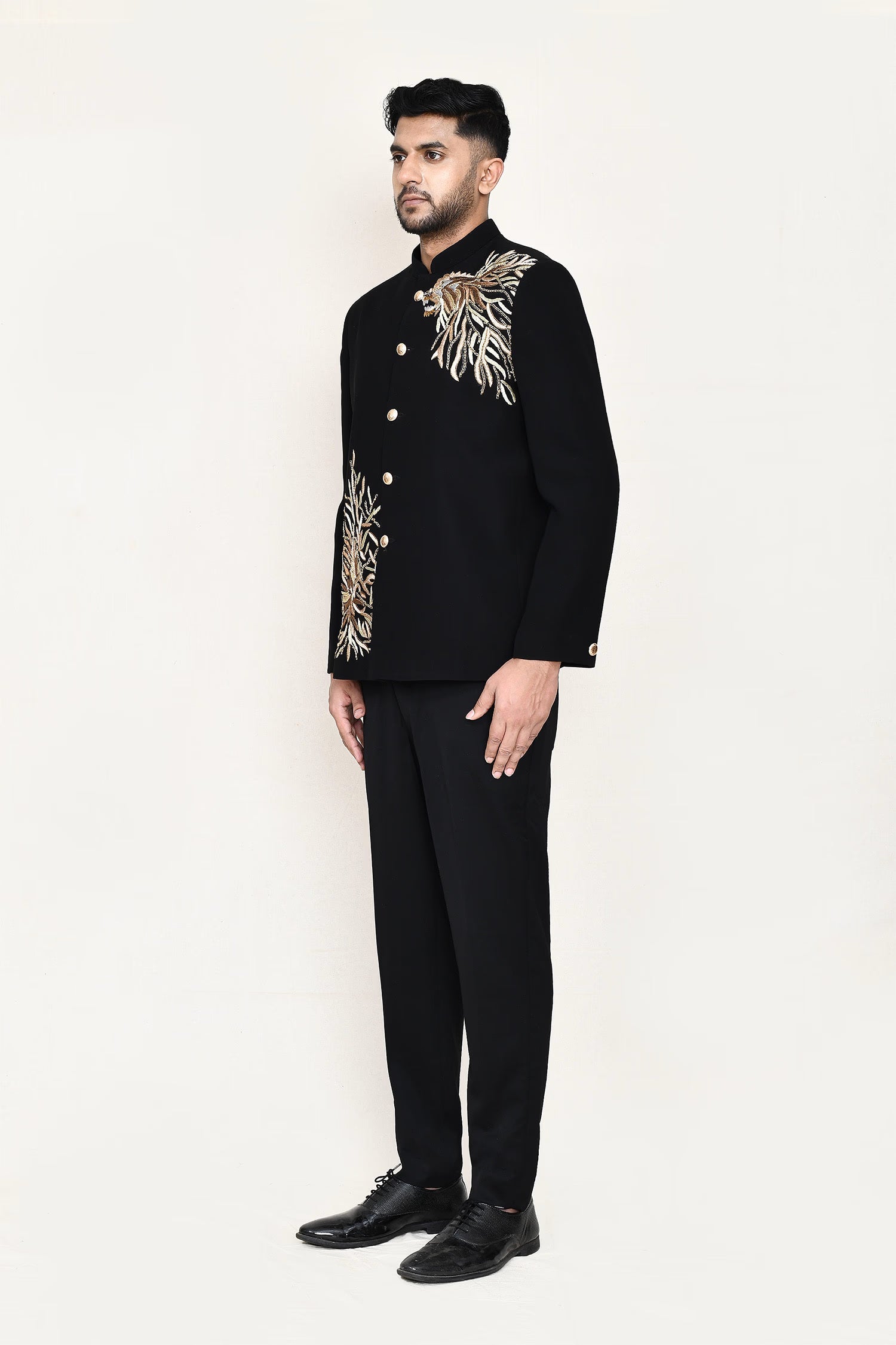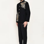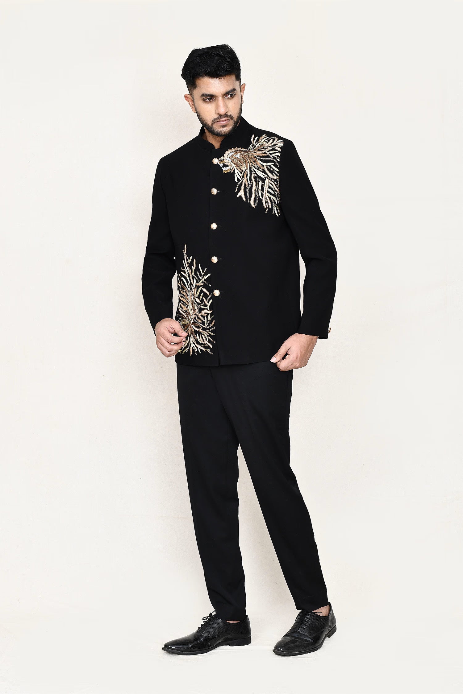 This sherwani set has black top adorned by lion design on the left side of shoulder and bottom of right side has some leaf work paired with black rayon pants which emits luxurious appearance makes it ideal for any occasion.