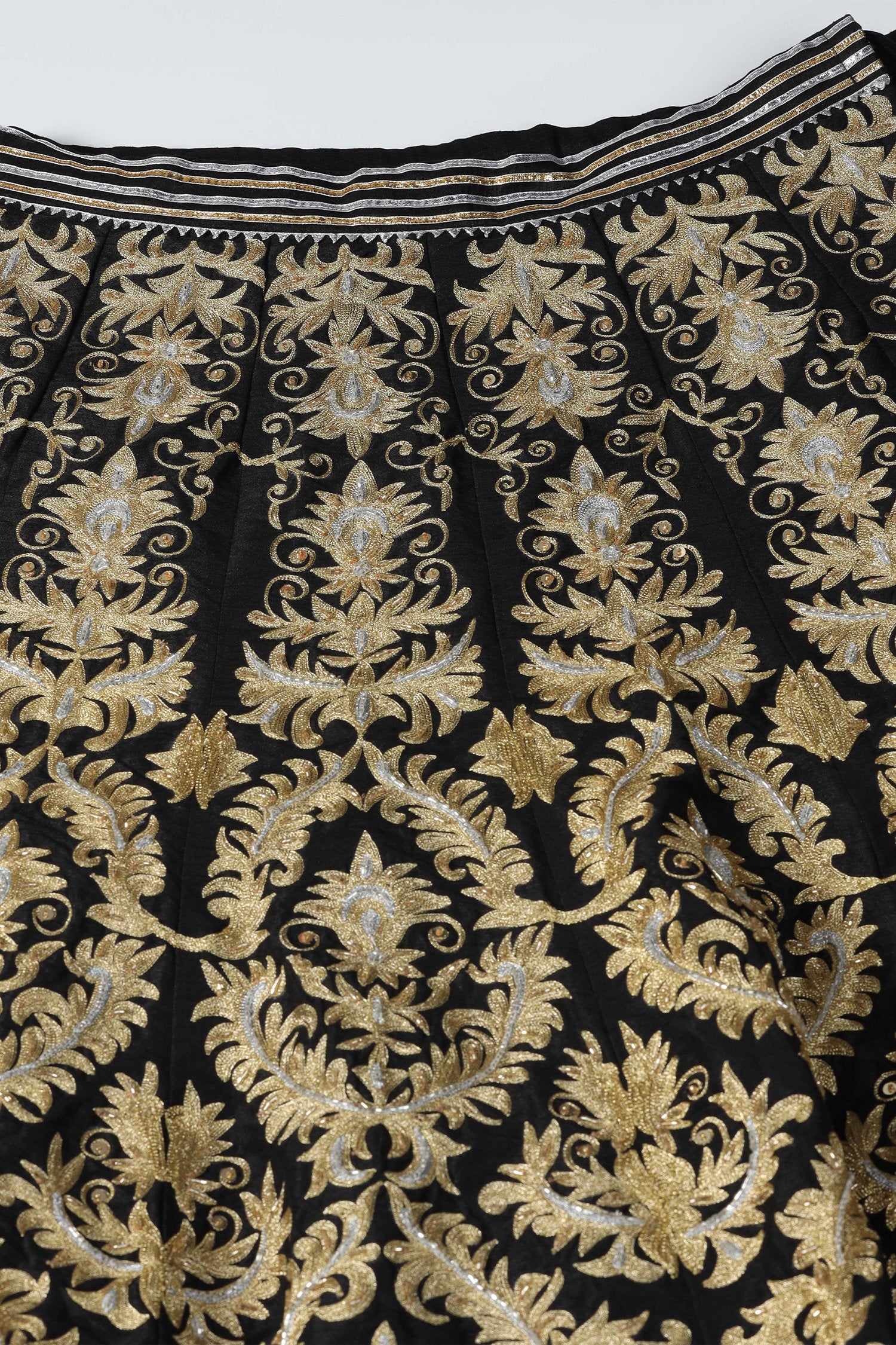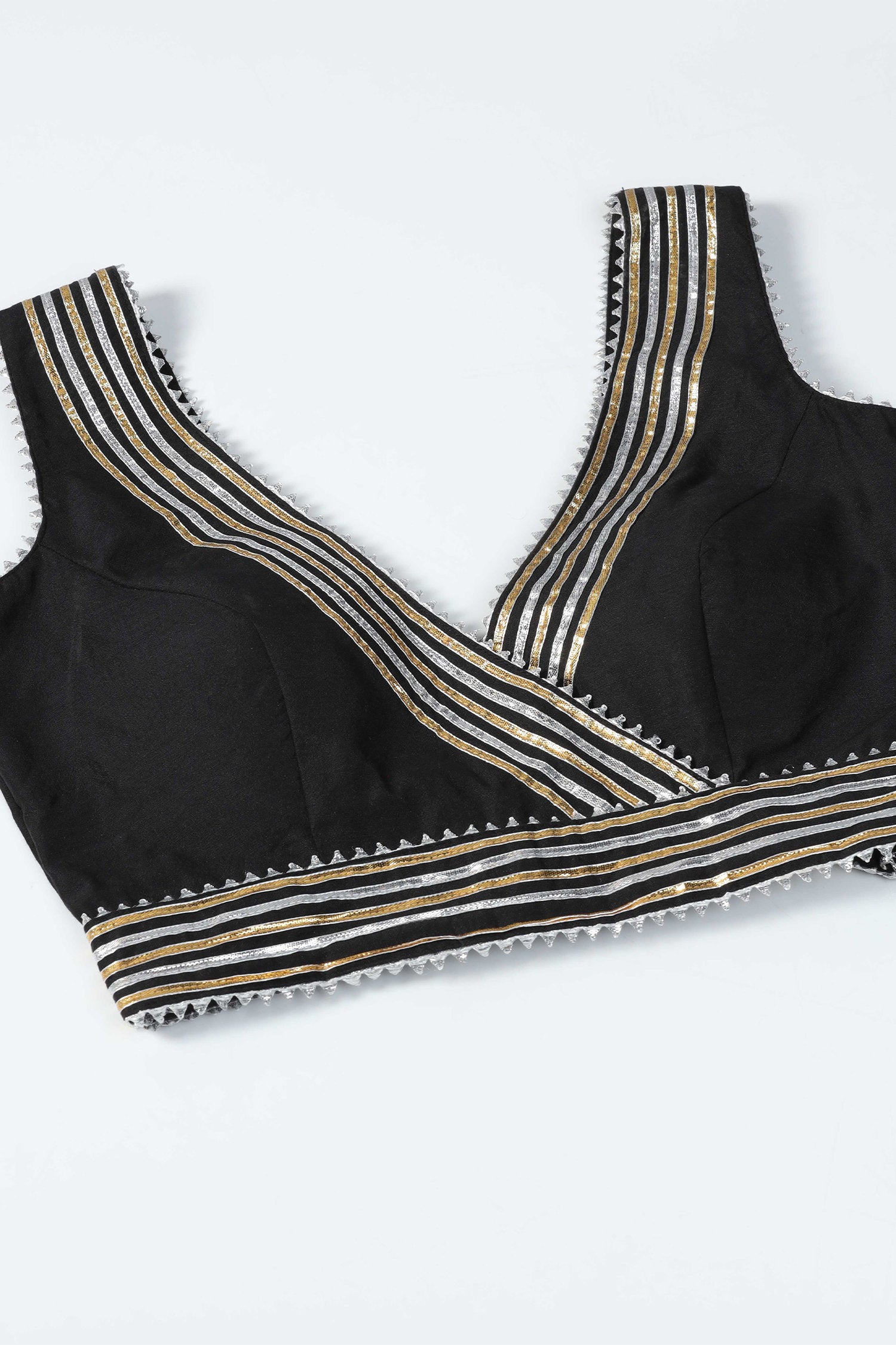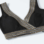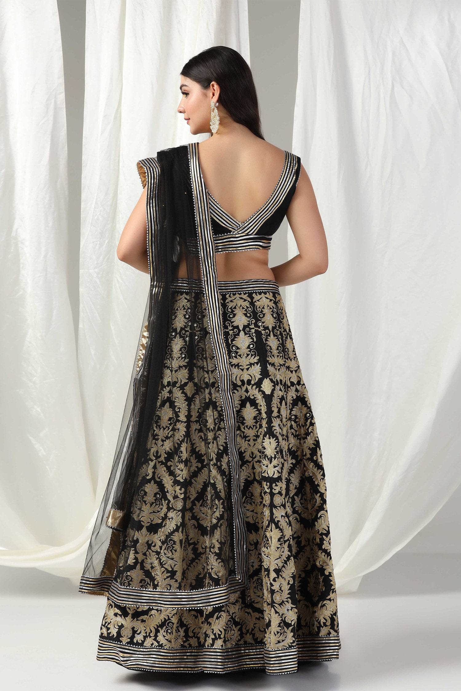 The black raw silk designer gota patti lehenga with blouse and dupatta that is perfect for any occasion.