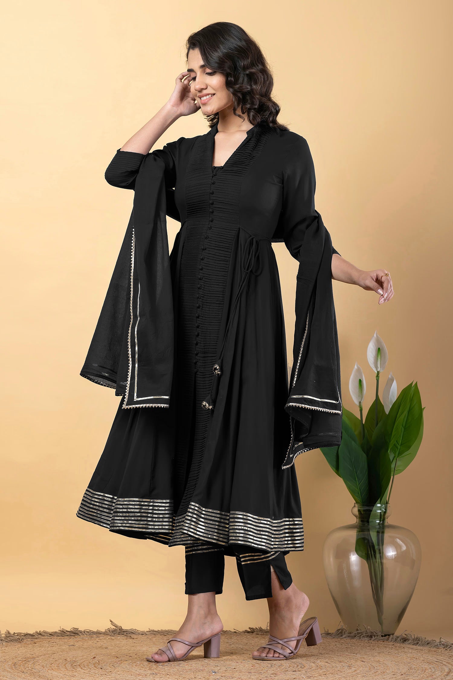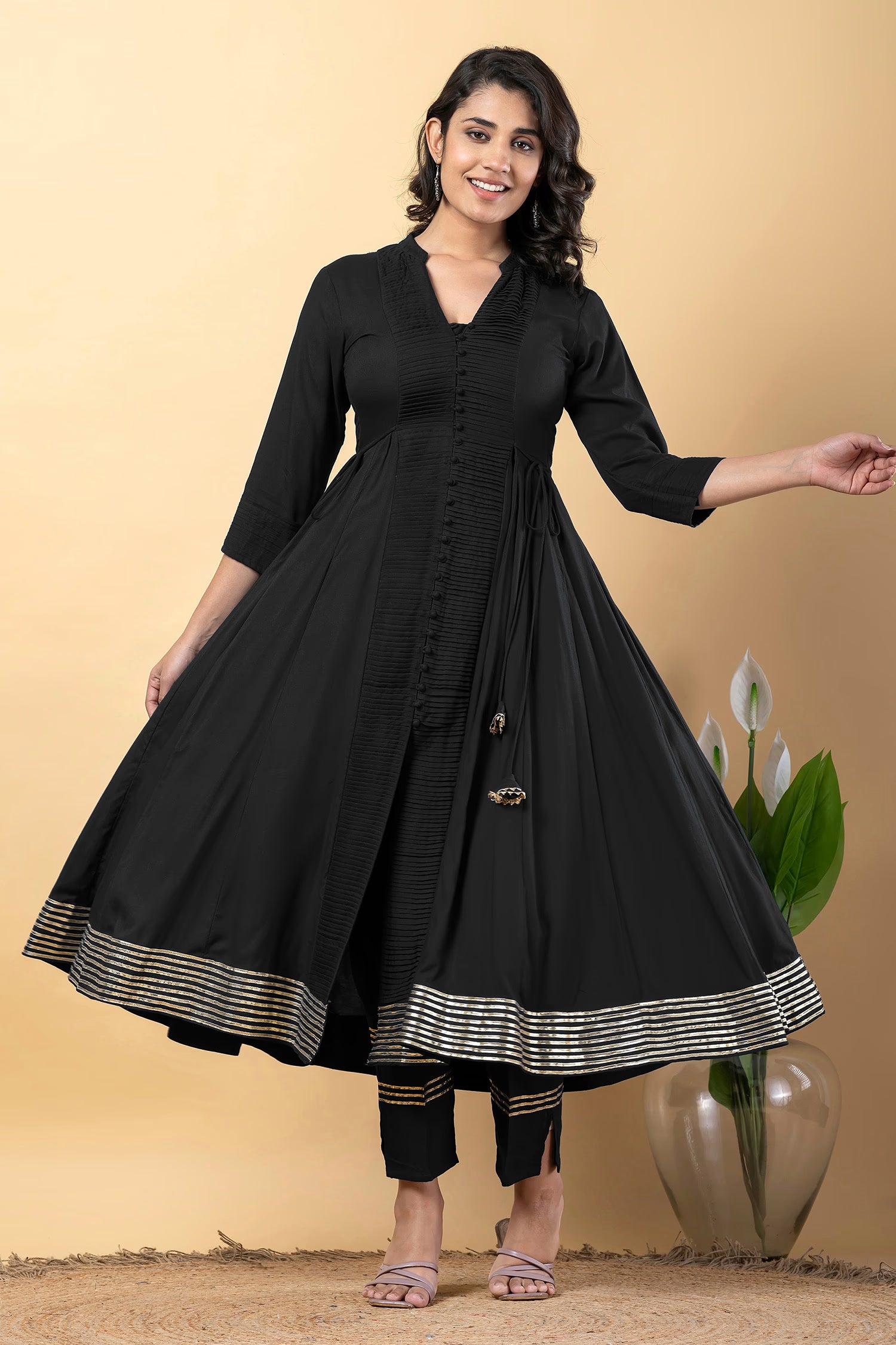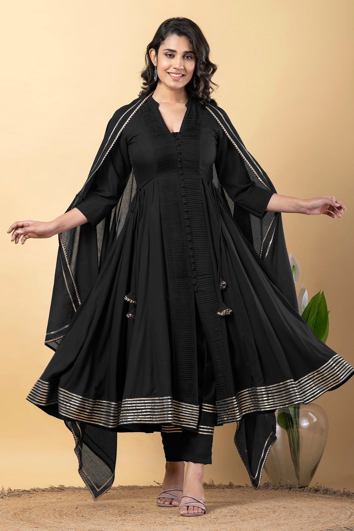 The V neckline mid-forearm sleeves of black rayon anarkali adorned with buttons ,ties and gotta work . It is complemented with pant and dupatta