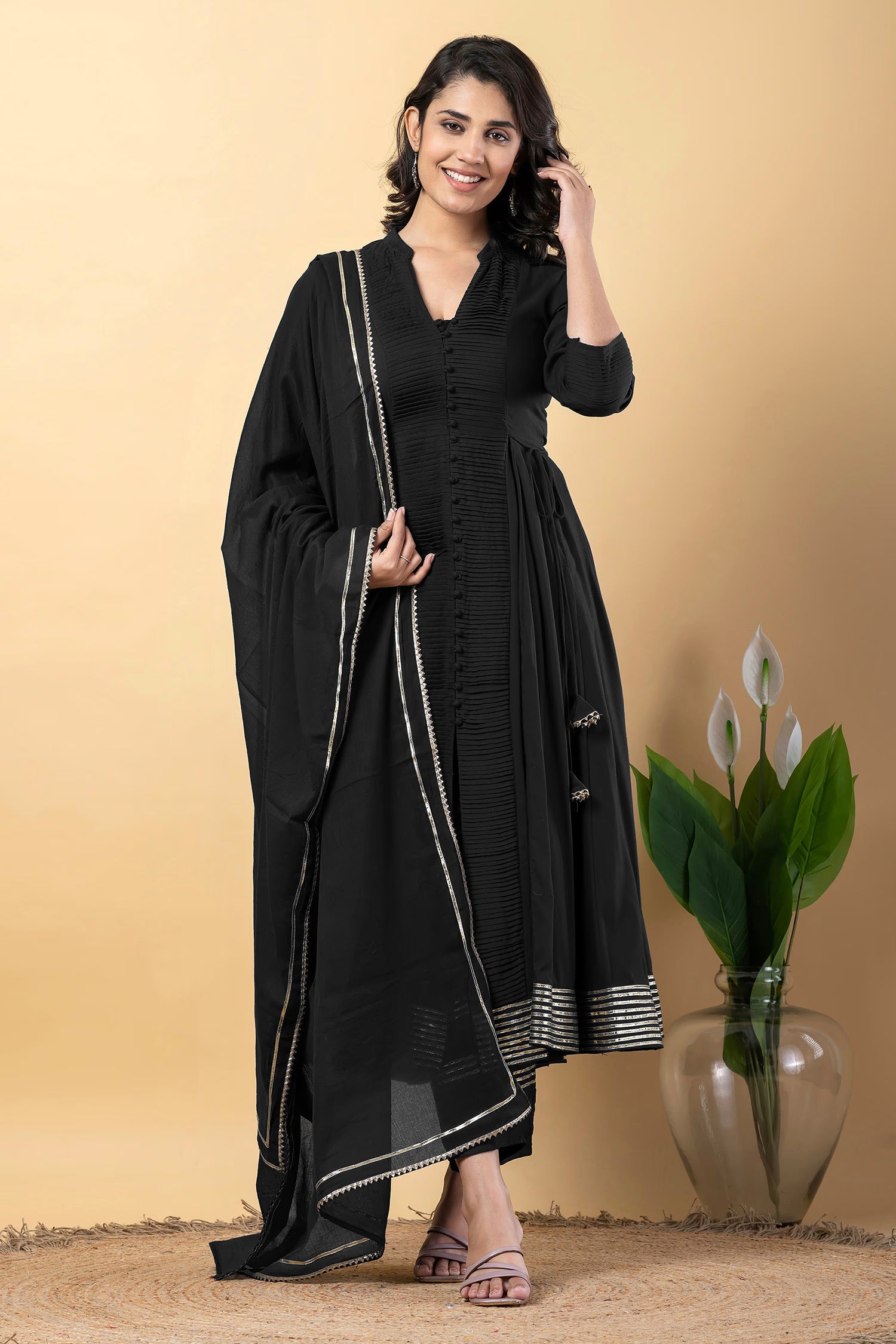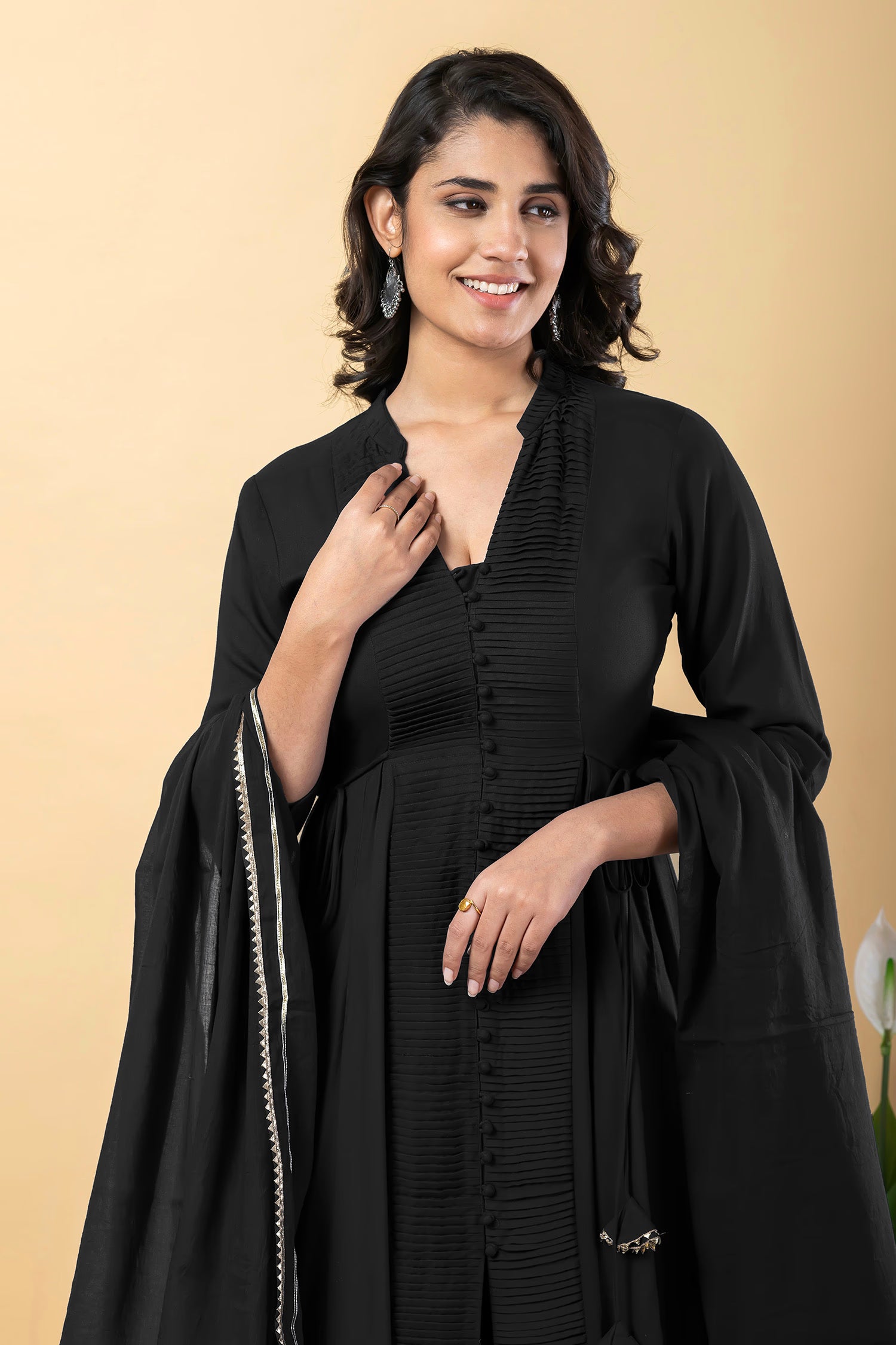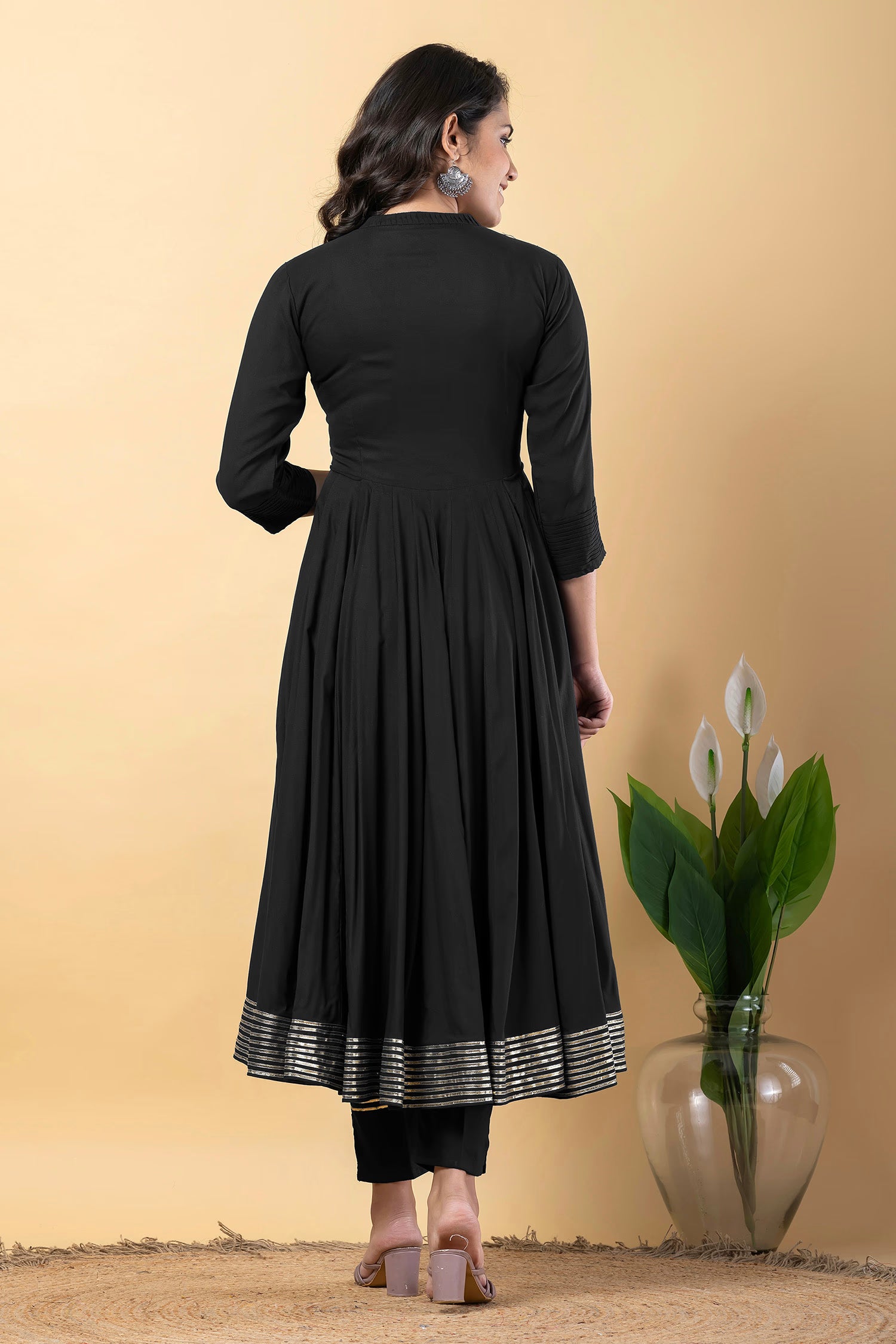 The V neckline mid-forearm sleeves of black rayon anarkali adorned with buttons ,ties and gotta work . It is complemented with pant and dupatta