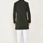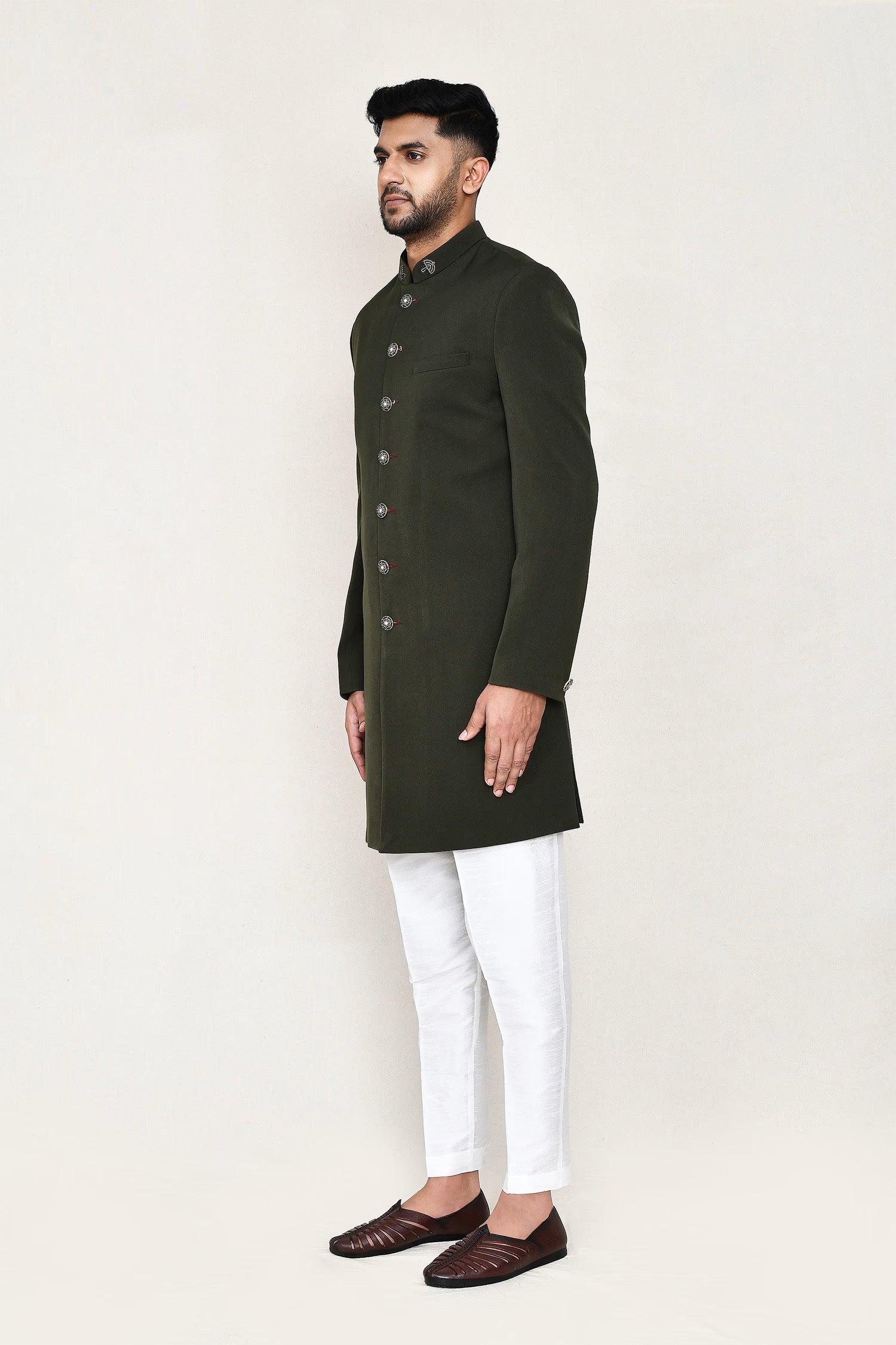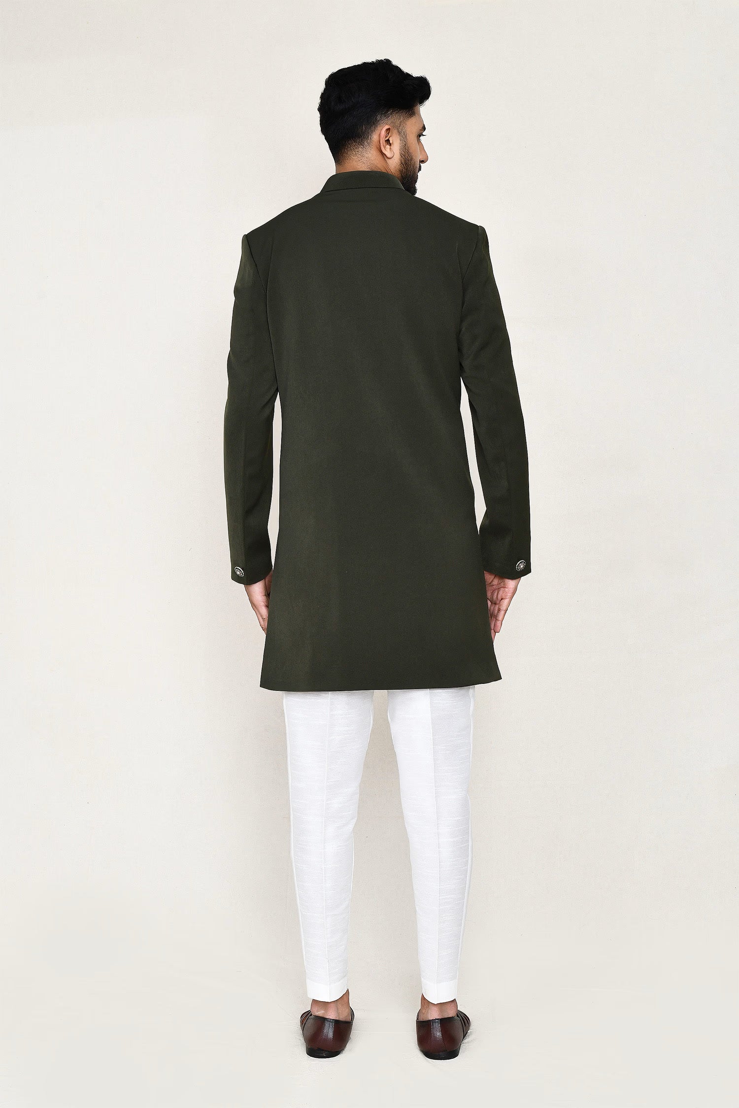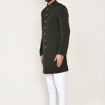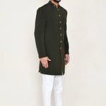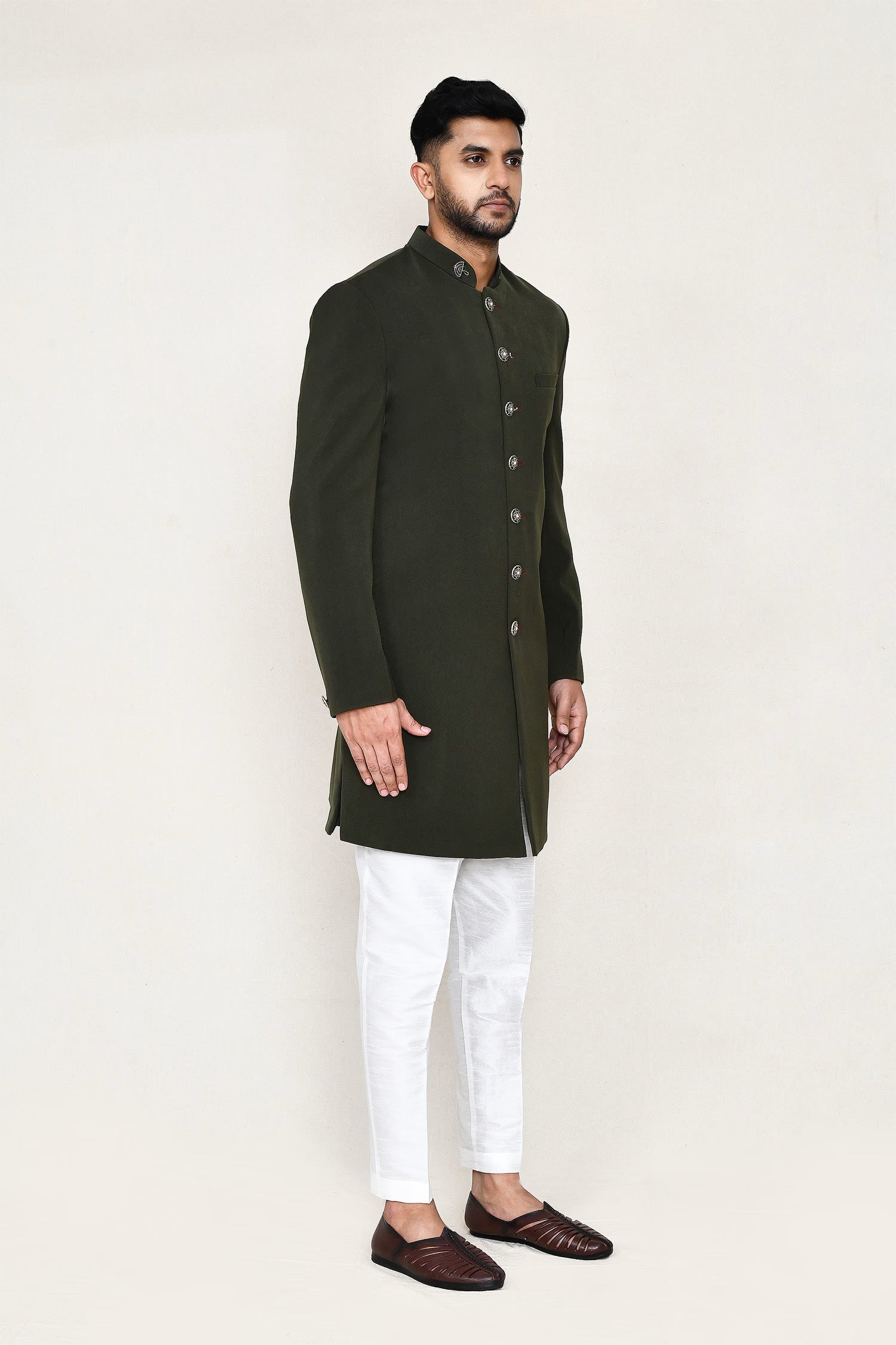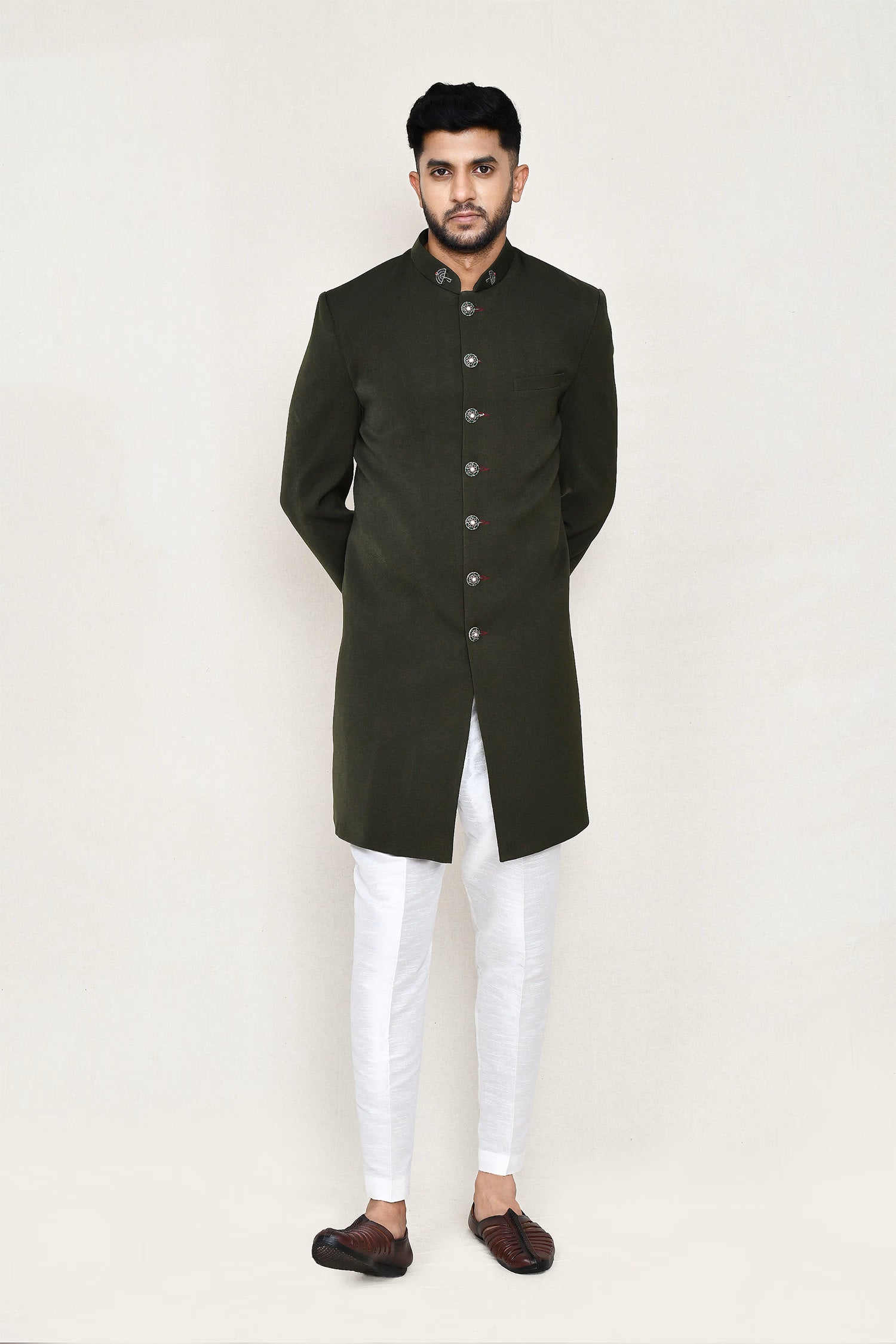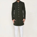 This sherwani set has black rayon top with buttons and collar neck with embellishment paired with white rayon pants which emits luxurious appearance makes it ideal for any occasion.