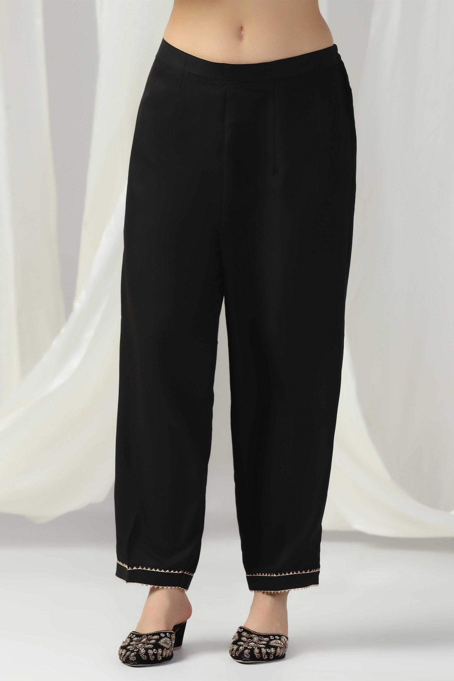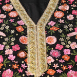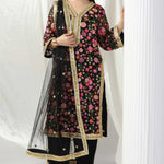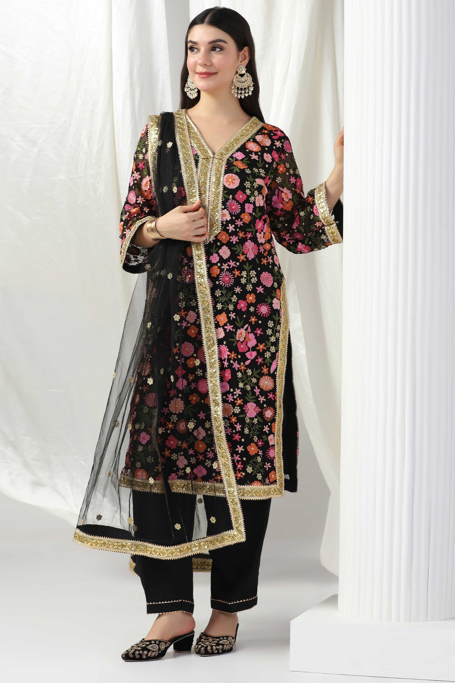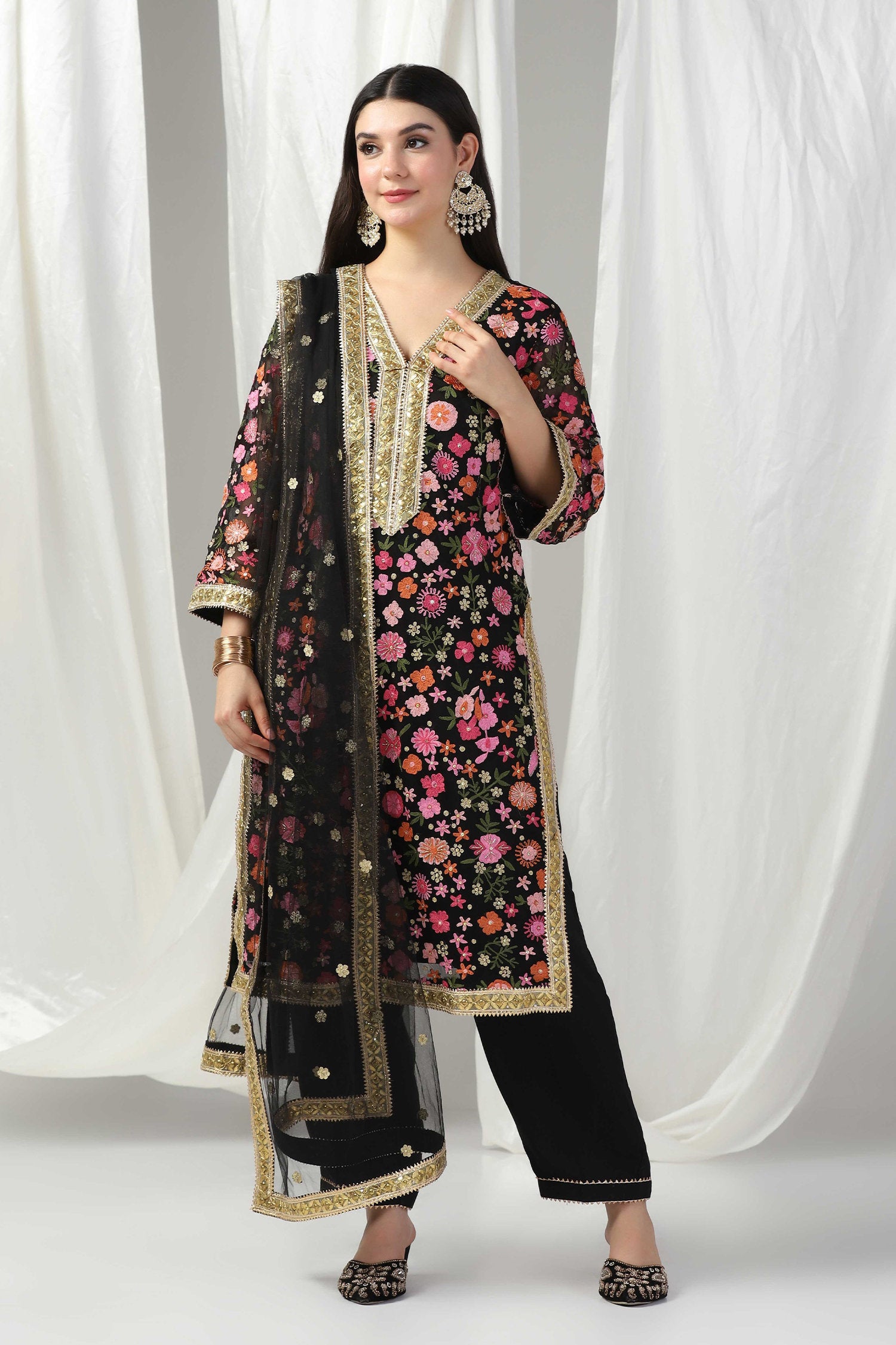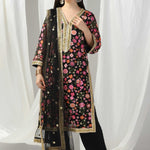The black resham work suit with pants and dupatta for a classy yet simple touch with tradition.