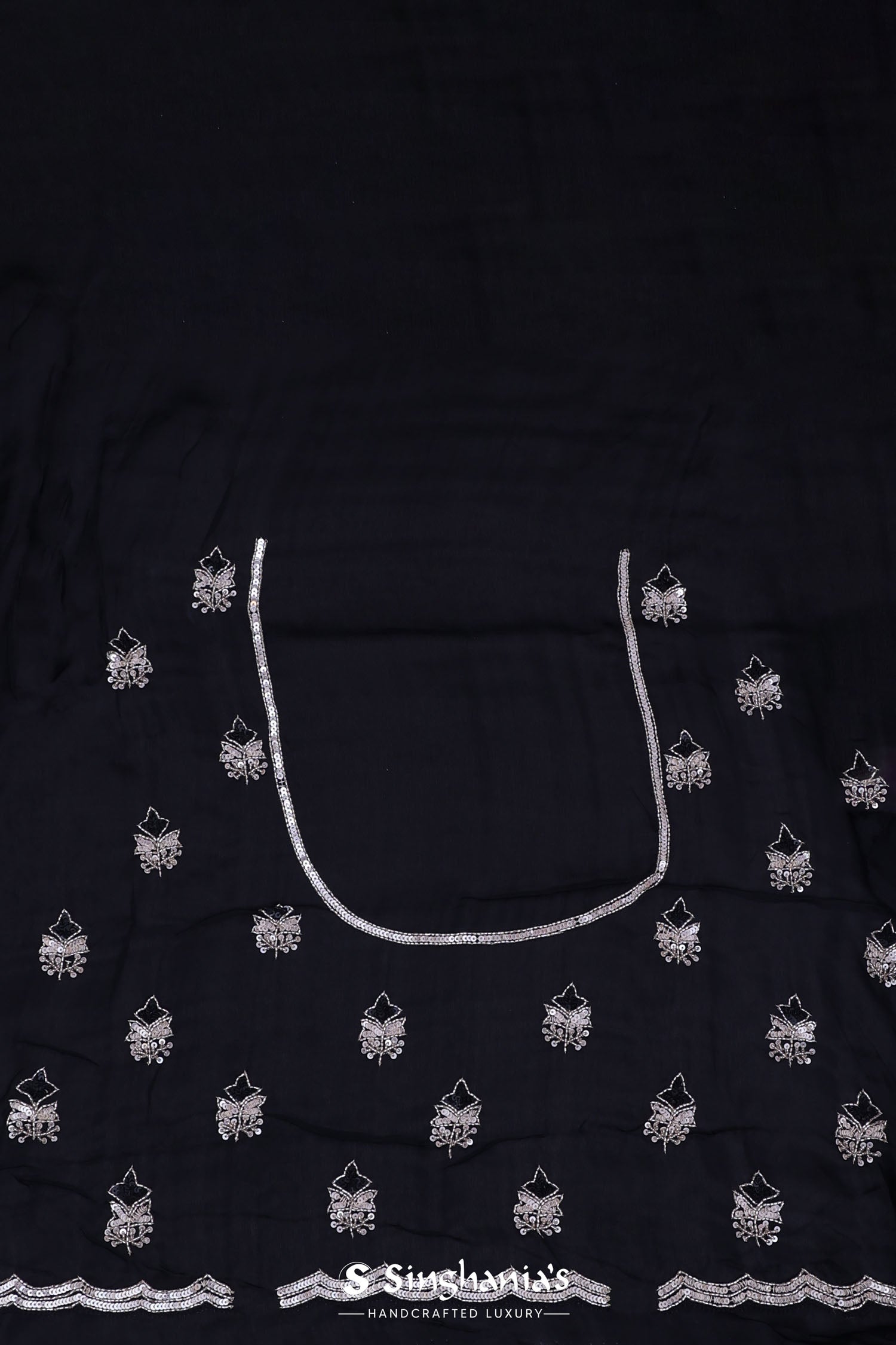 The black satin silk designer saree with sequin and cutdana work along with an unstitched self blouse for a decent and dignified look.