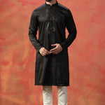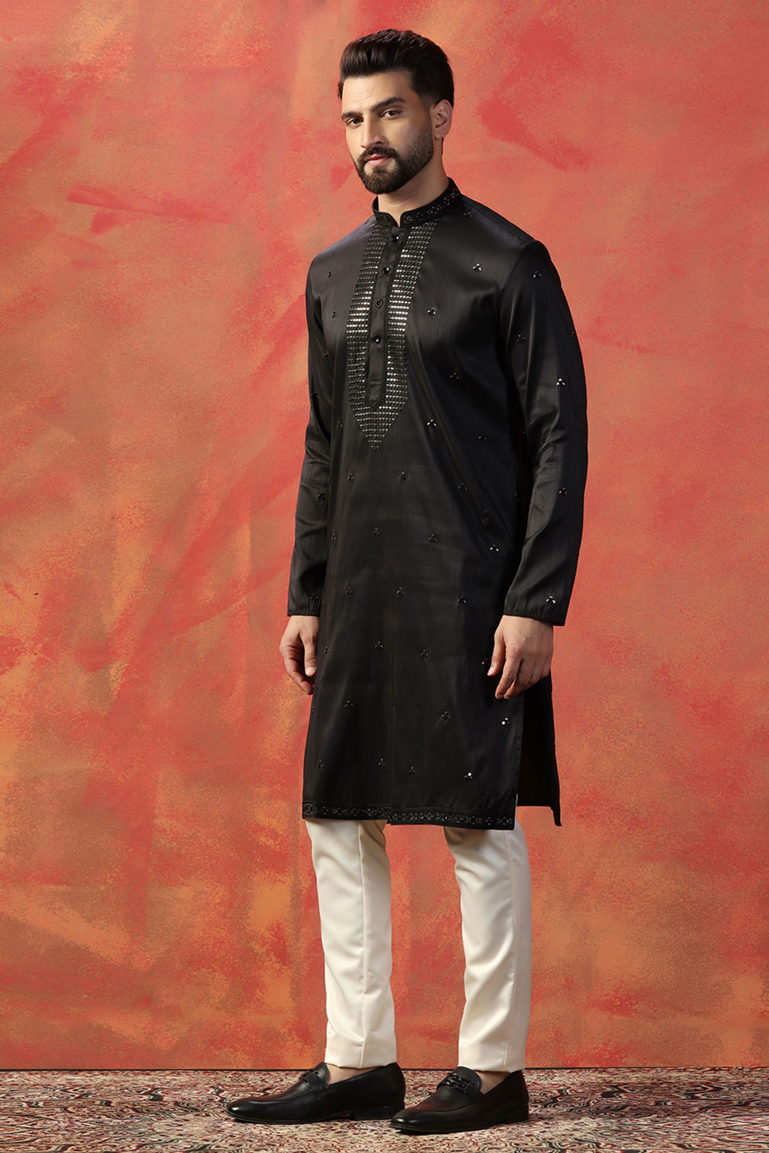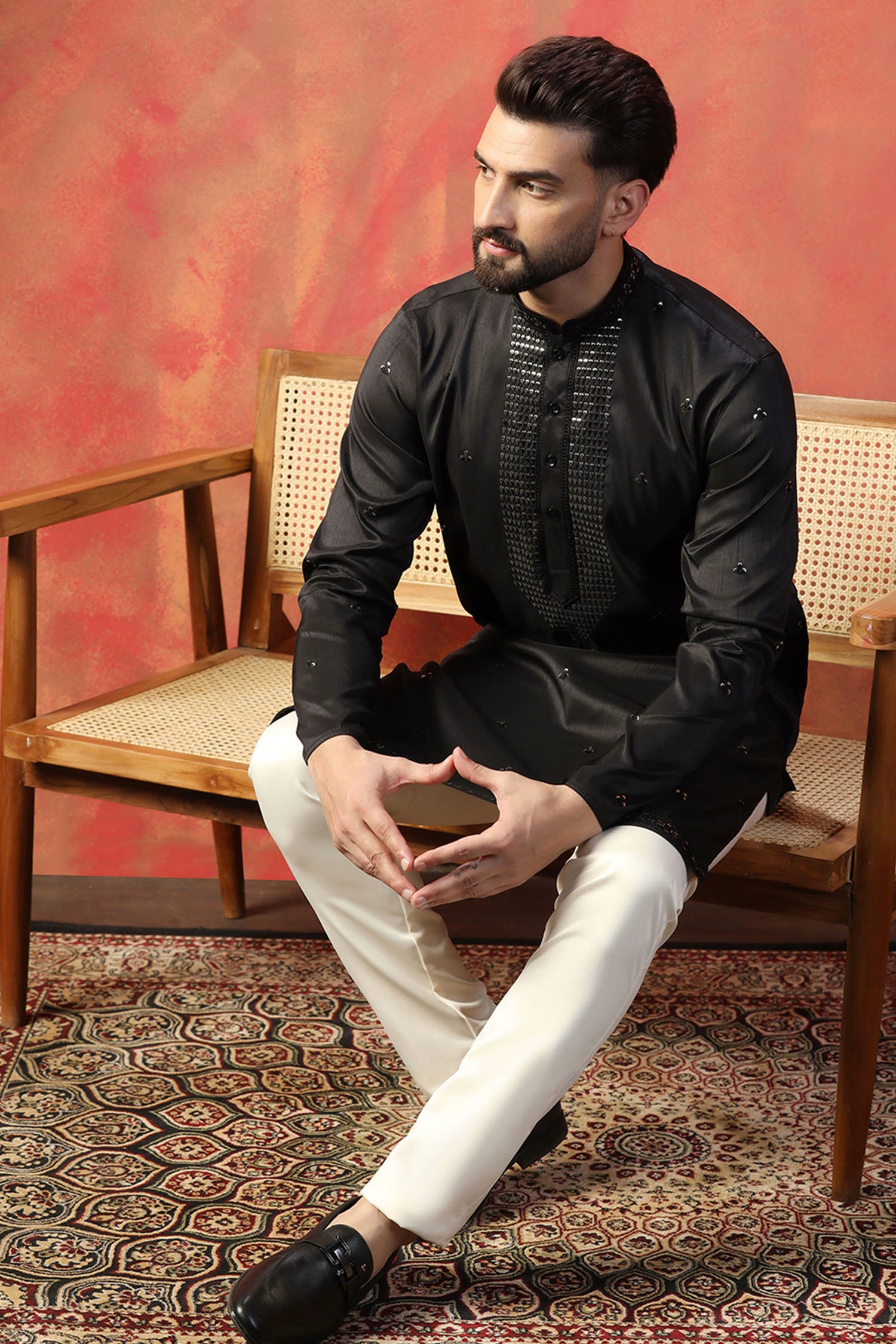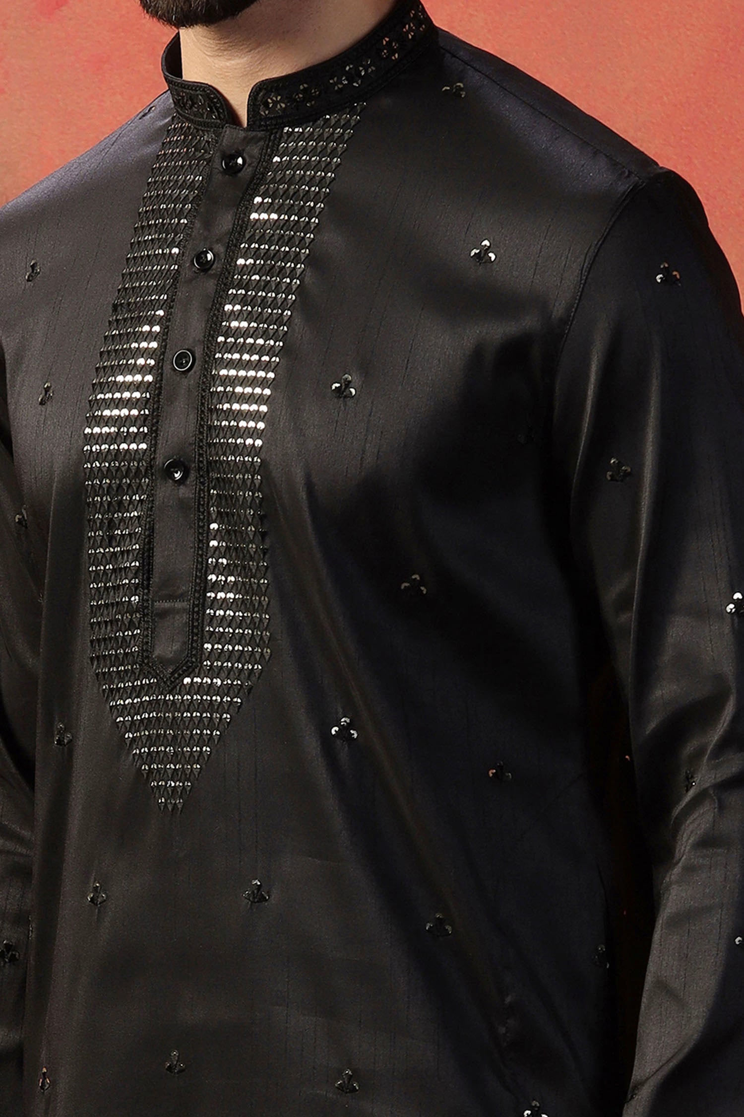 The sequins work embellished on Black silk blend kurta set with mandarin neckline complemented with full sleeves making it perfect for traditional occasions