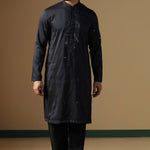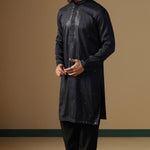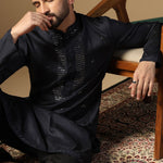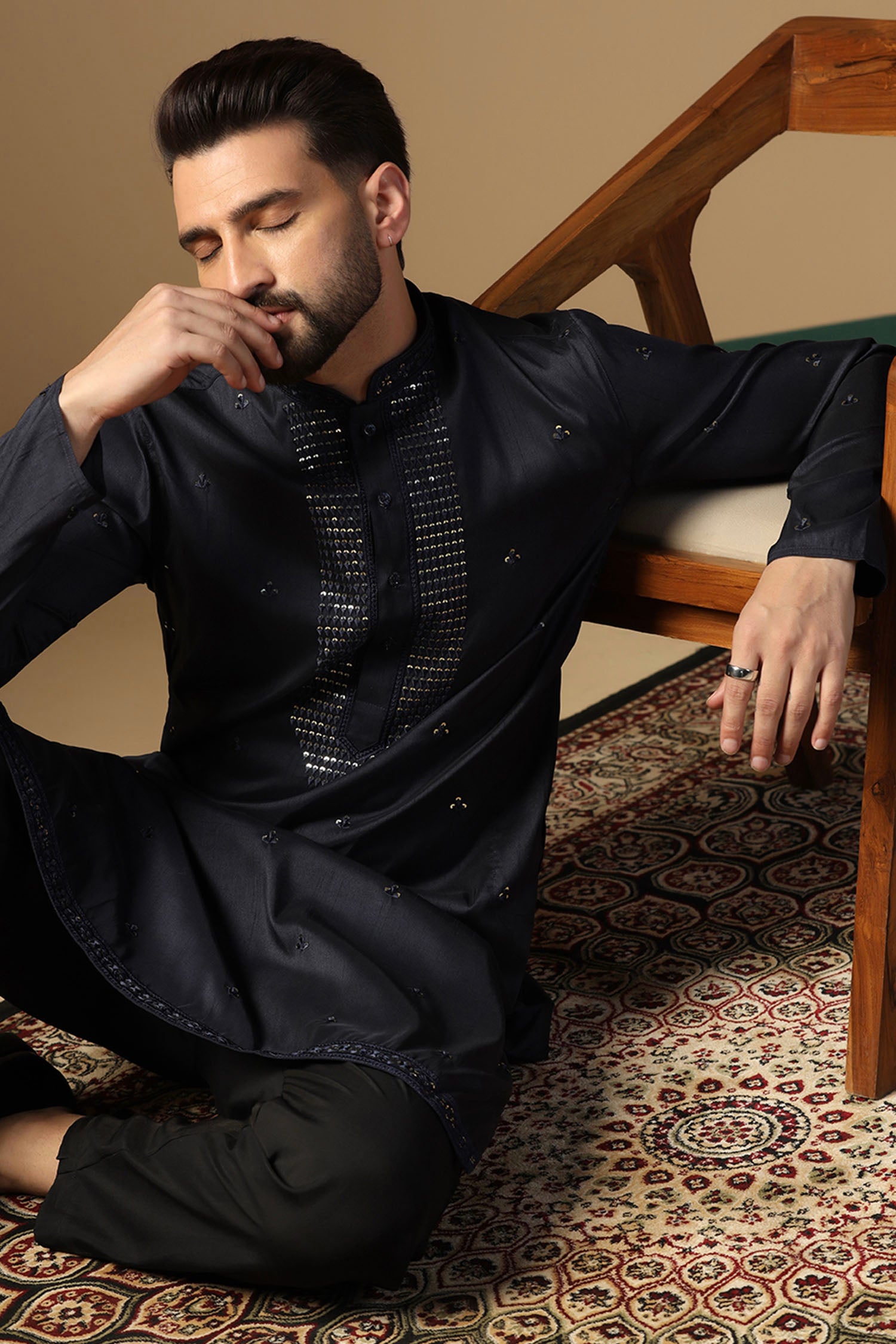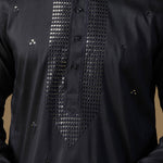 The sequins work embellished on Black silk blend kurta set with mandarin neckline complemented with full sleeves making it perfect for traditional occasions
