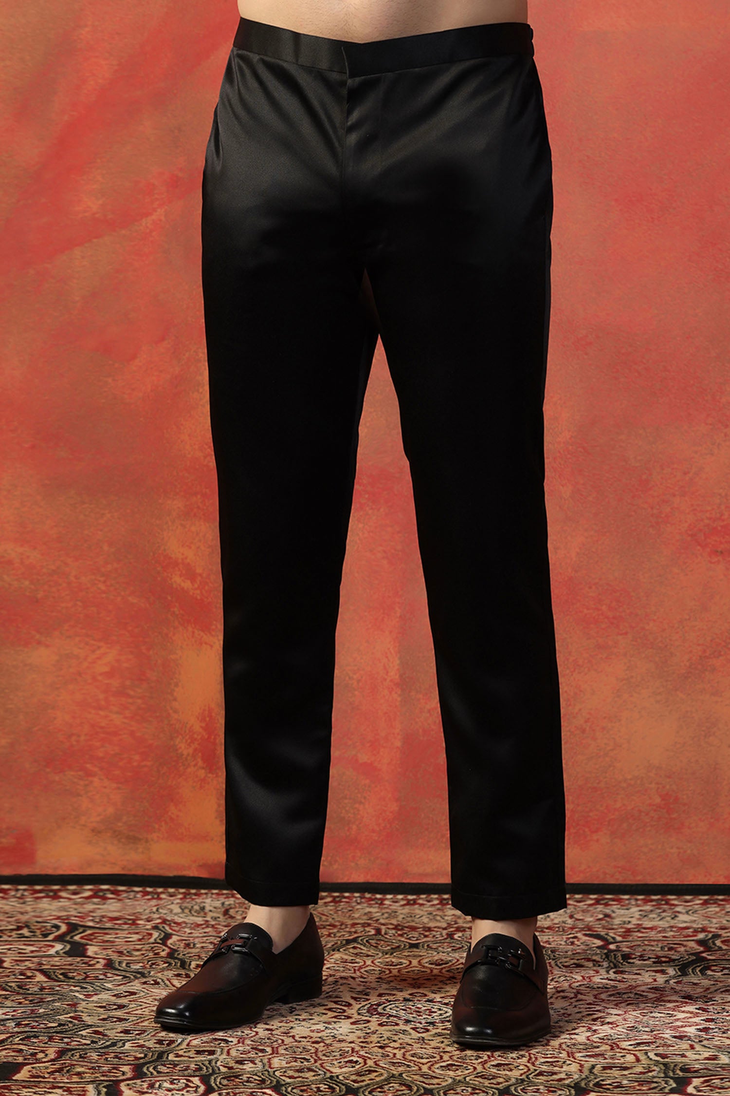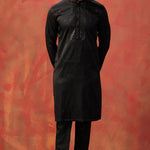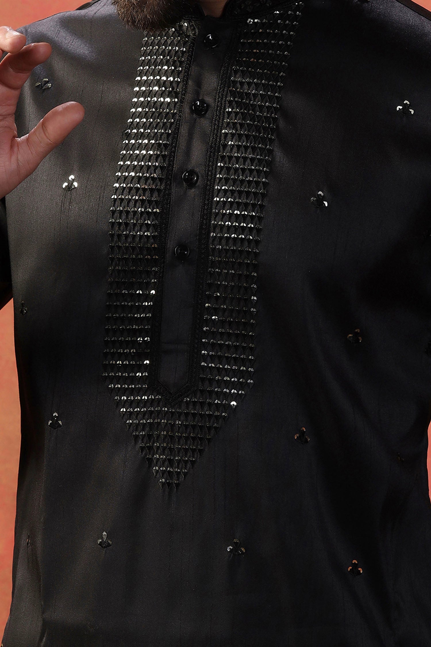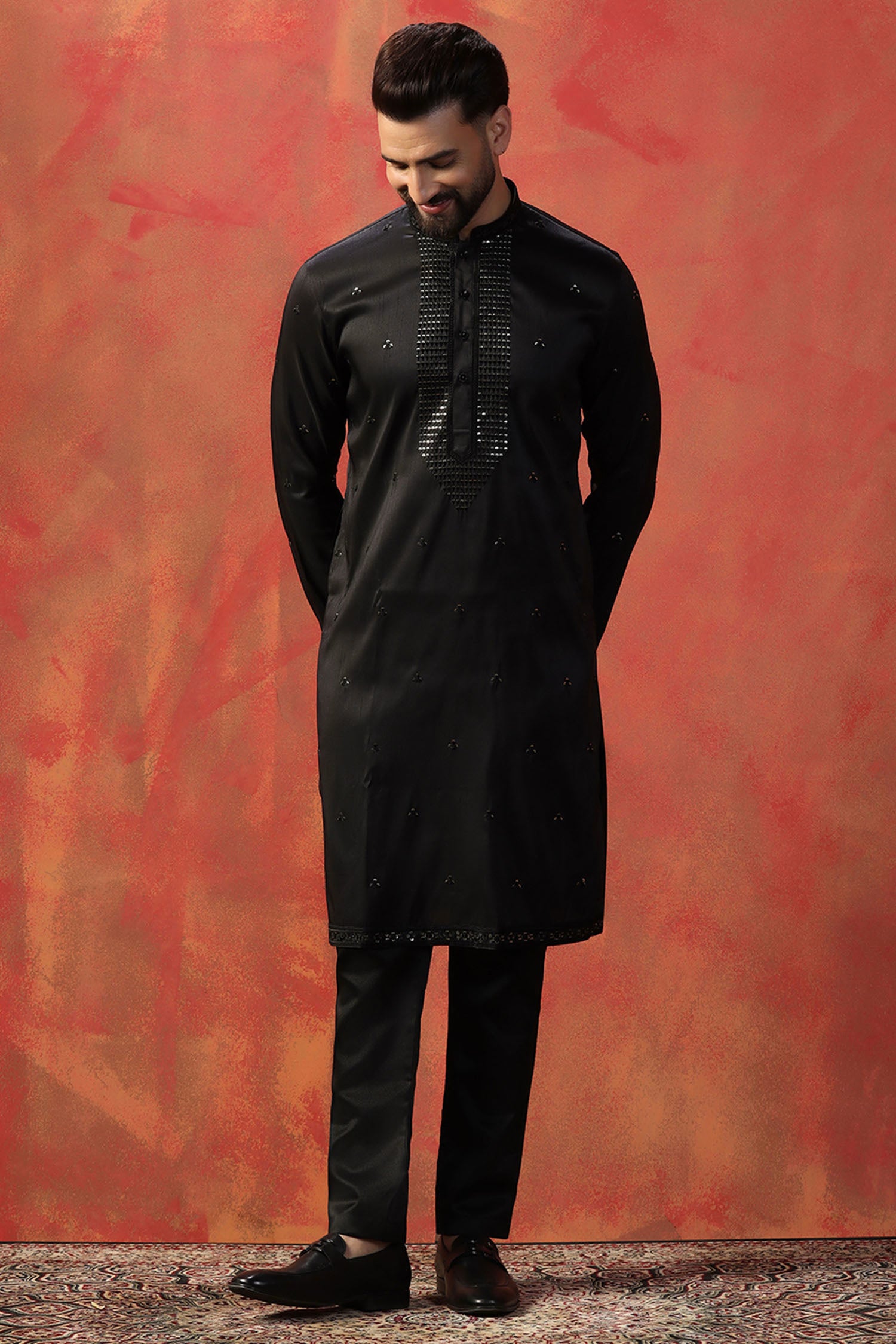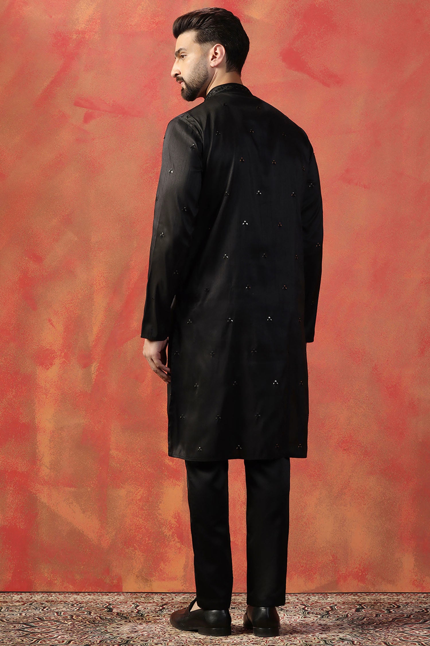The embroidery work embellished on Black silk blend kurta with mandarin neckline complemented with black elastic pajama making it perfect for traditional occasions