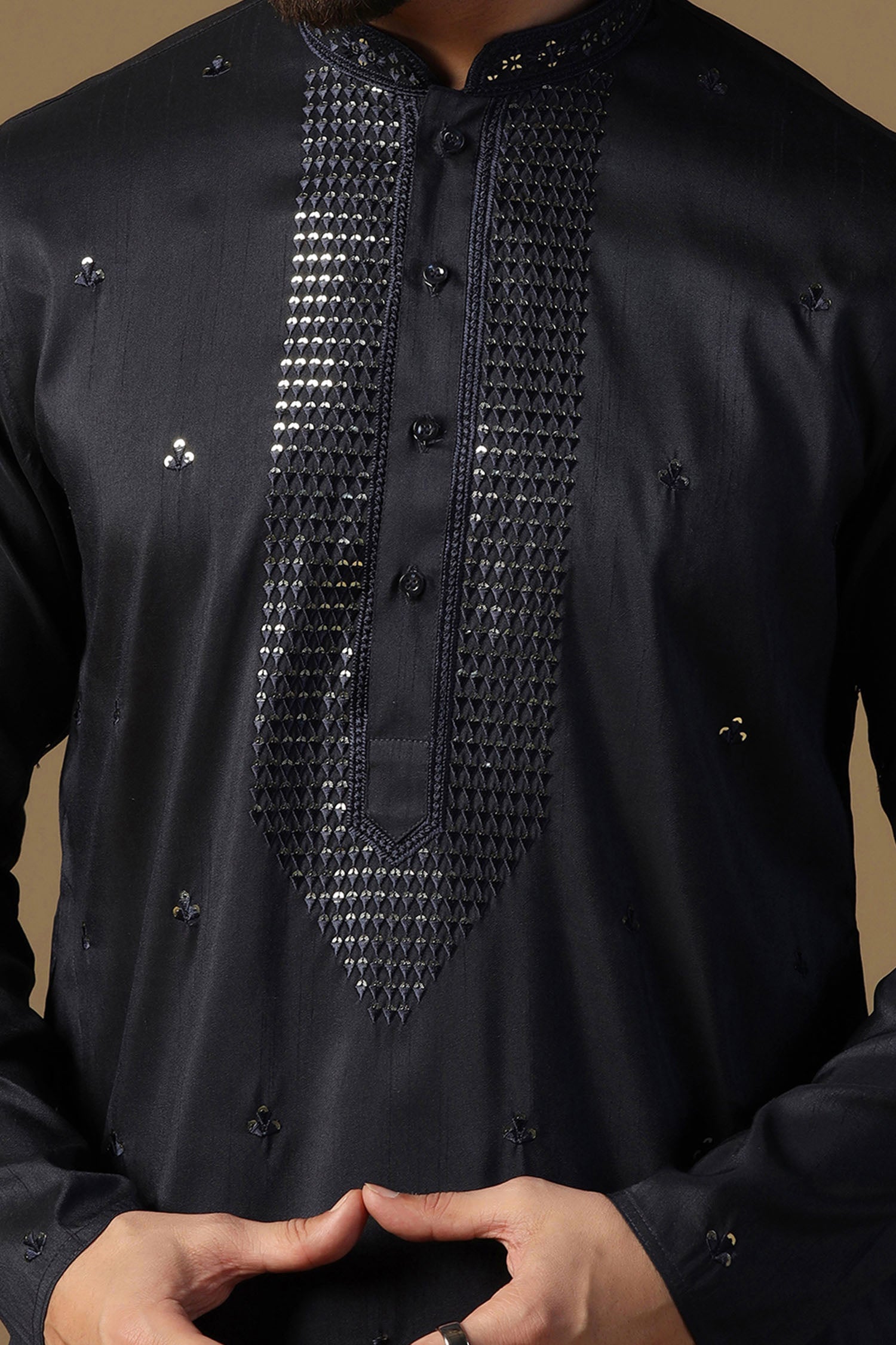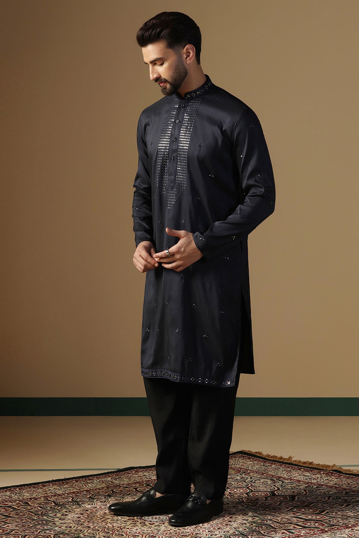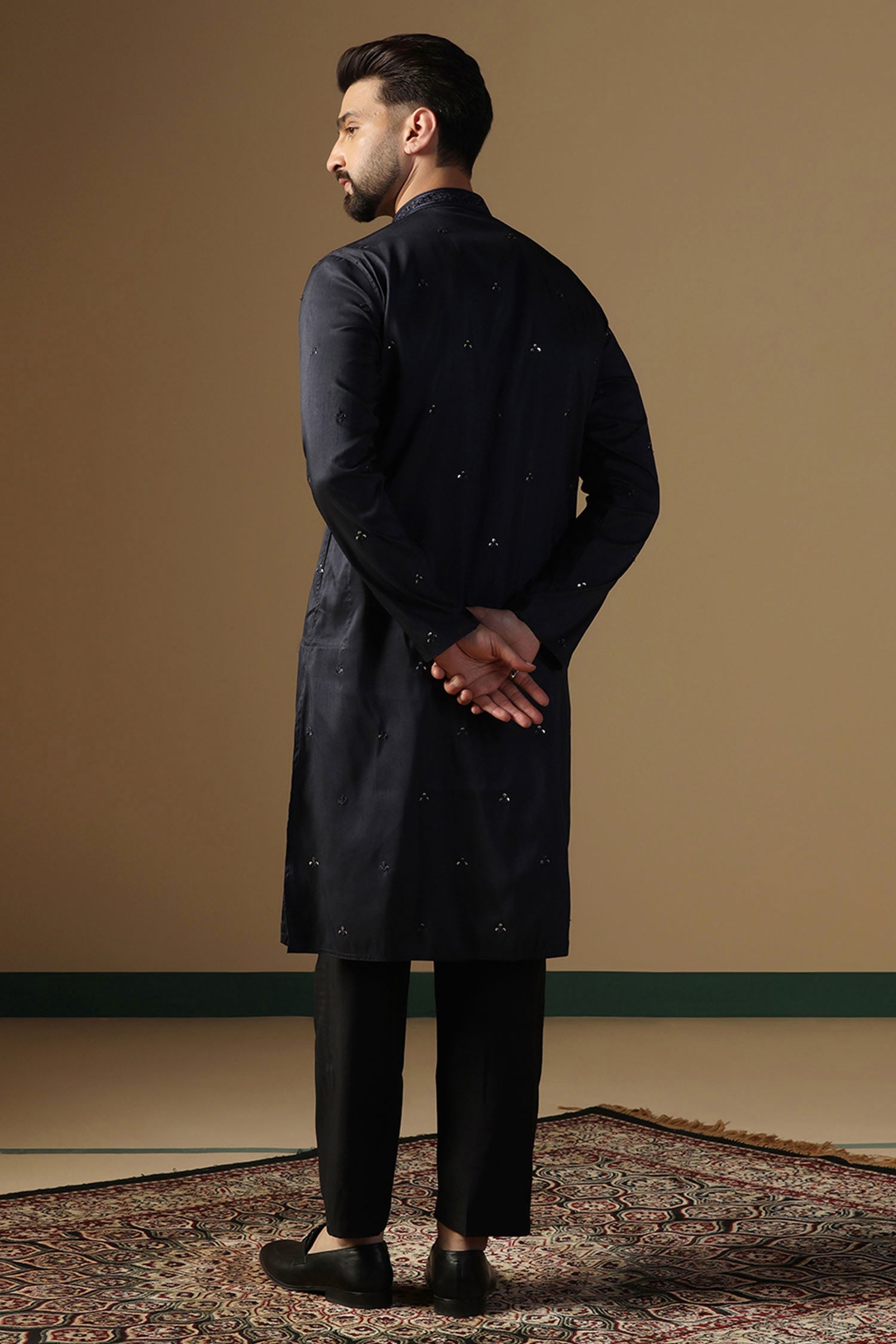 The sequins work embellished on Black silk blend kurta with mandarin neckline complemented with black elastic pajama making it perfect for traditional occasions