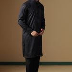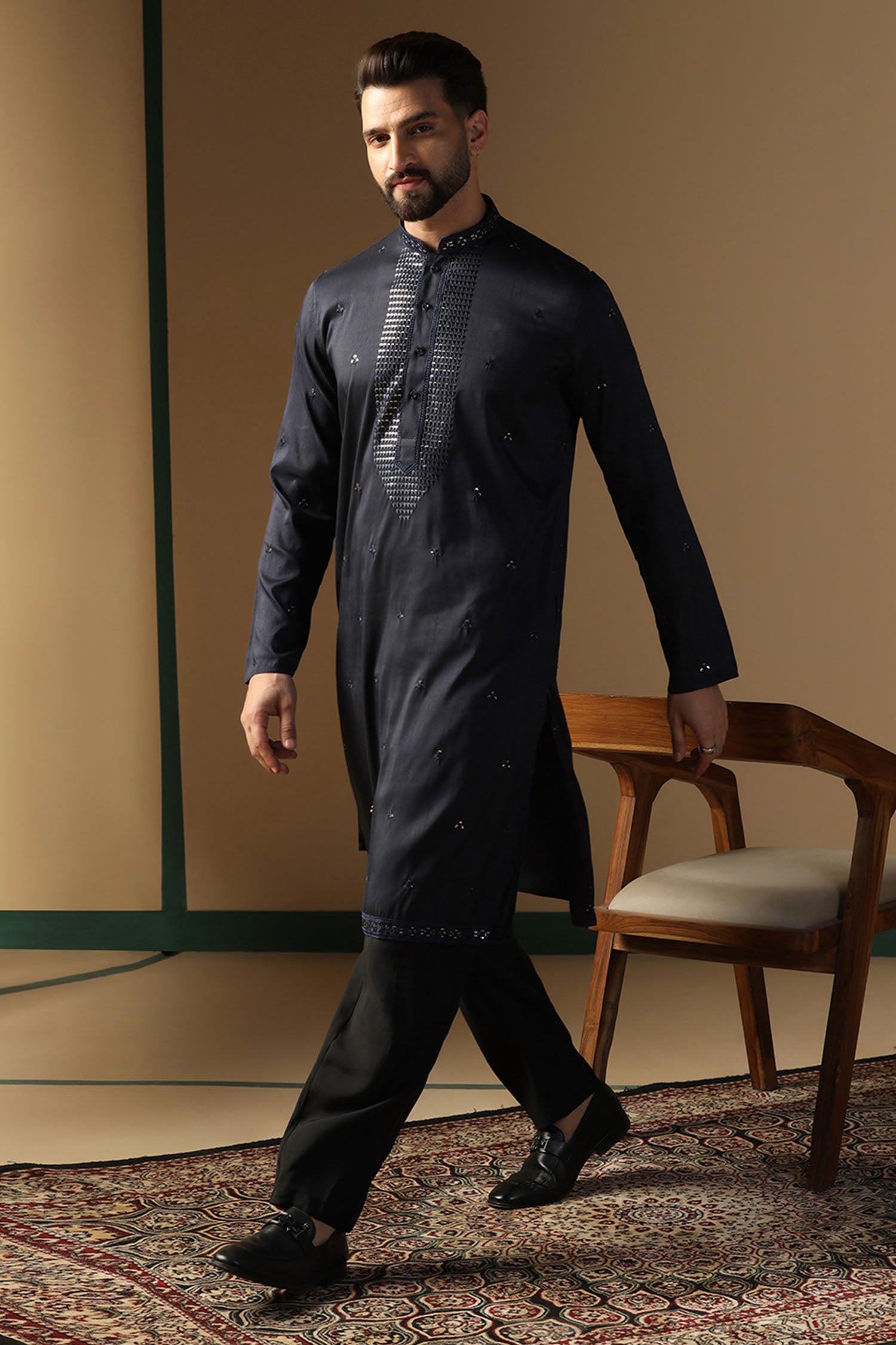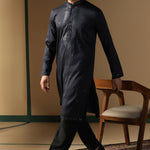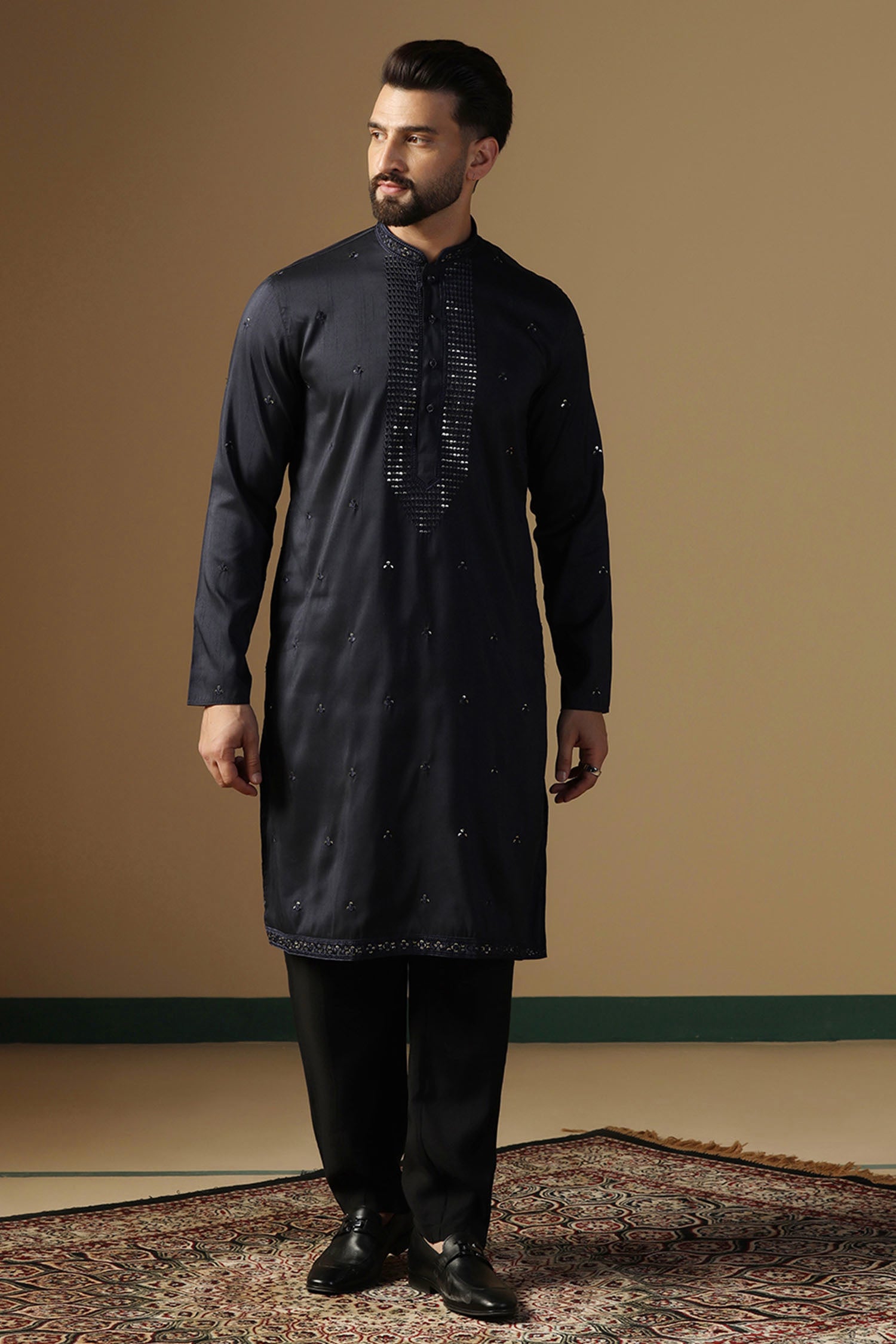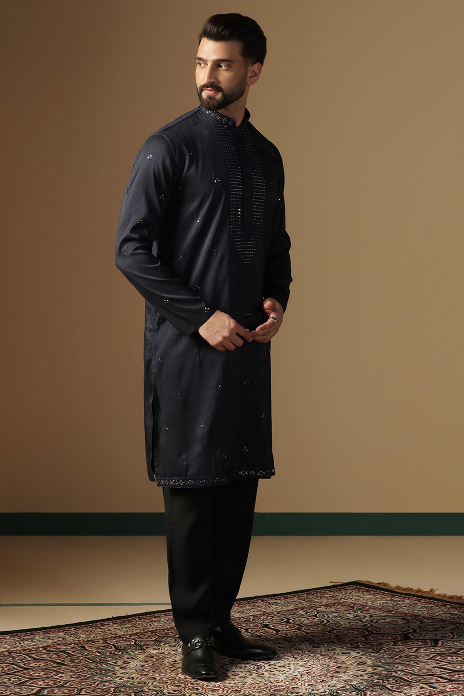 The sequins work embellished on Black silk blend kurta with mandarin neckline complemented with black elastic pajama making it perfect for traditional occasions