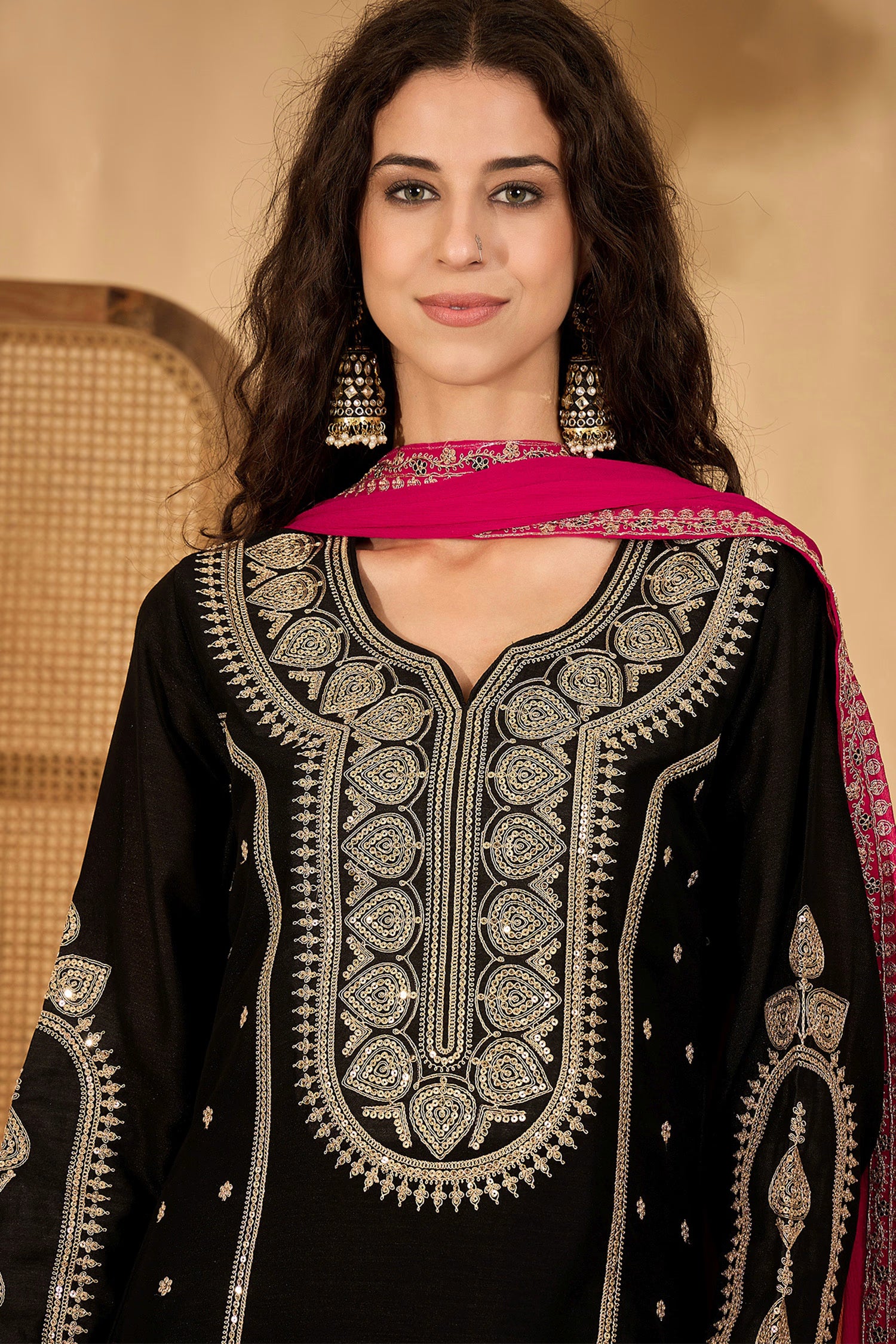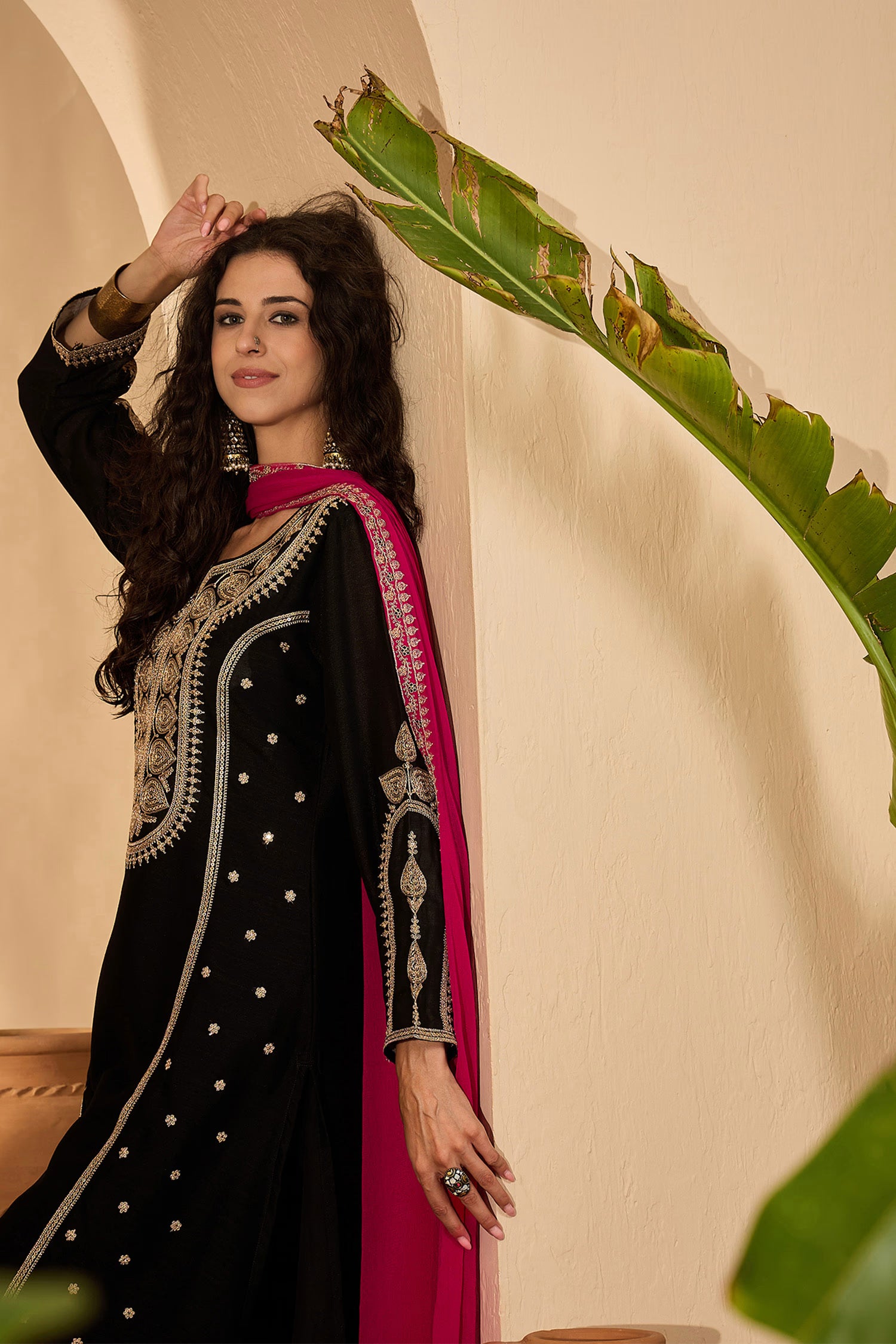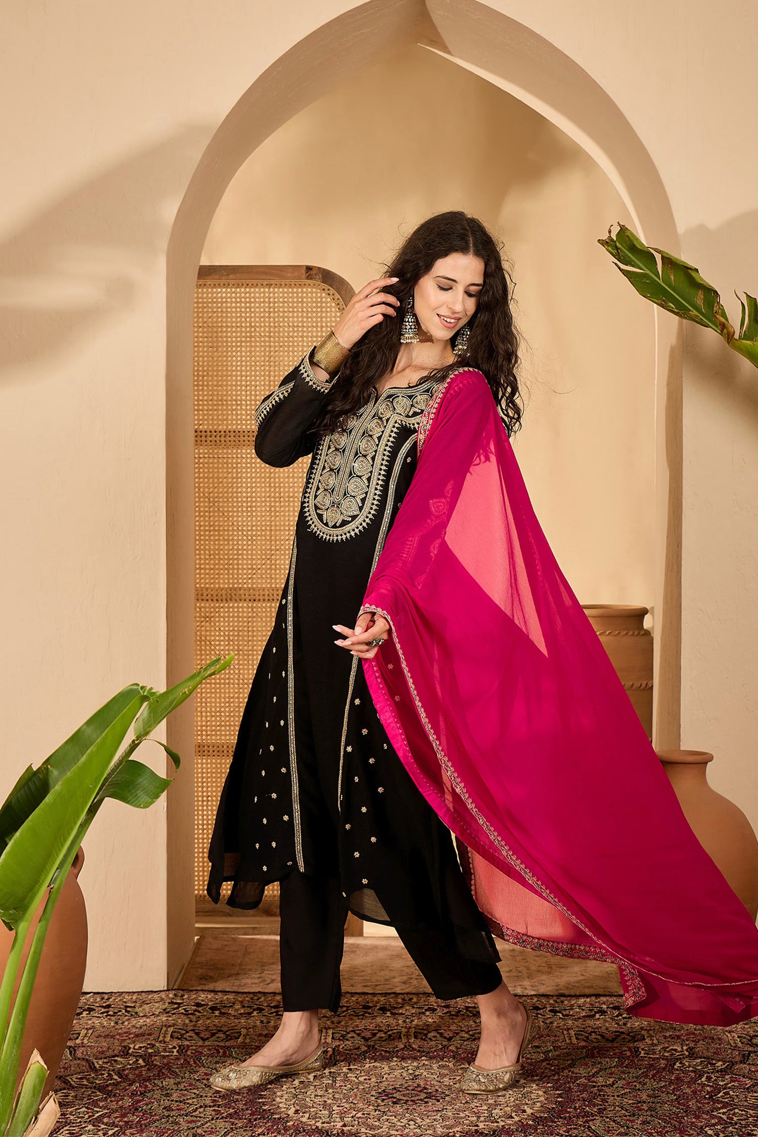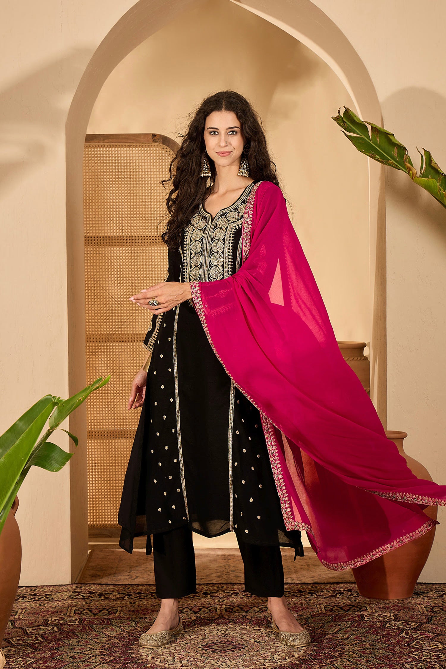 The black silk long kurti with floral sequin embroidery and a matching pant along with pink chiffon dupatta for an elegant traditional look.