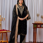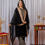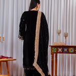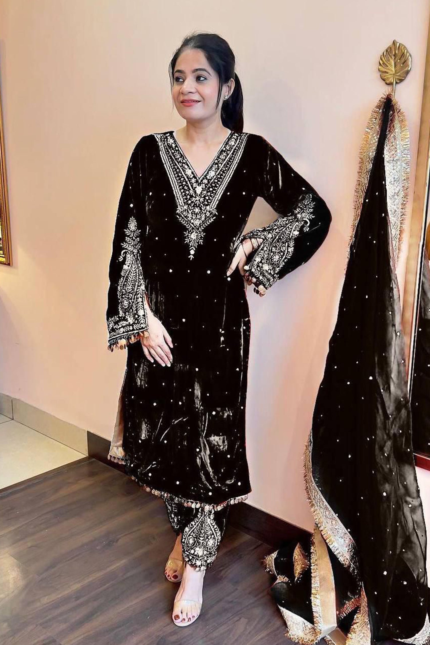 The black velvet embroidered kurti set with matching pant and a georgette dupatta for an elegant and rich look with trendy and neat finish.