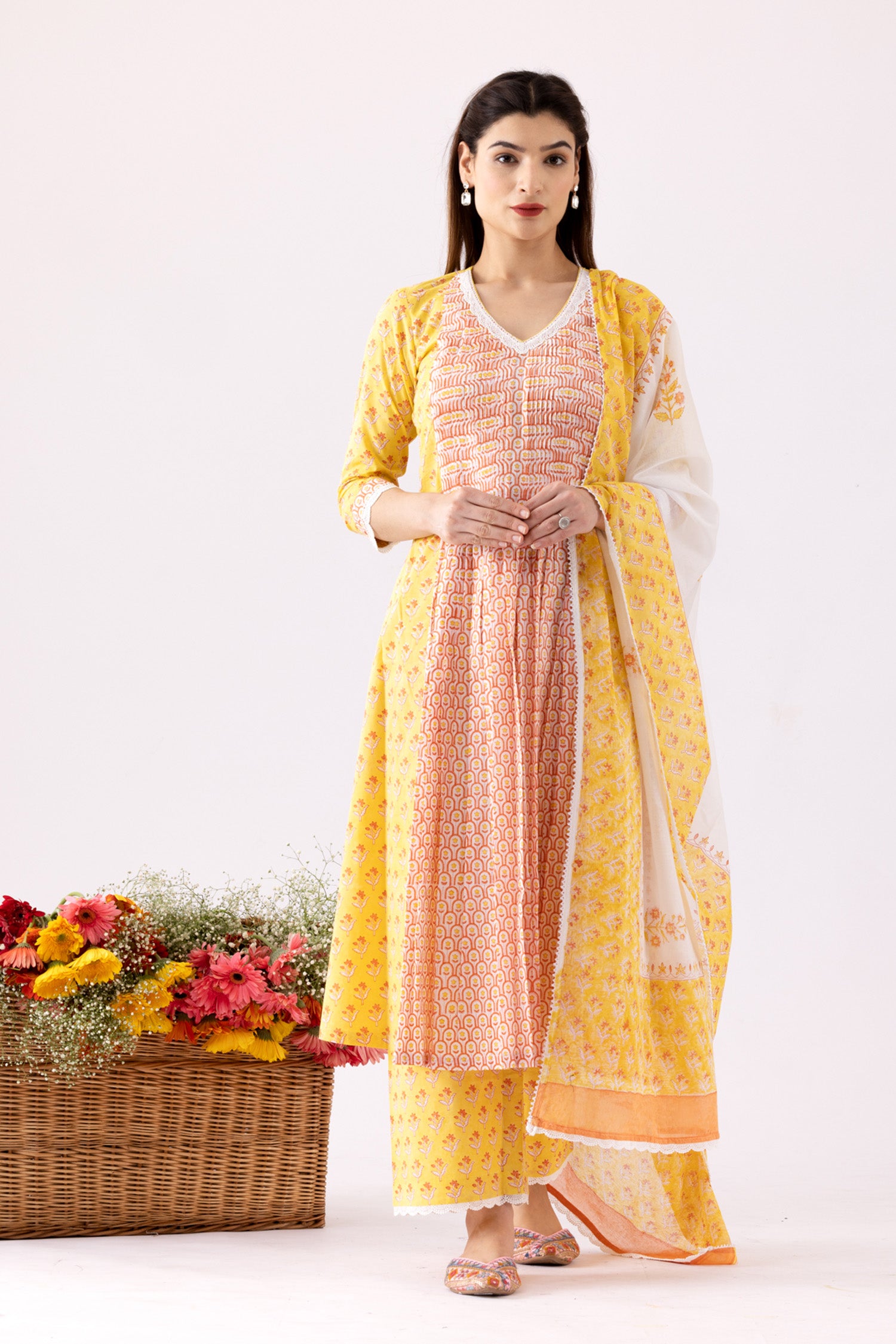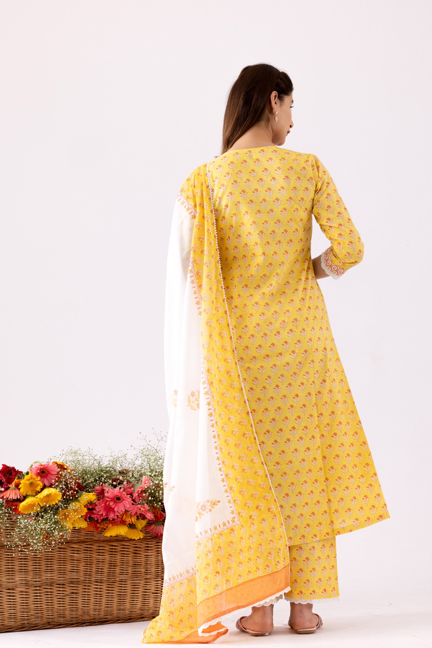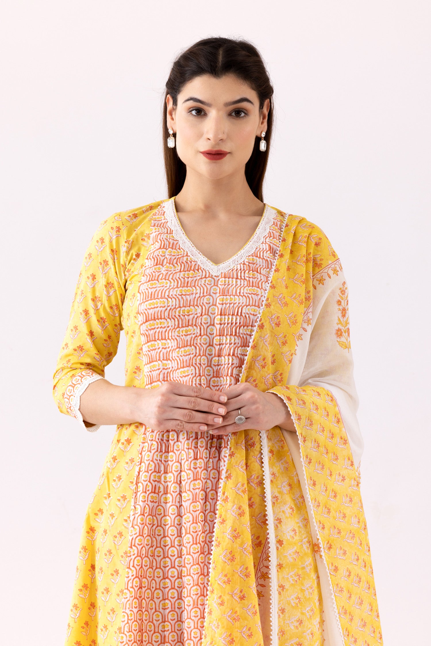 The Yellow Block Print Cotton V-Neck Anarkali with Lace finished Palazzo and dupatta for casual and simple yet Elegant look.