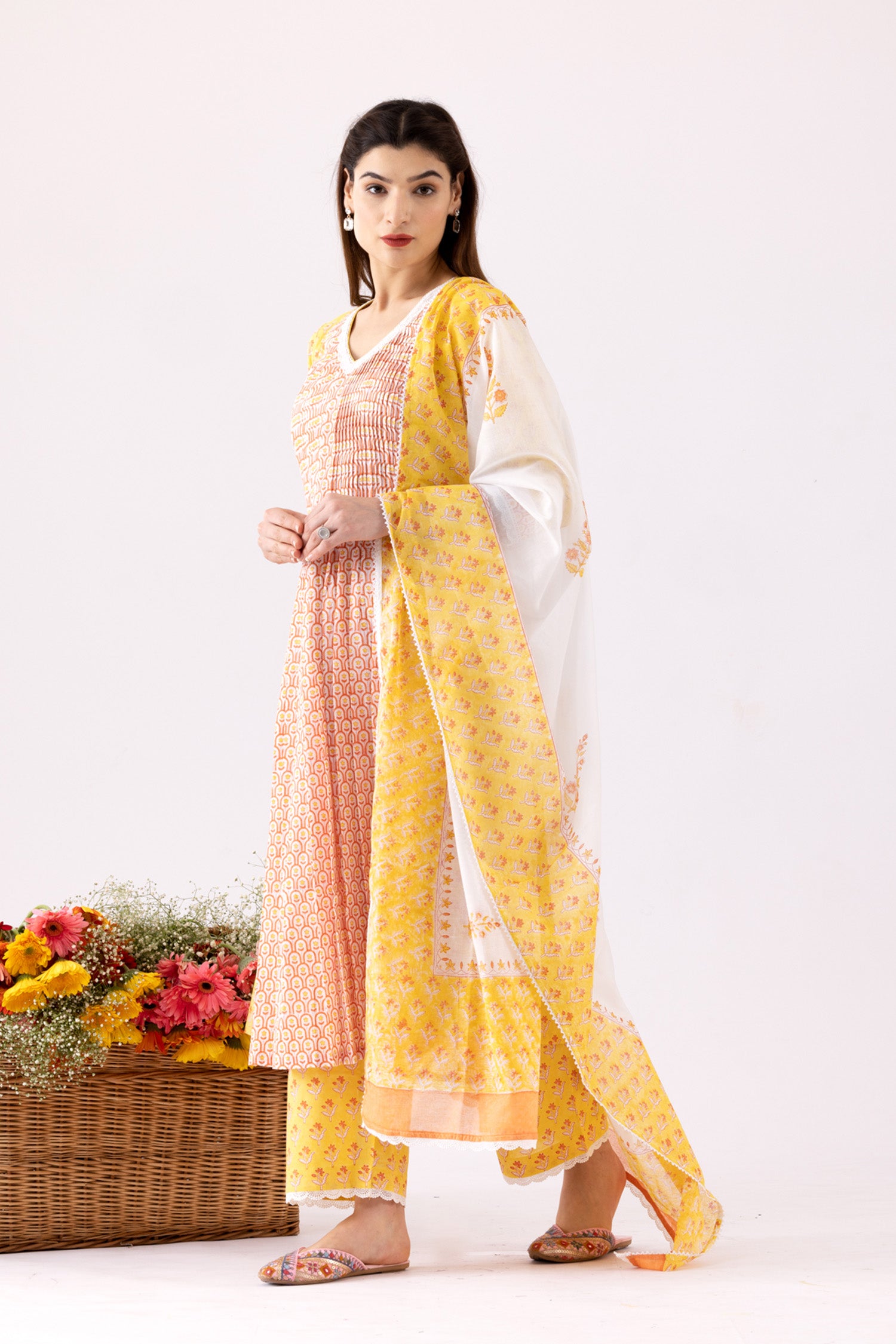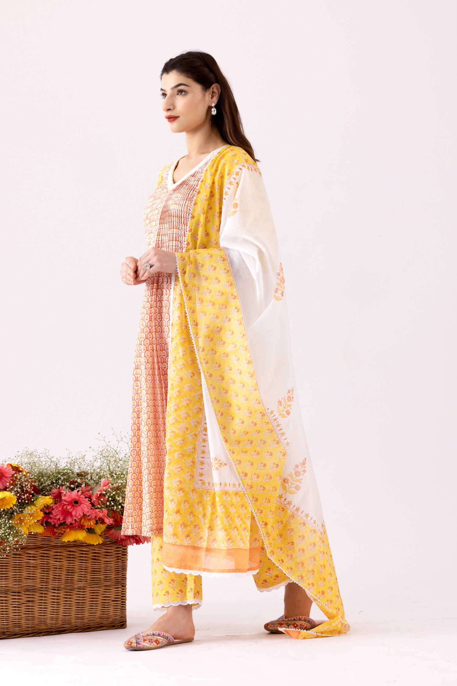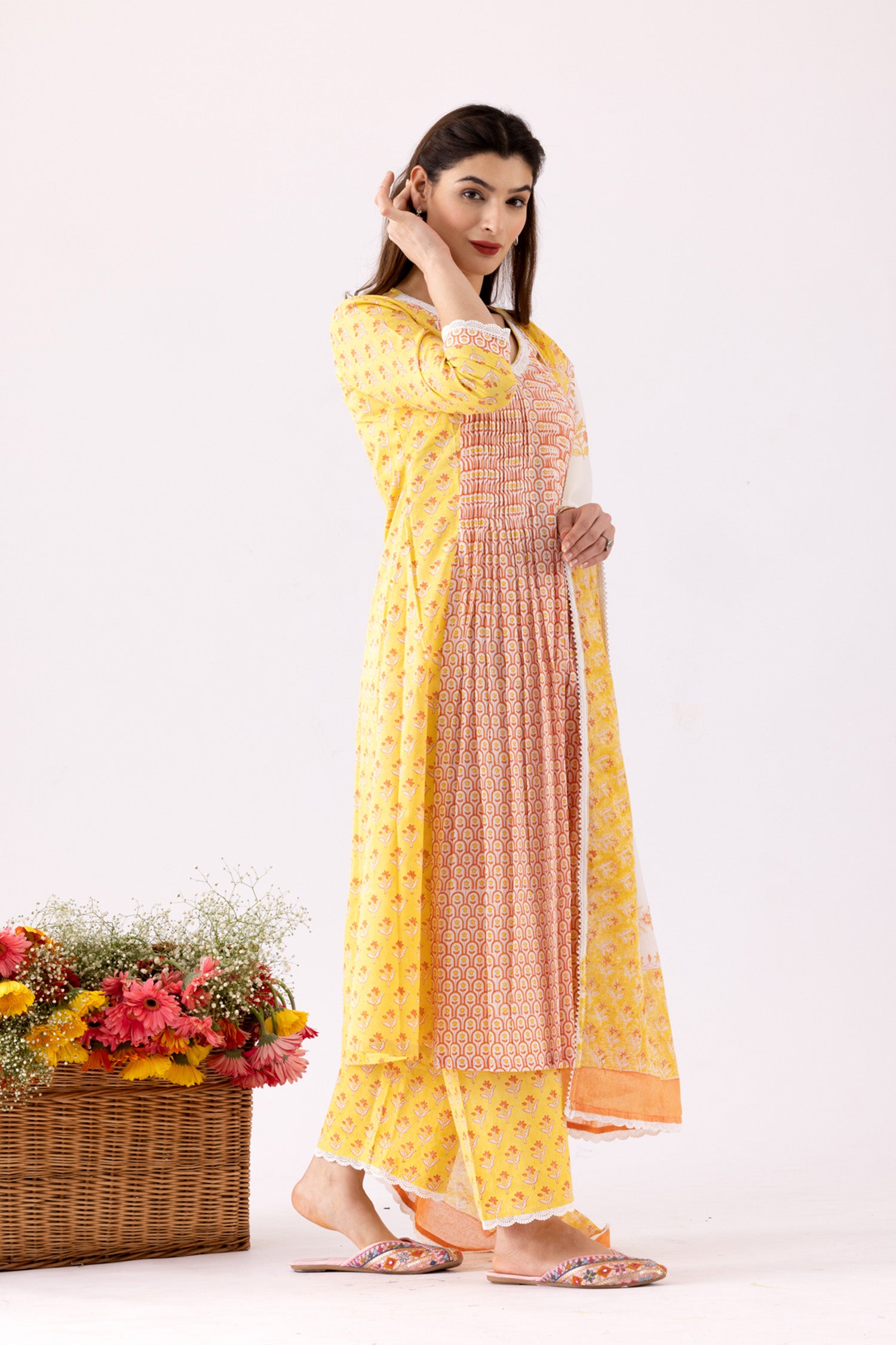 The Yellow Block Print Cotton V-Neck Anarkali with Lace finished Palazzo and dupatta for casual and simple yet Elegant look.