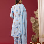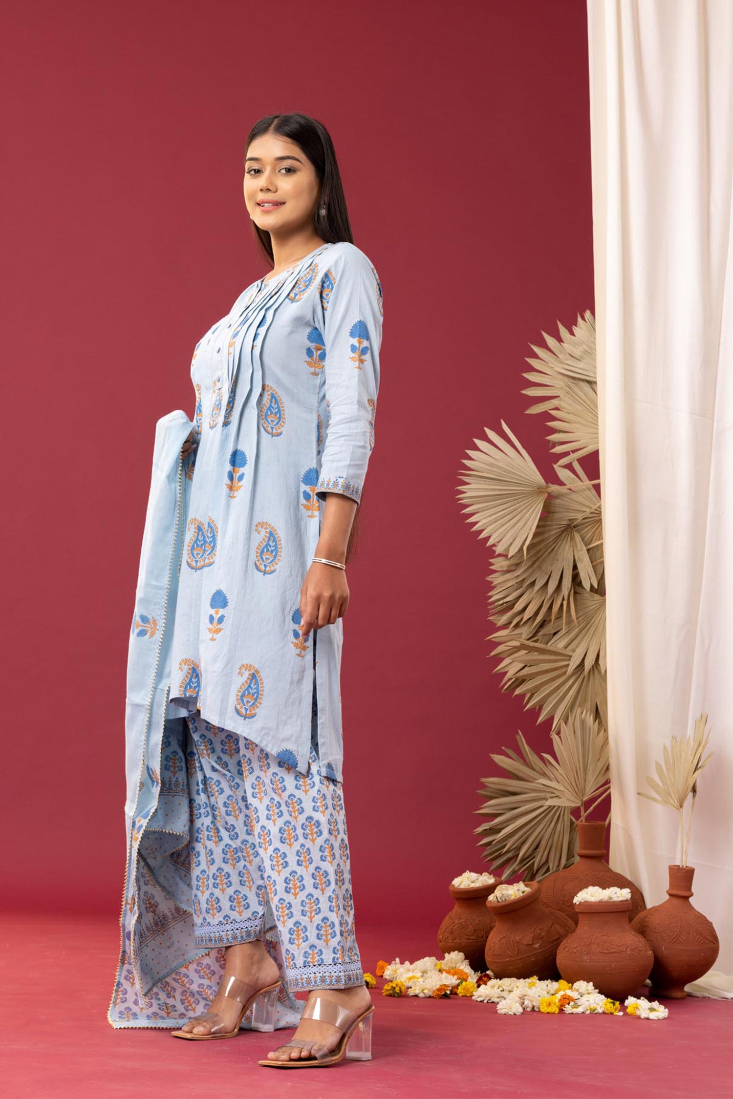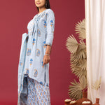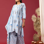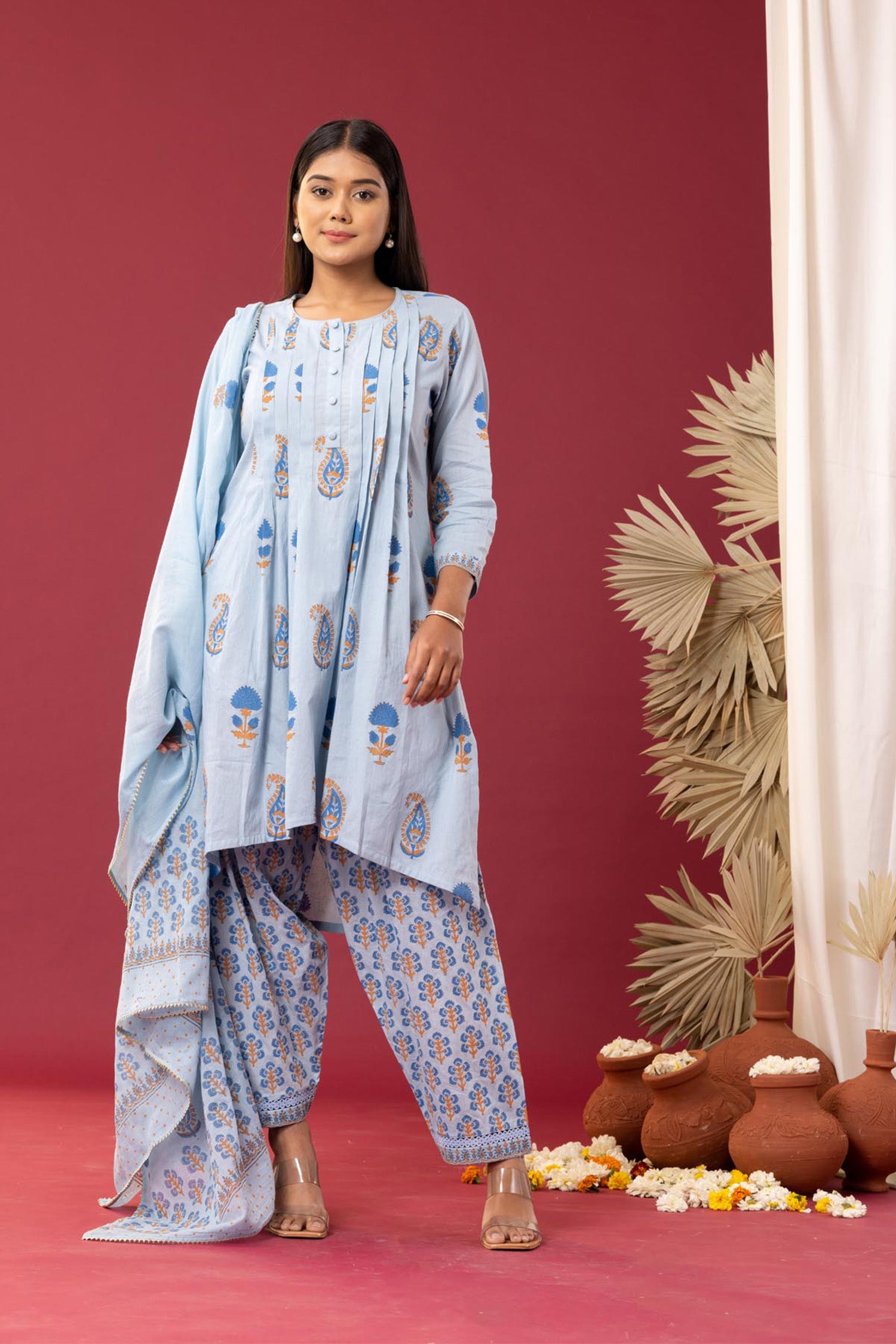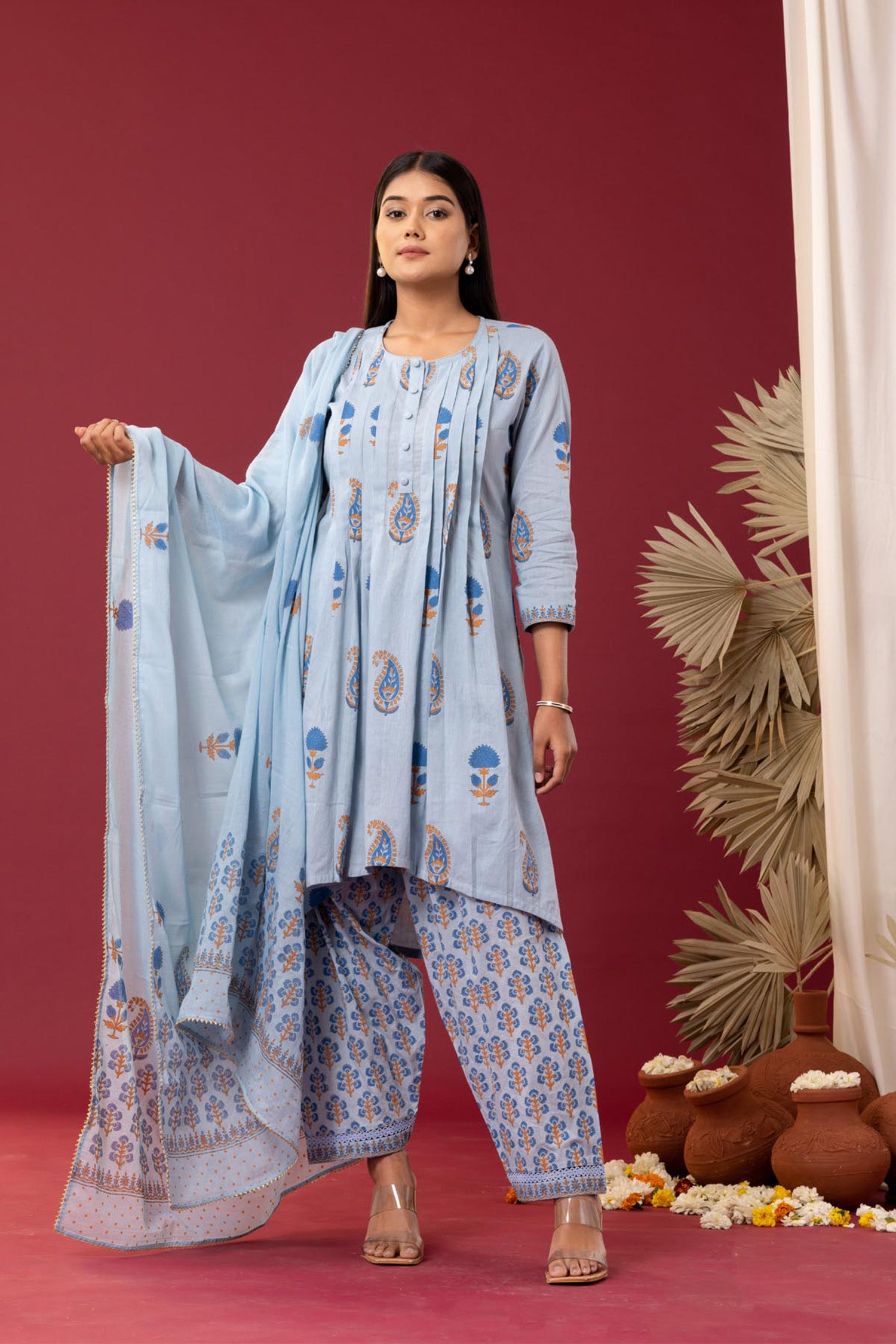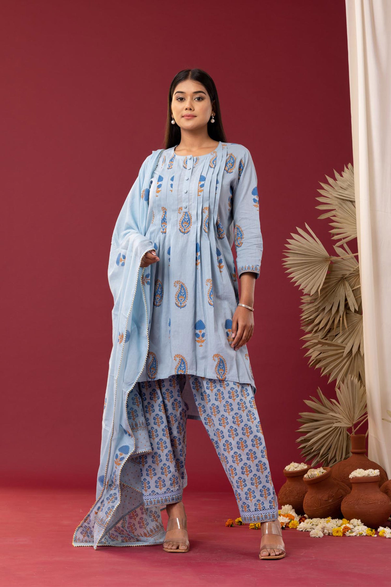 Block Printed Blue Cotton Cambric Gathered Kurti Set