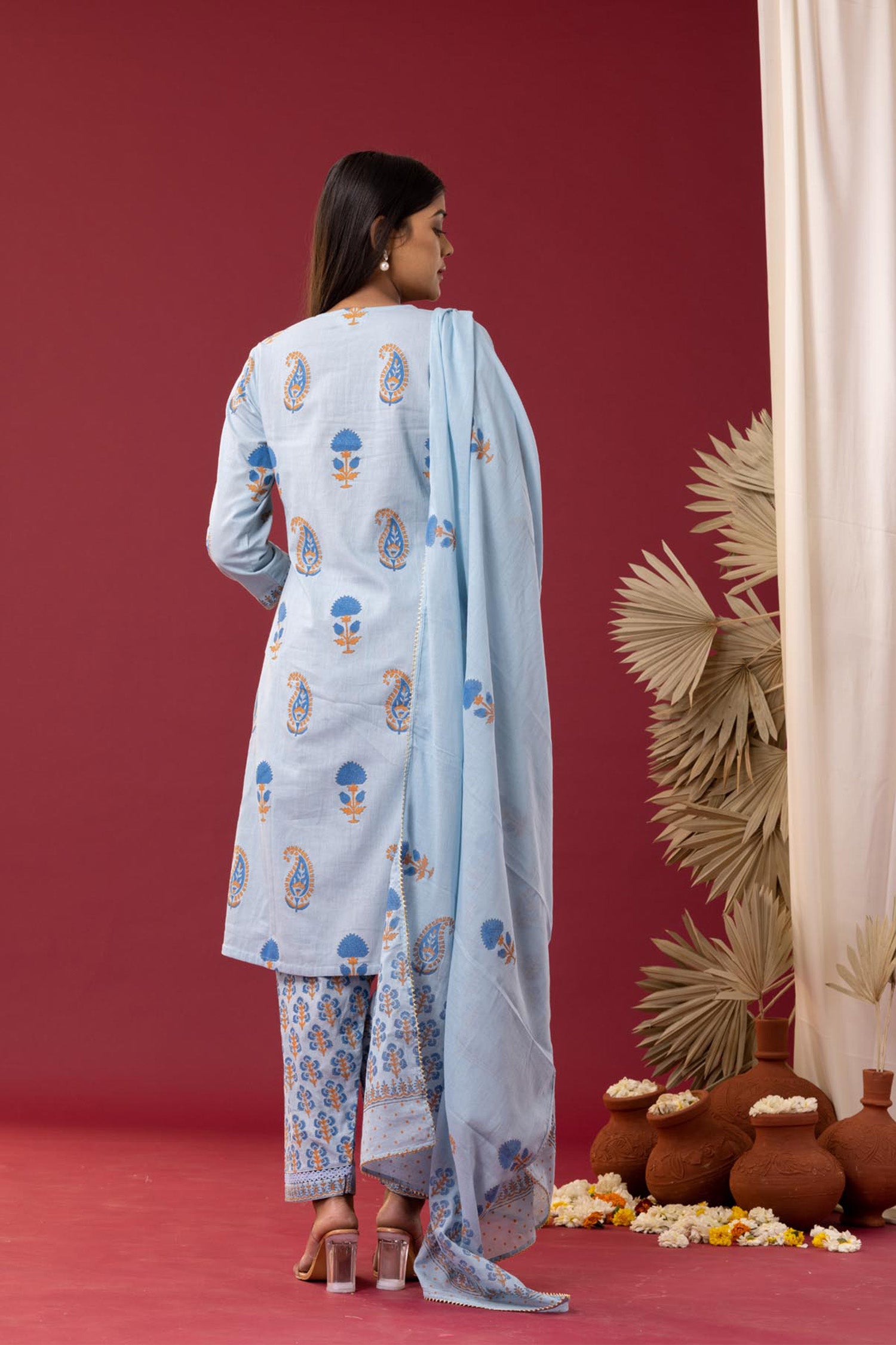 The beautiful floral Pattern printed cotton kurti along with the matching pant and dupatta with a floral design for a Neat and elegant look carried with comfort.