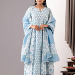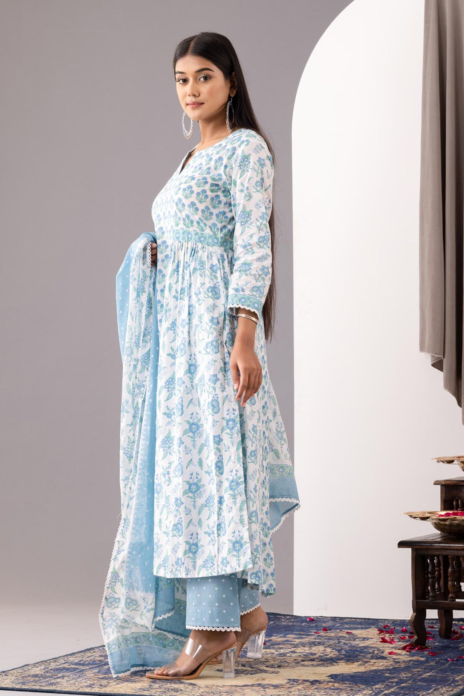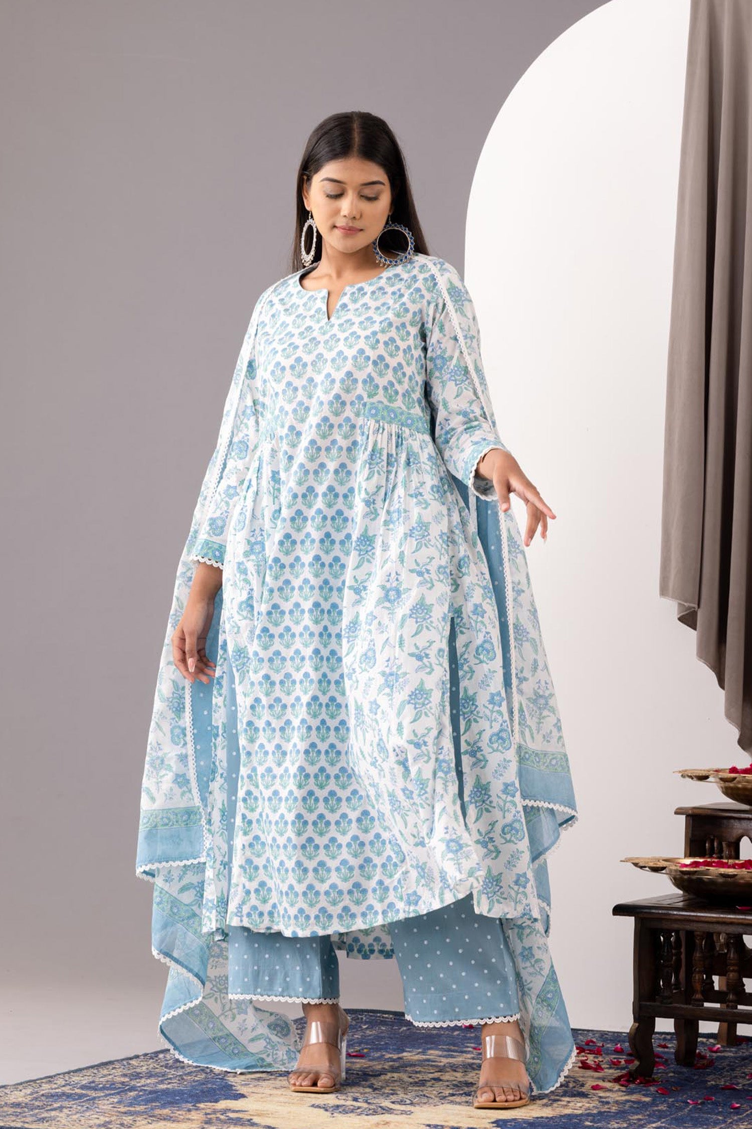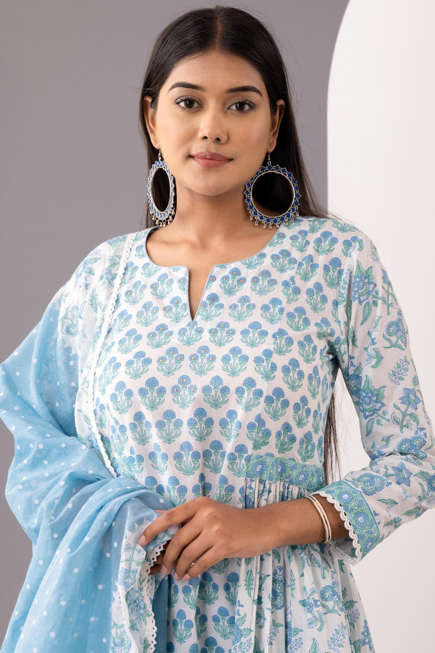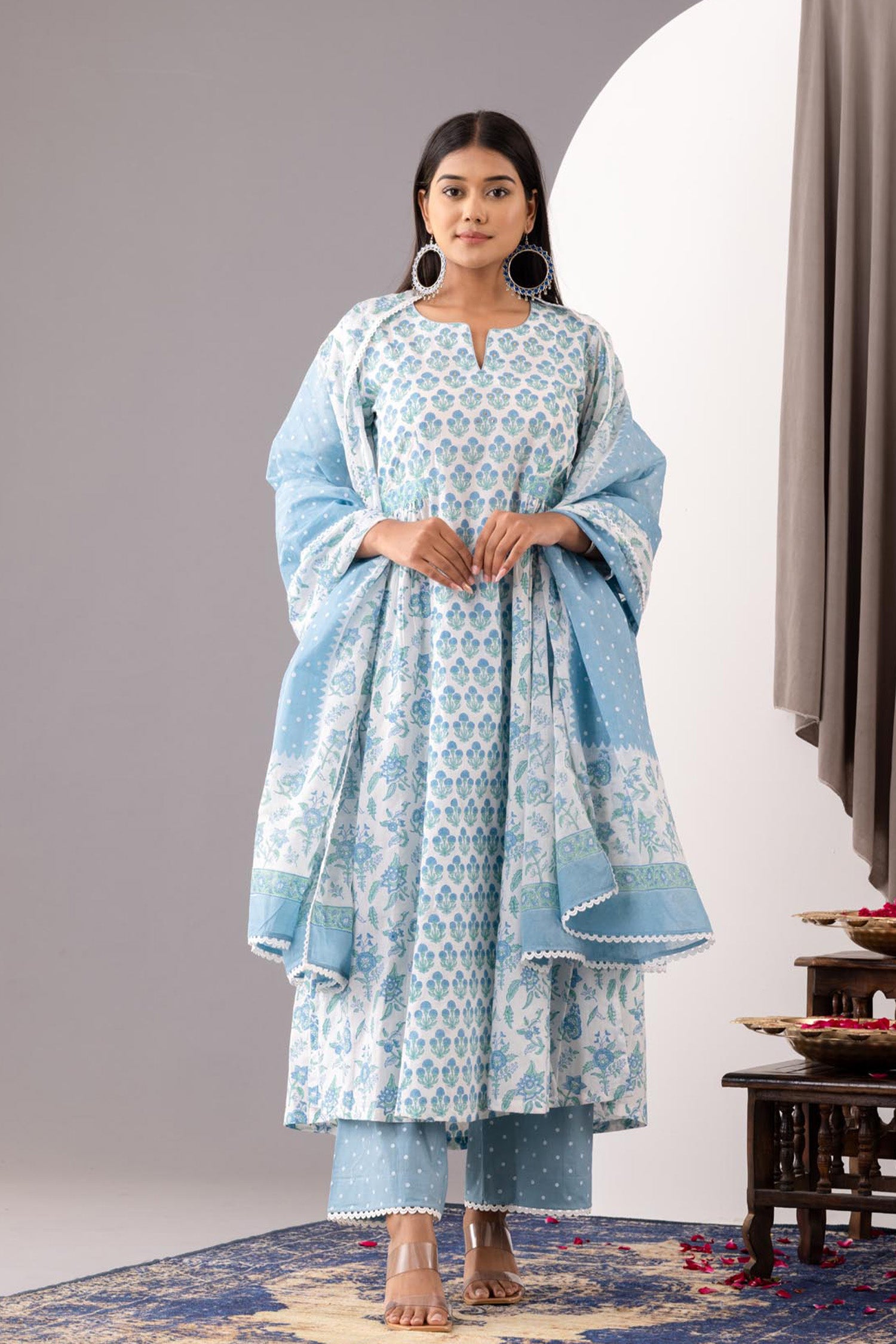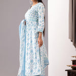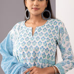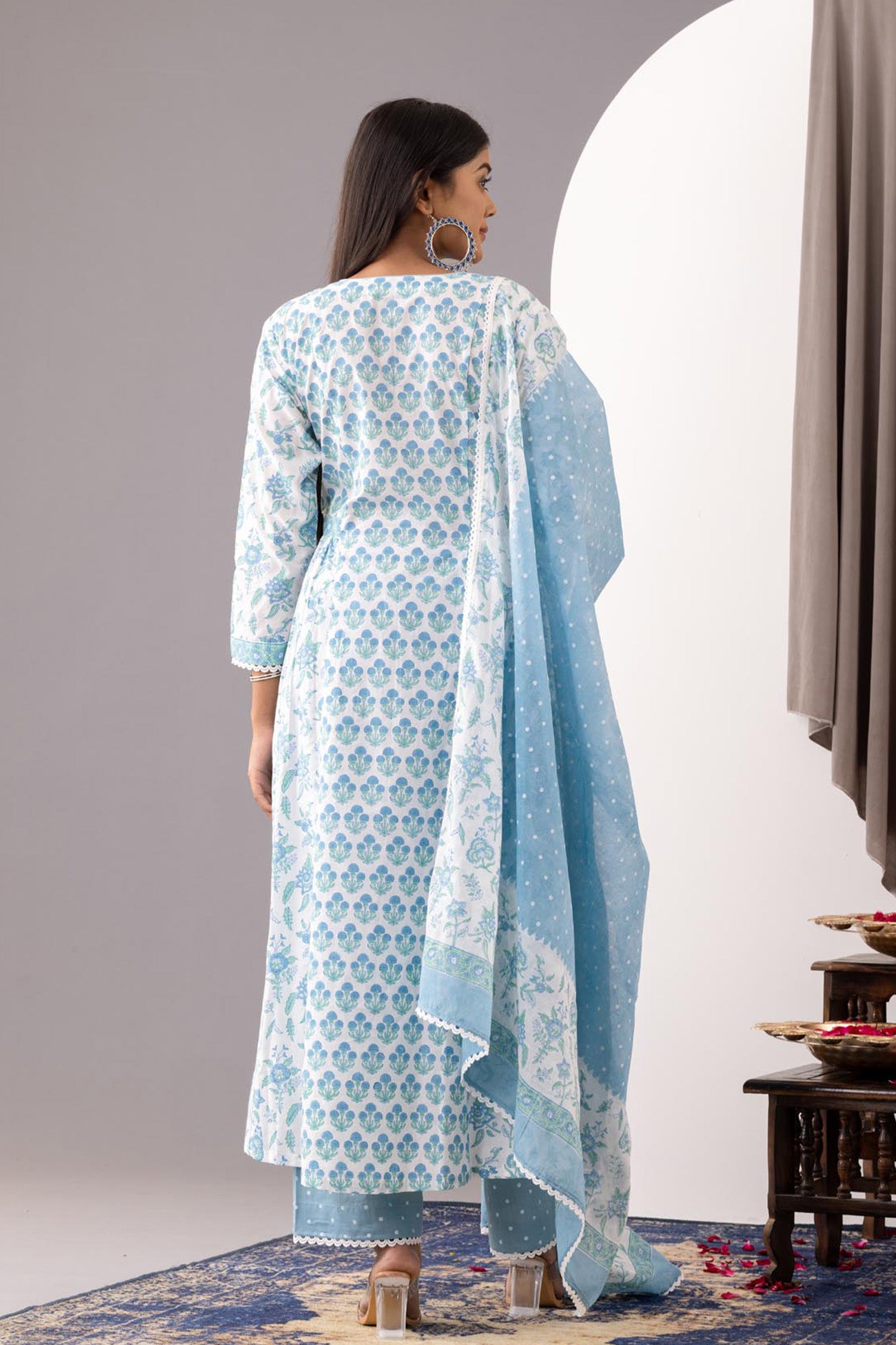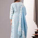 Block Printed Blue Cotton Kurta Set With Dupatta