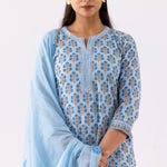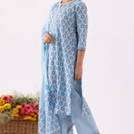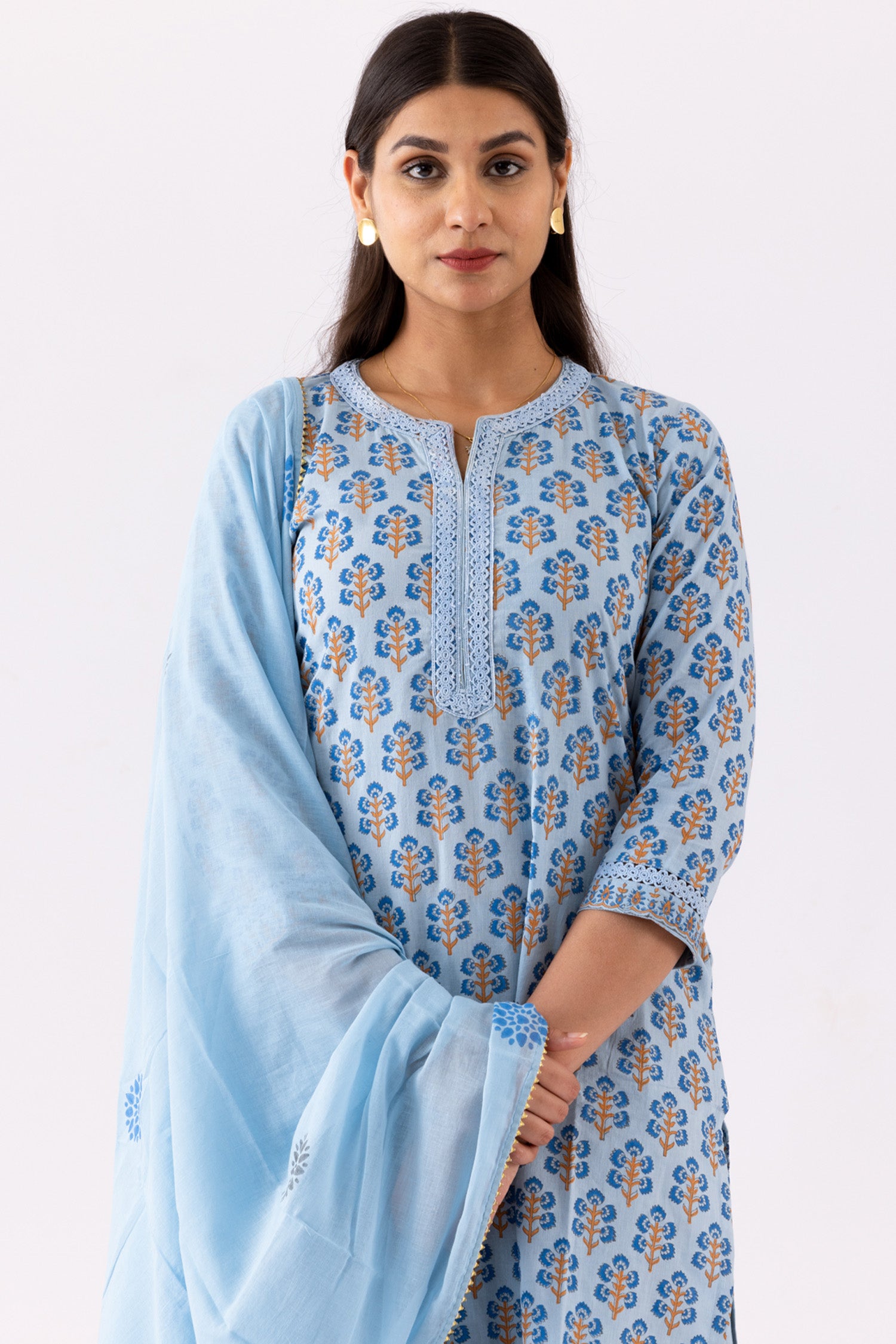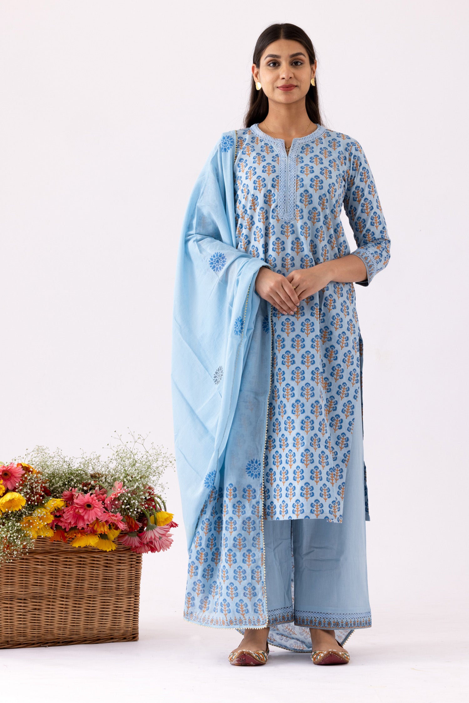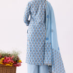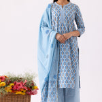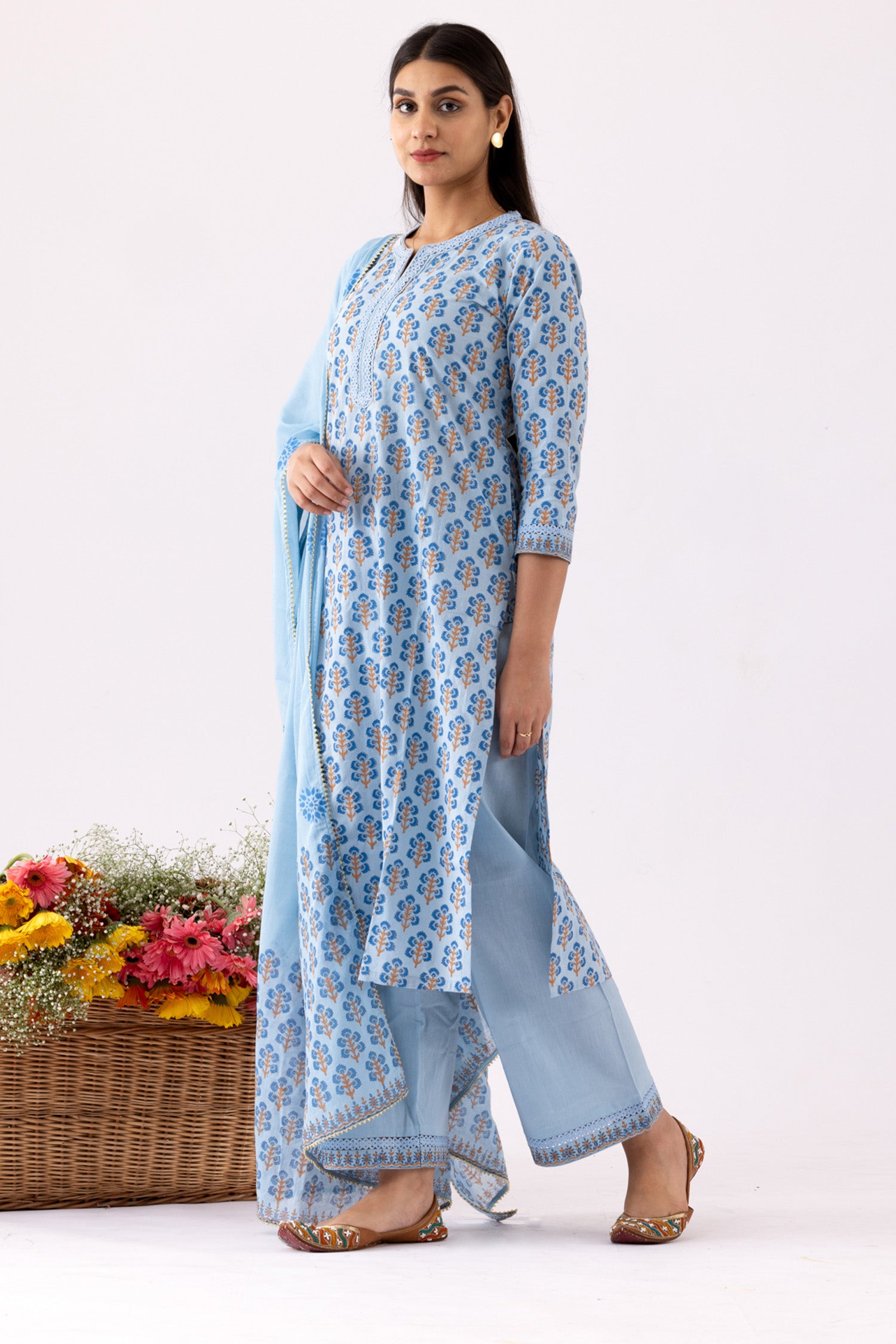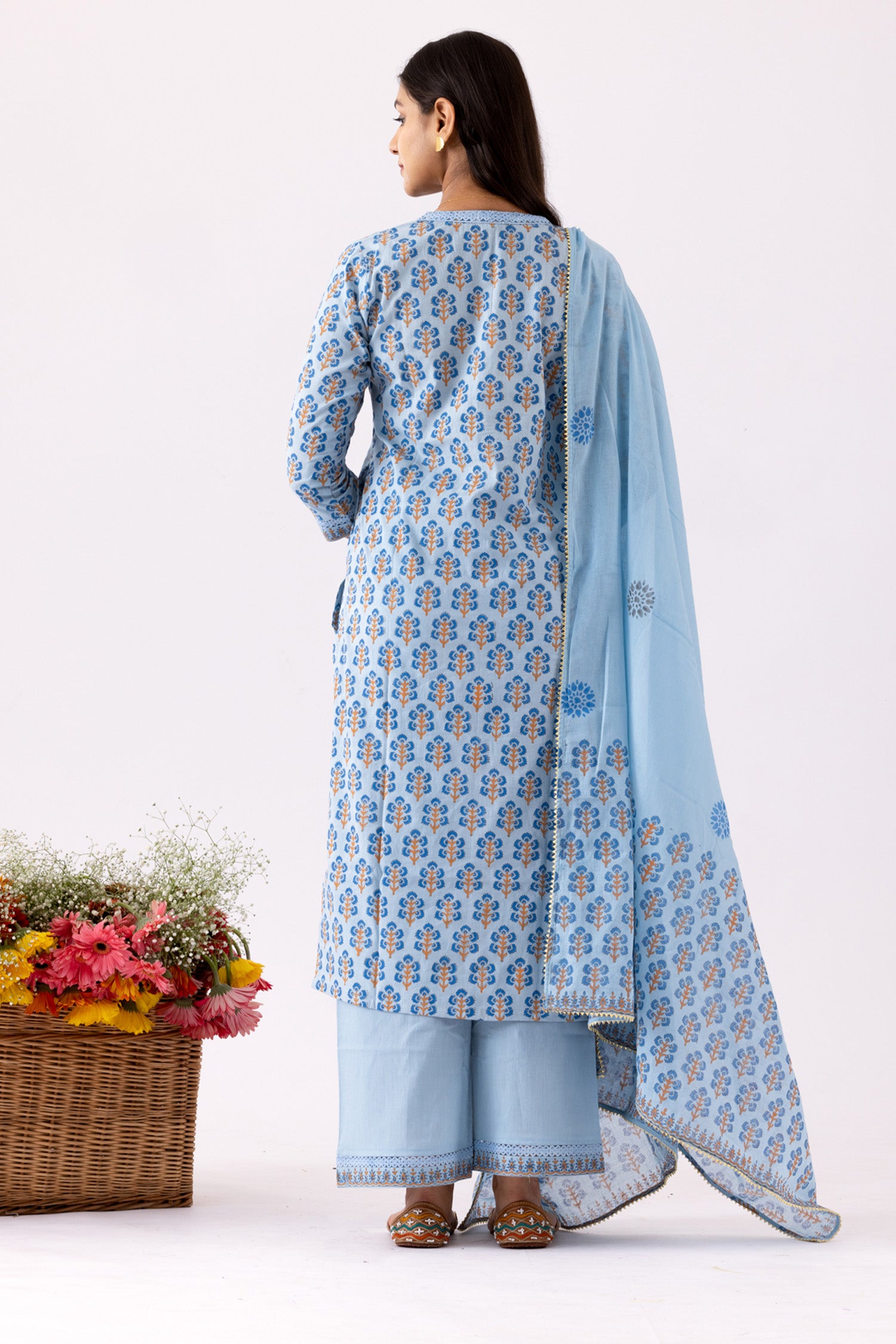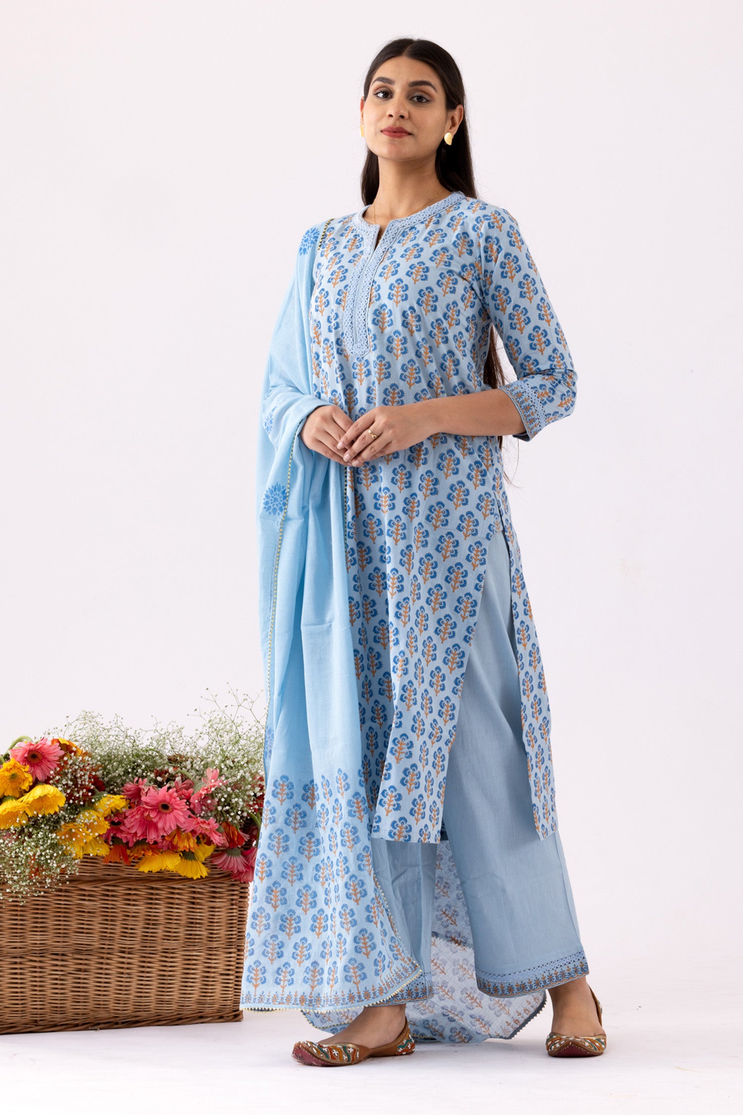 Block Printed Blue Cotton Straight Kurta With Palazzo Set