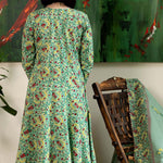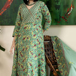 The Suit set features a beautiful hand block print in a dark green colour palette. It is adorned with floral and paisley pattern which is paired with the comfortable and matching pants. The breathable cotton maintains it's style and comfort also suitable for casual and festive occasions.