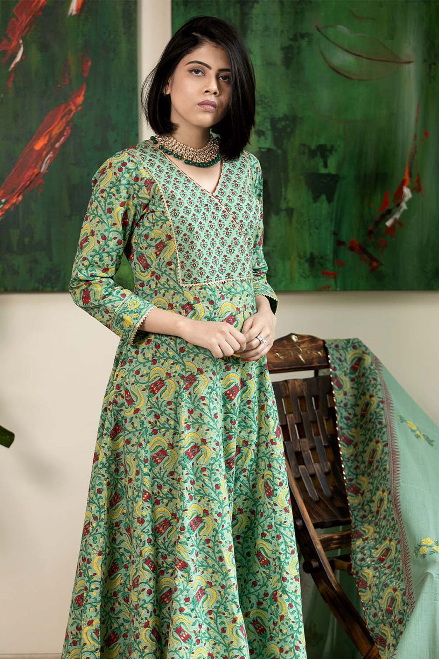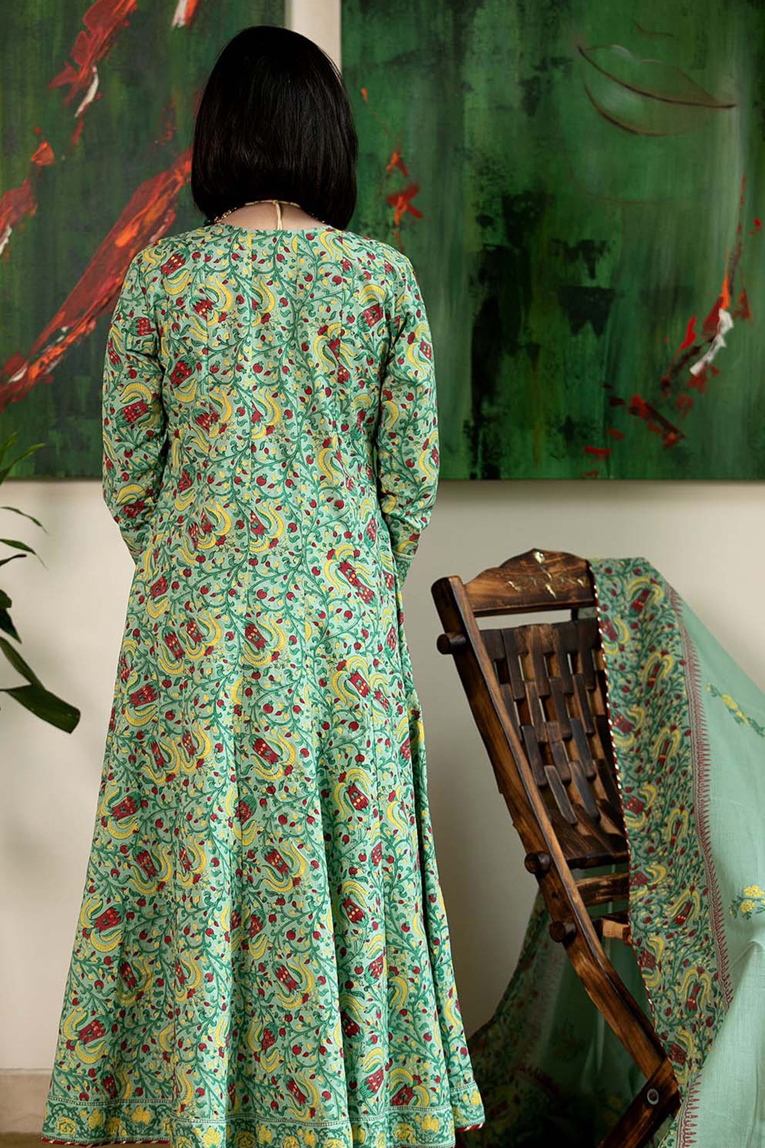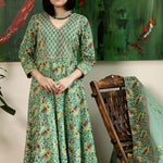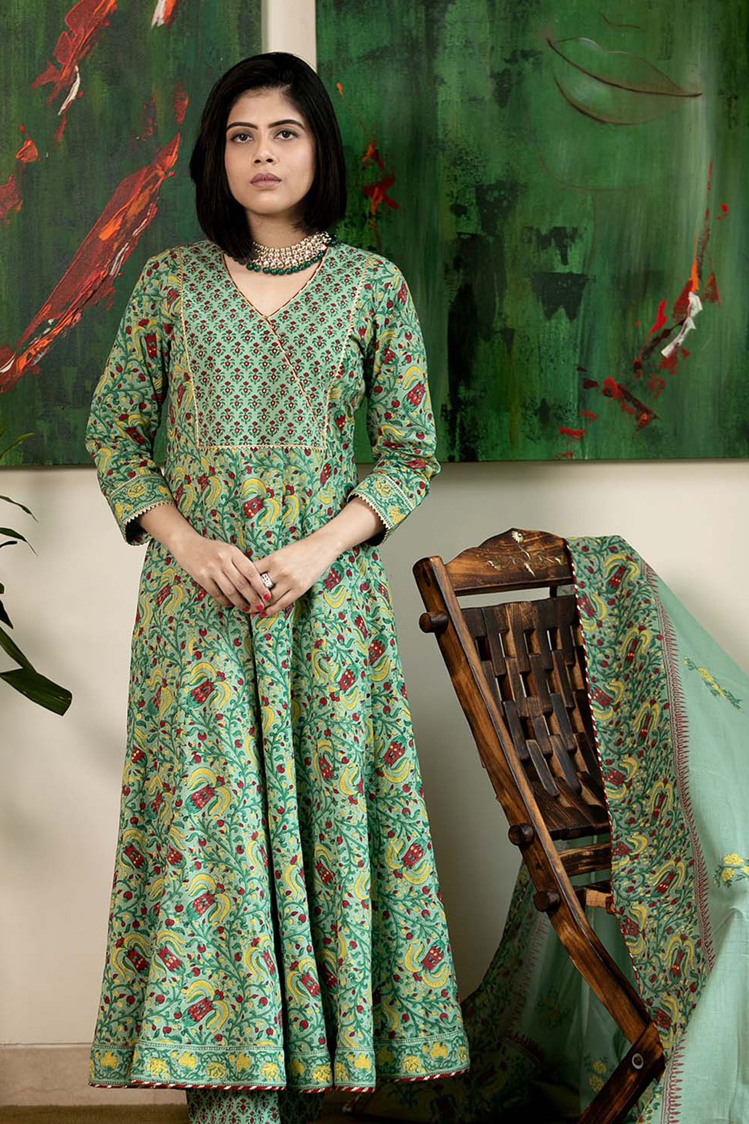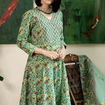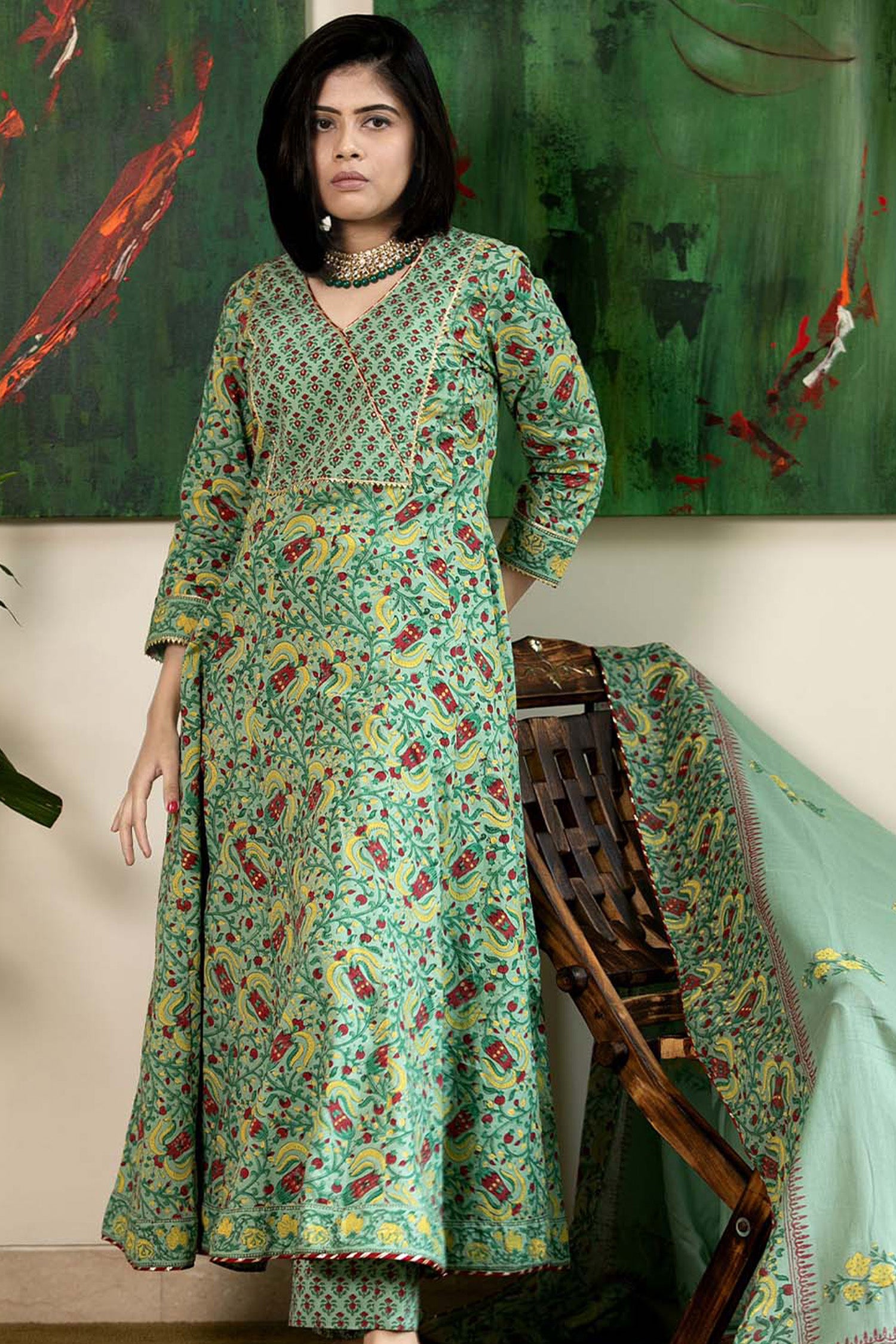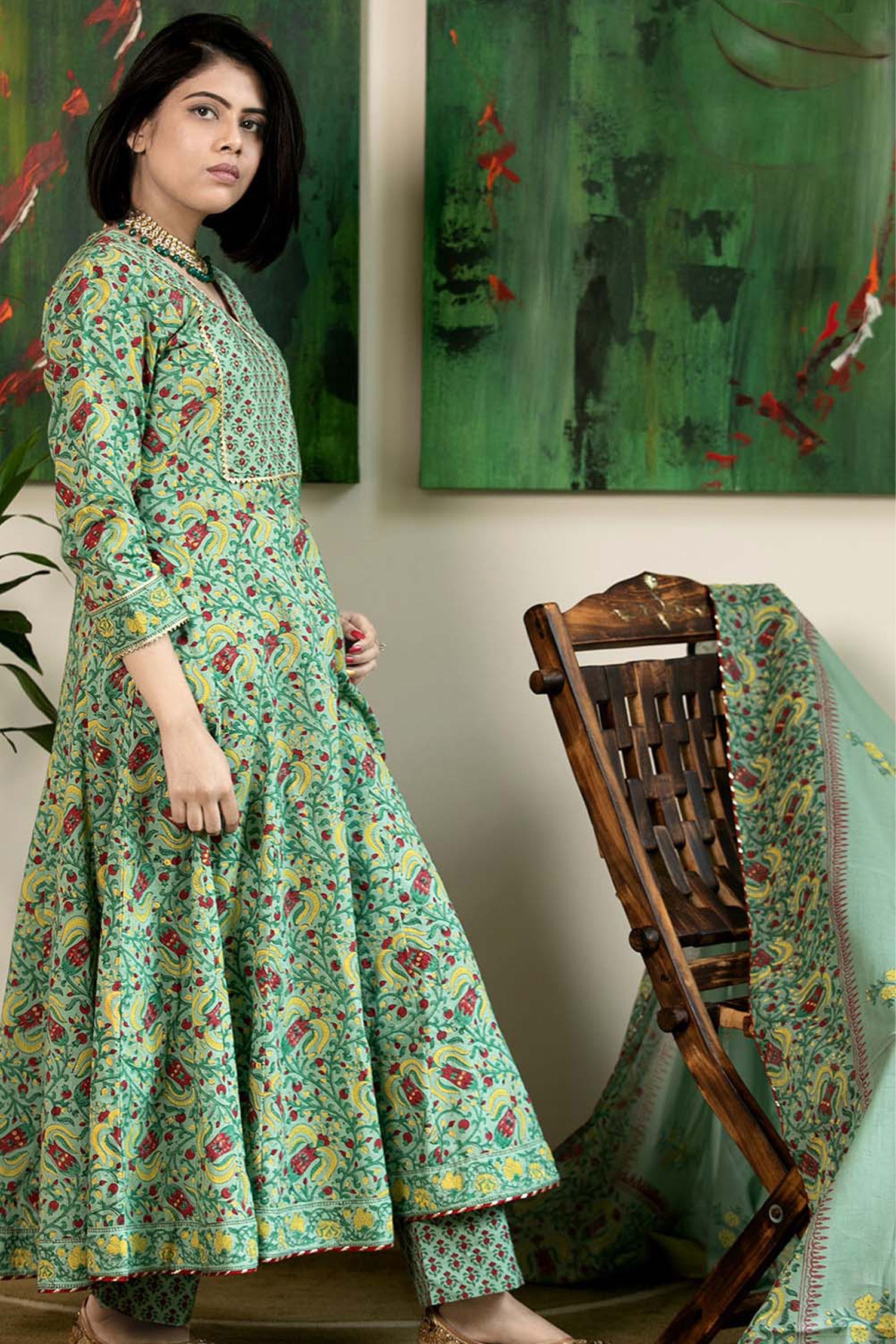 Block Printed Dark Green Cotton Suit Set Floral Patterns