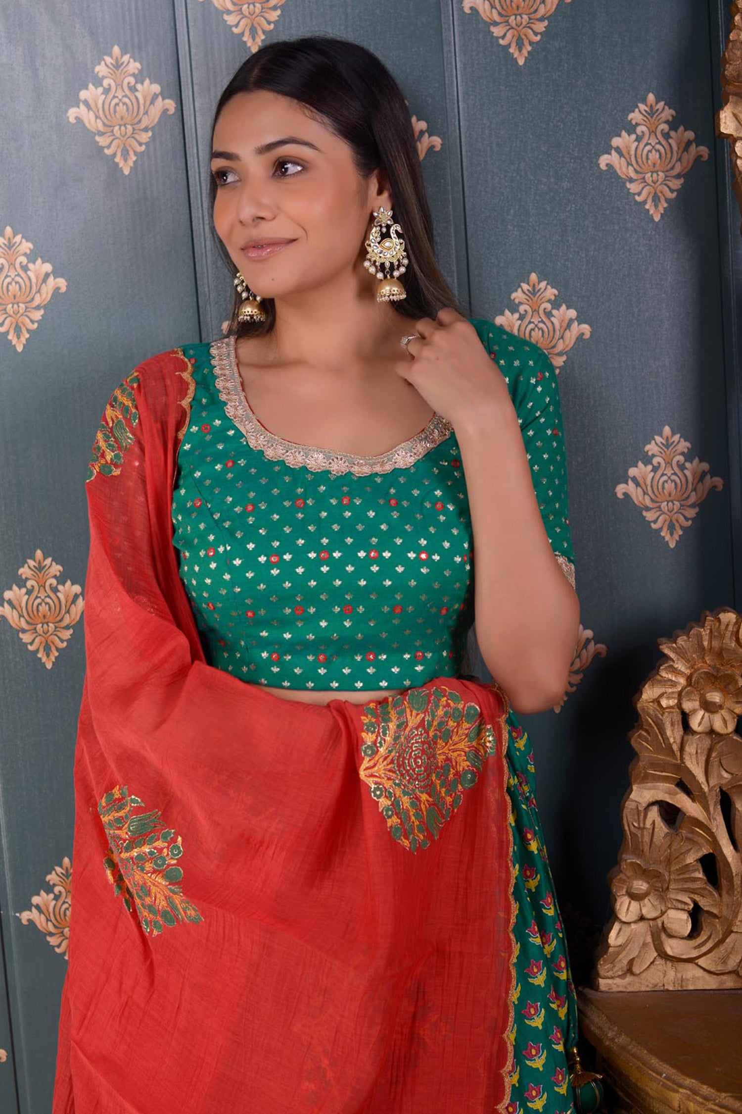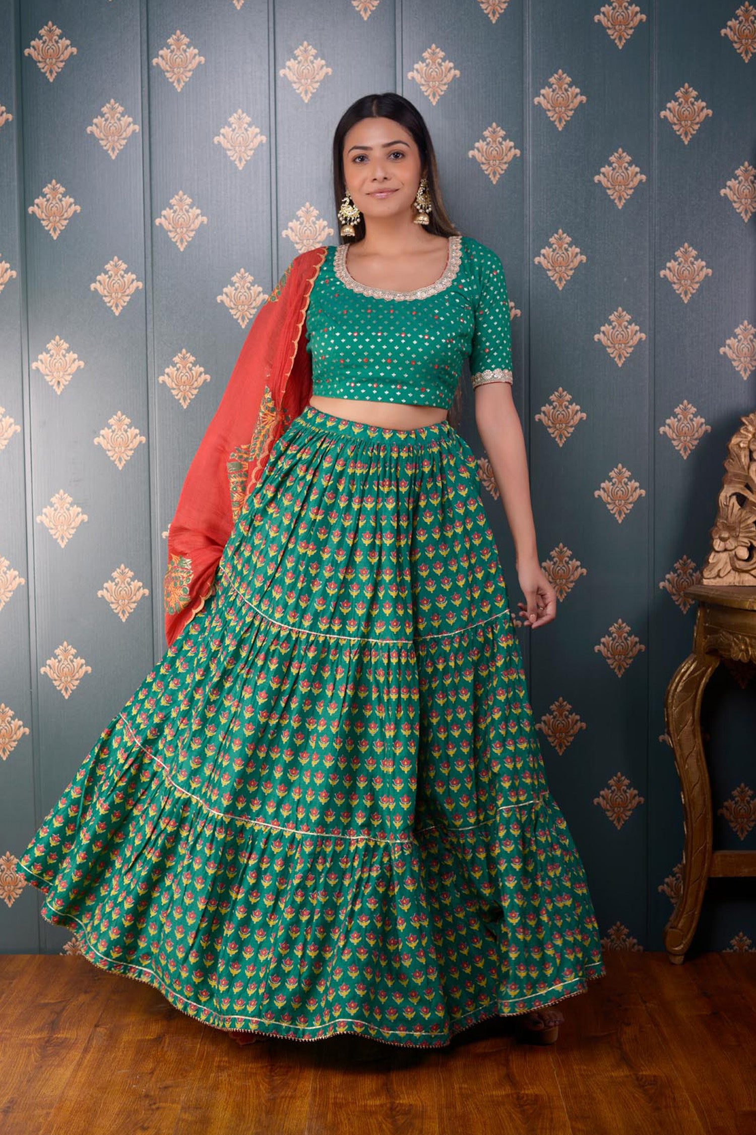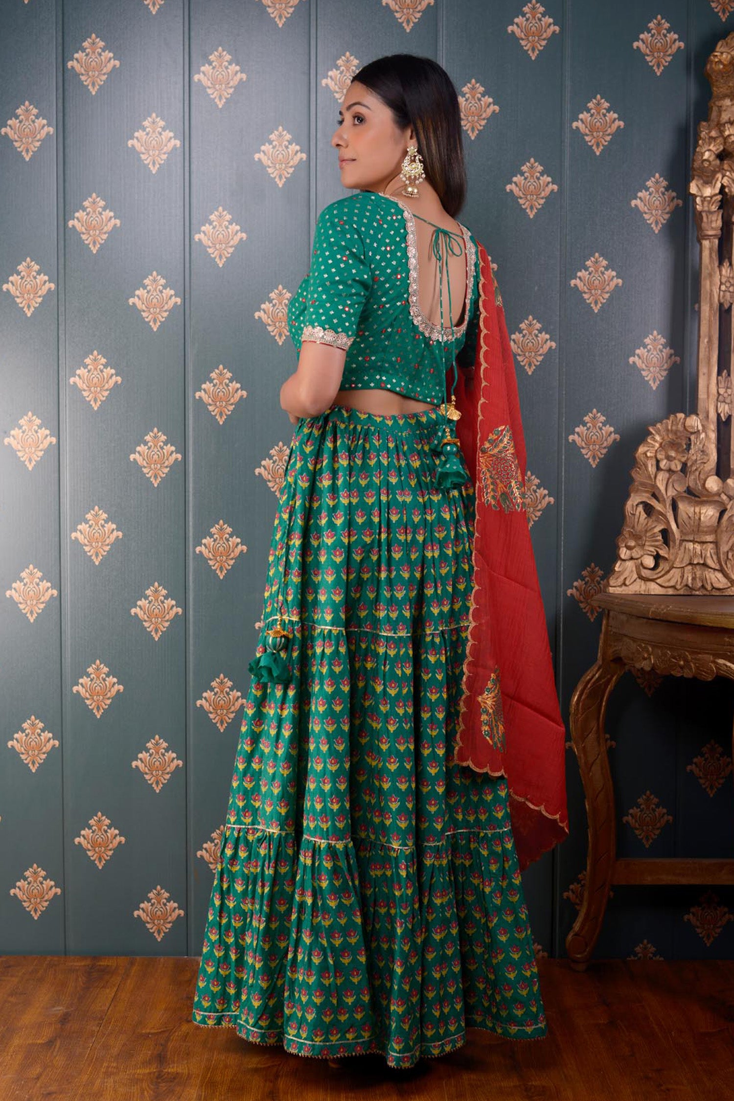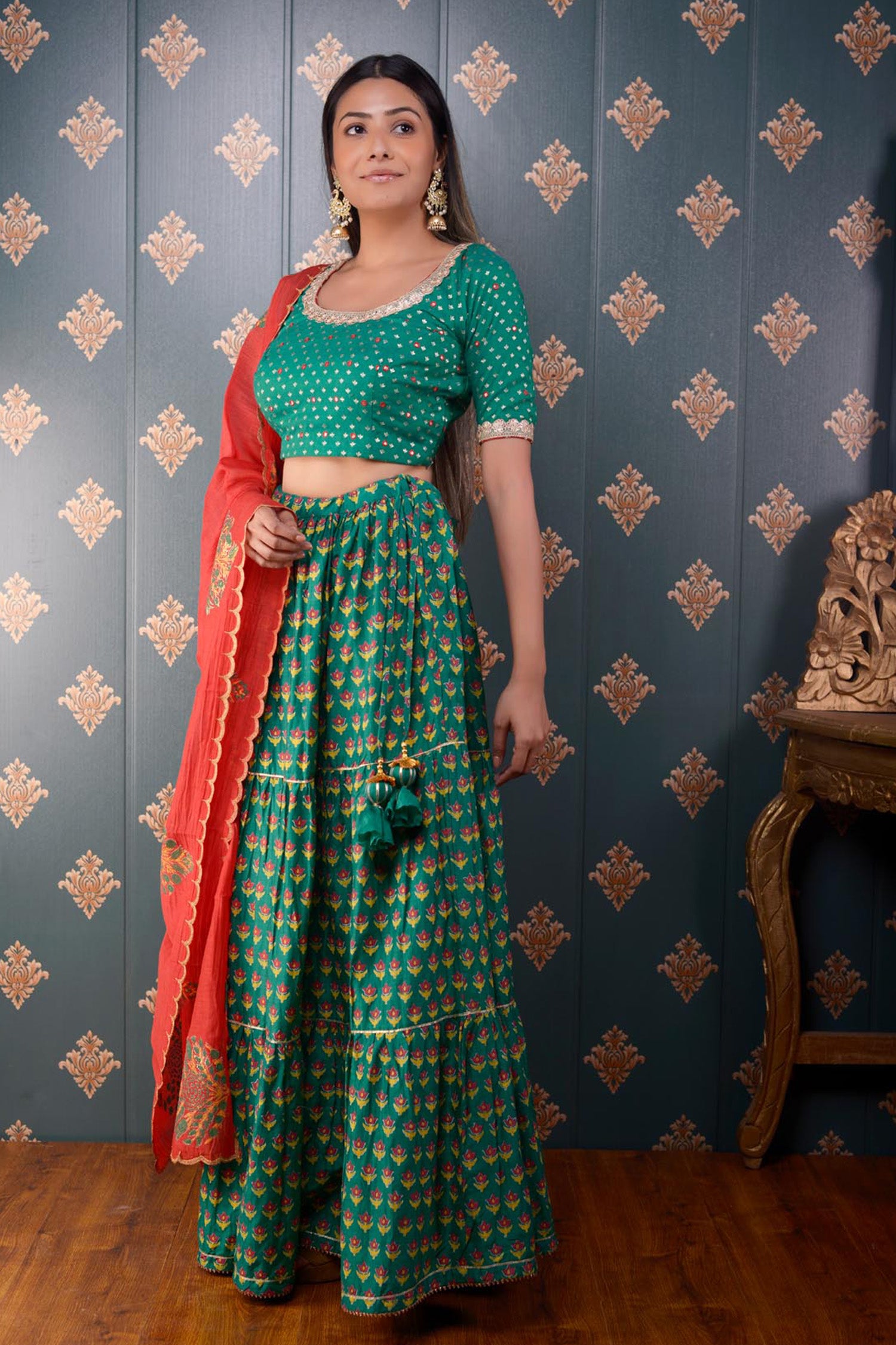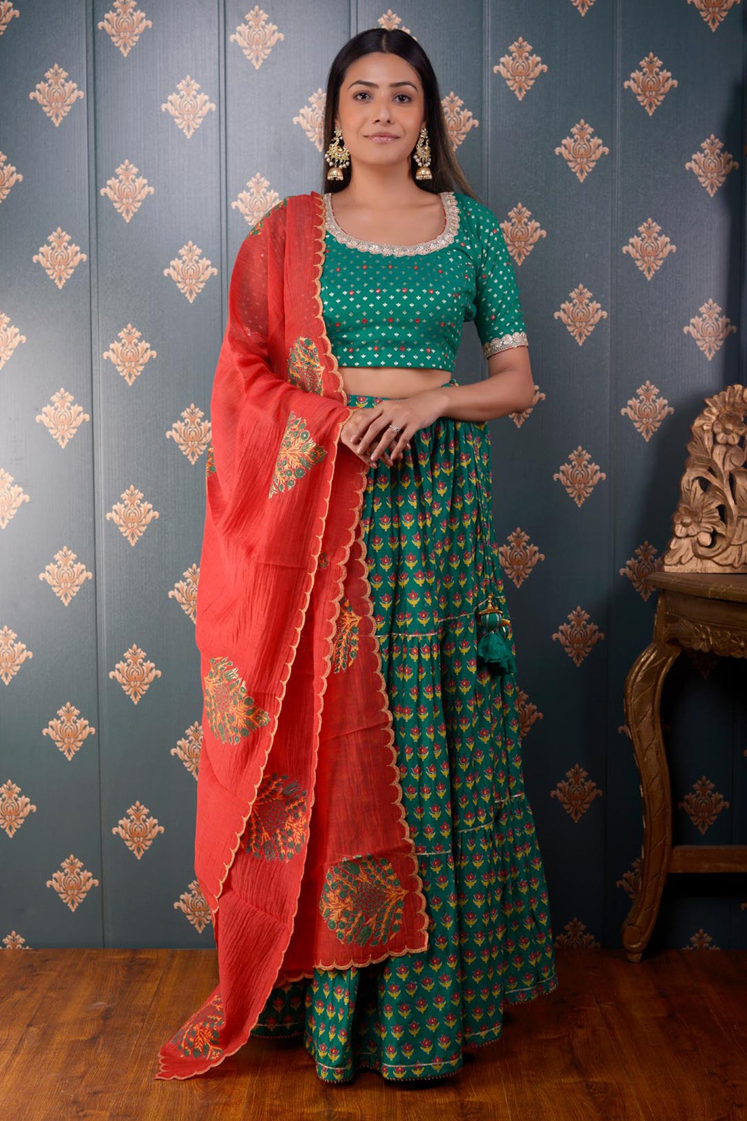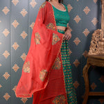 The Lehenga set includes Green Block Print Cotton Silk Lehenga With Gotta Finish And Banarasi Butti Chandary Hand Embroidery Blouse With Lace Finish and Scalping Chanderi Dupatta