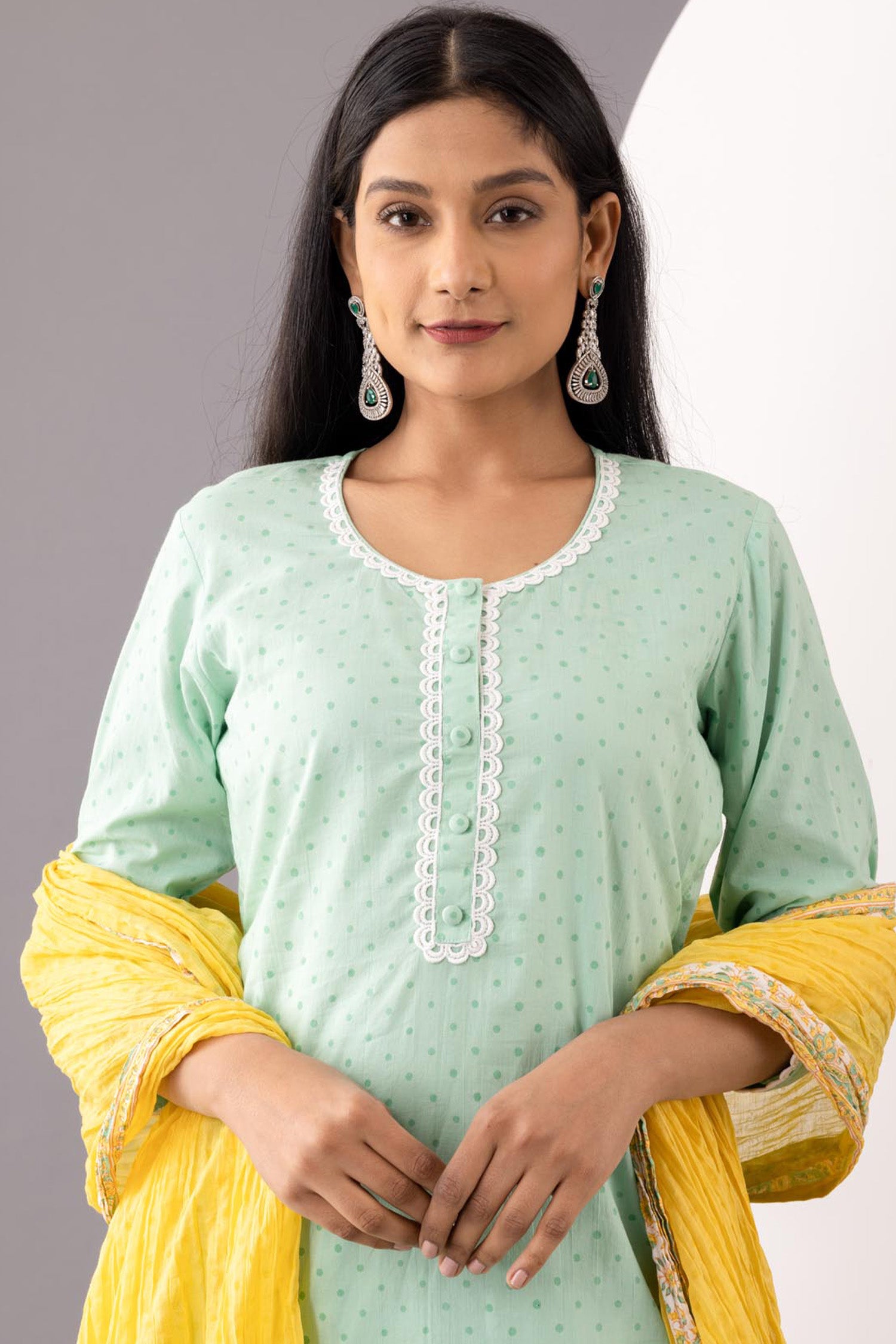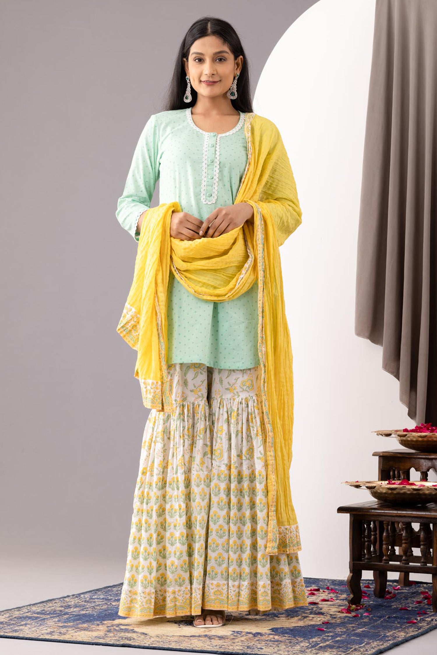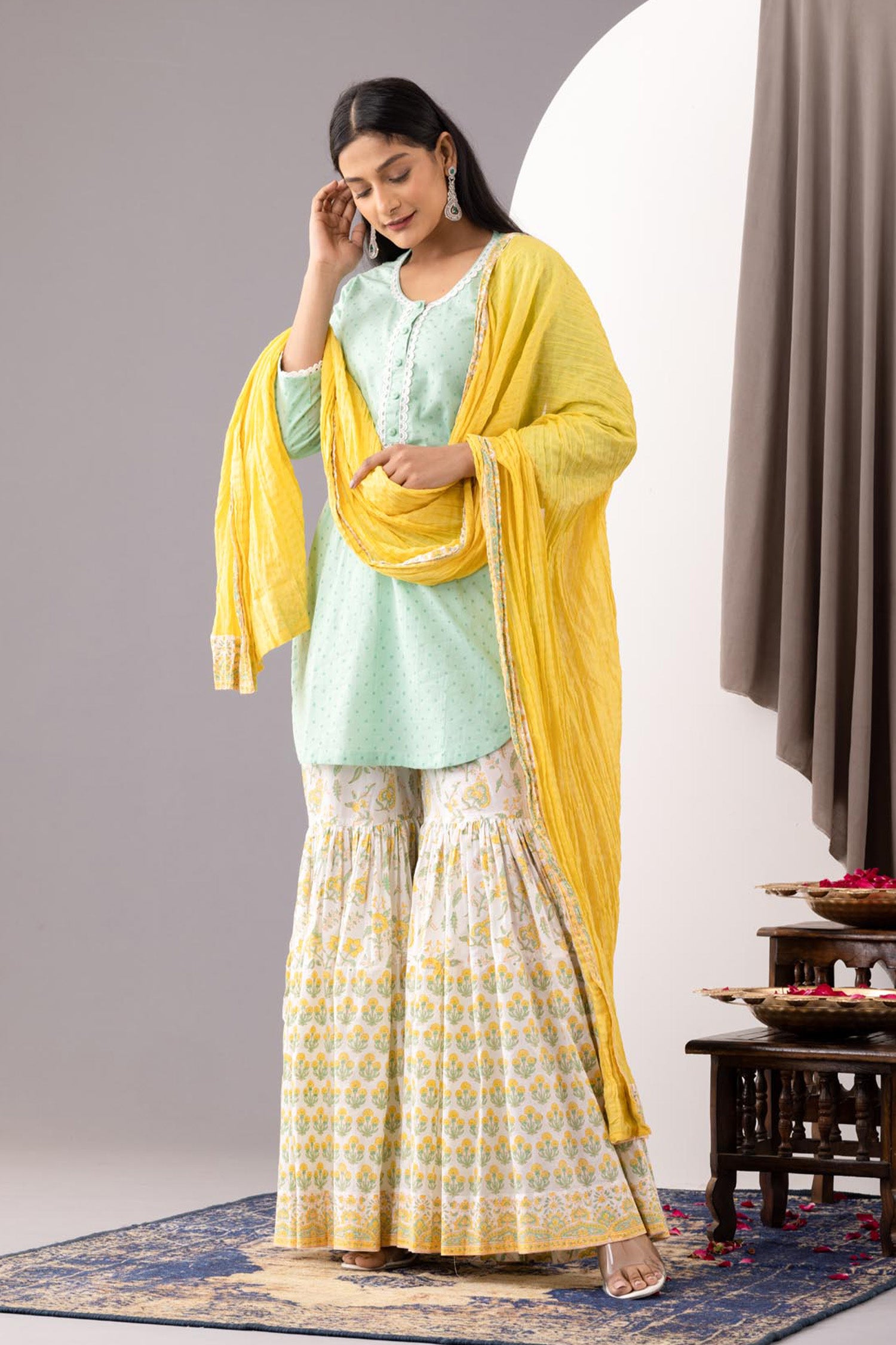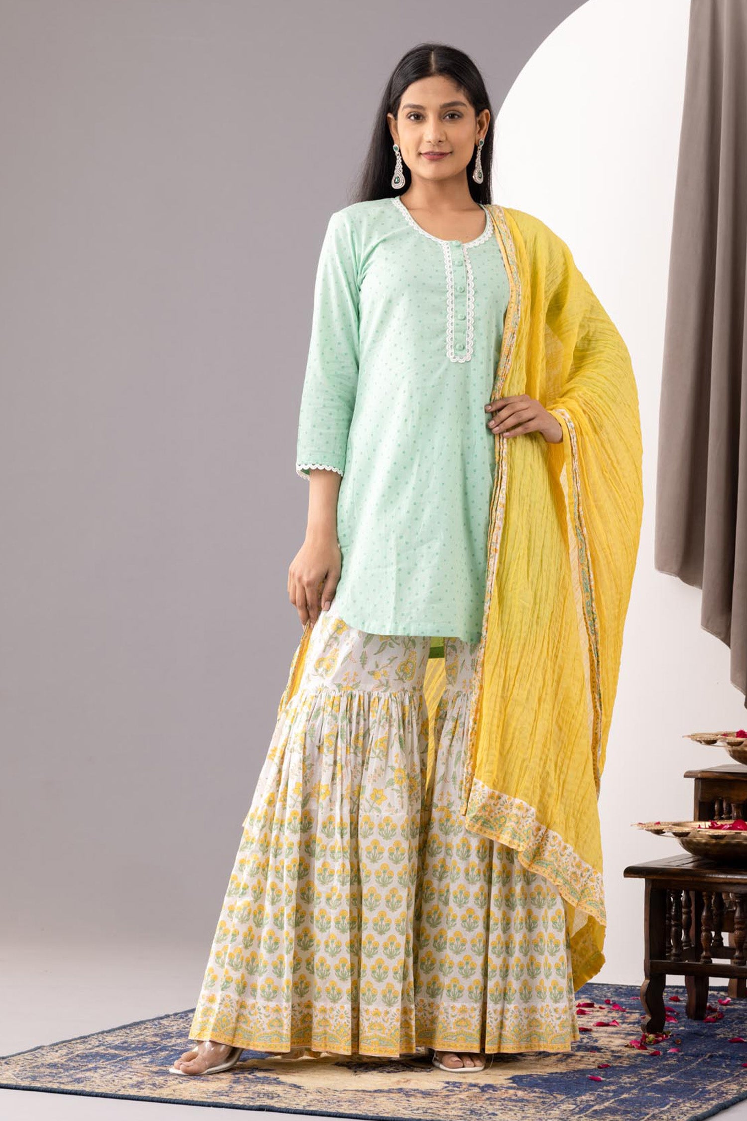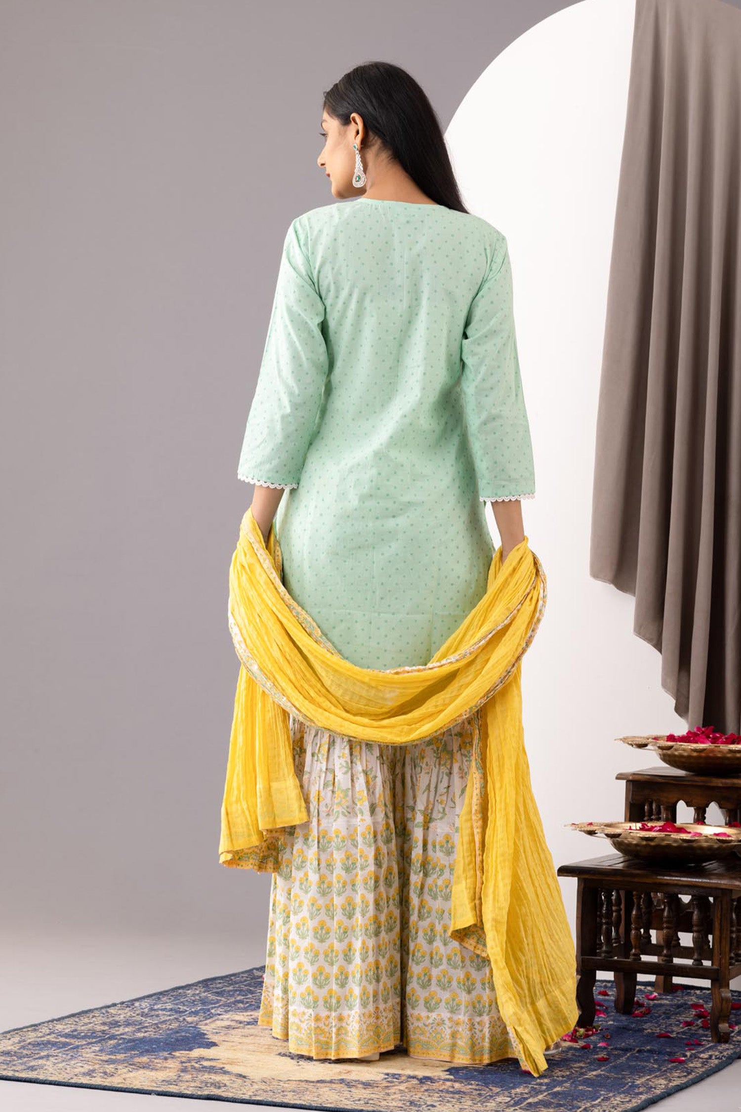 Block Printed Light Green Cotton Kurta Gharara Set With Dupatta