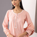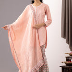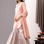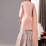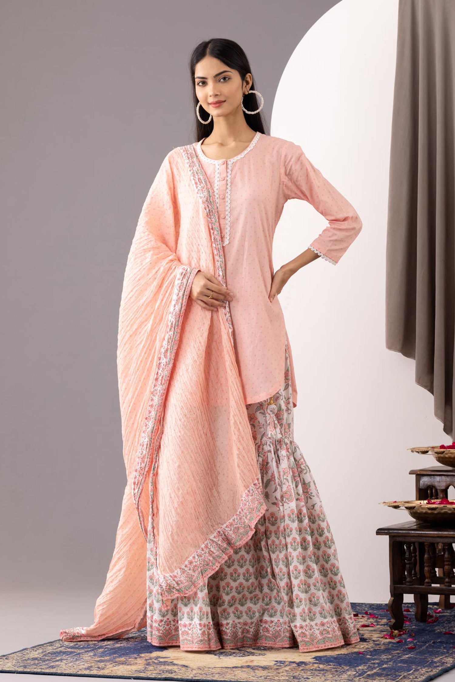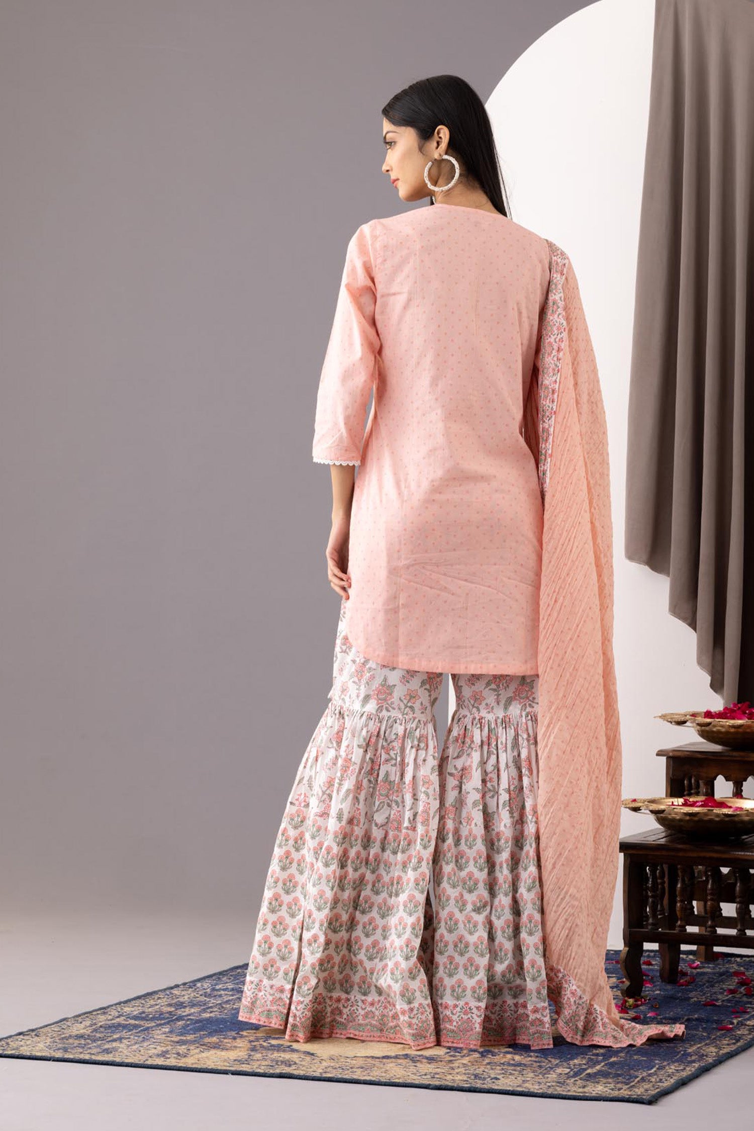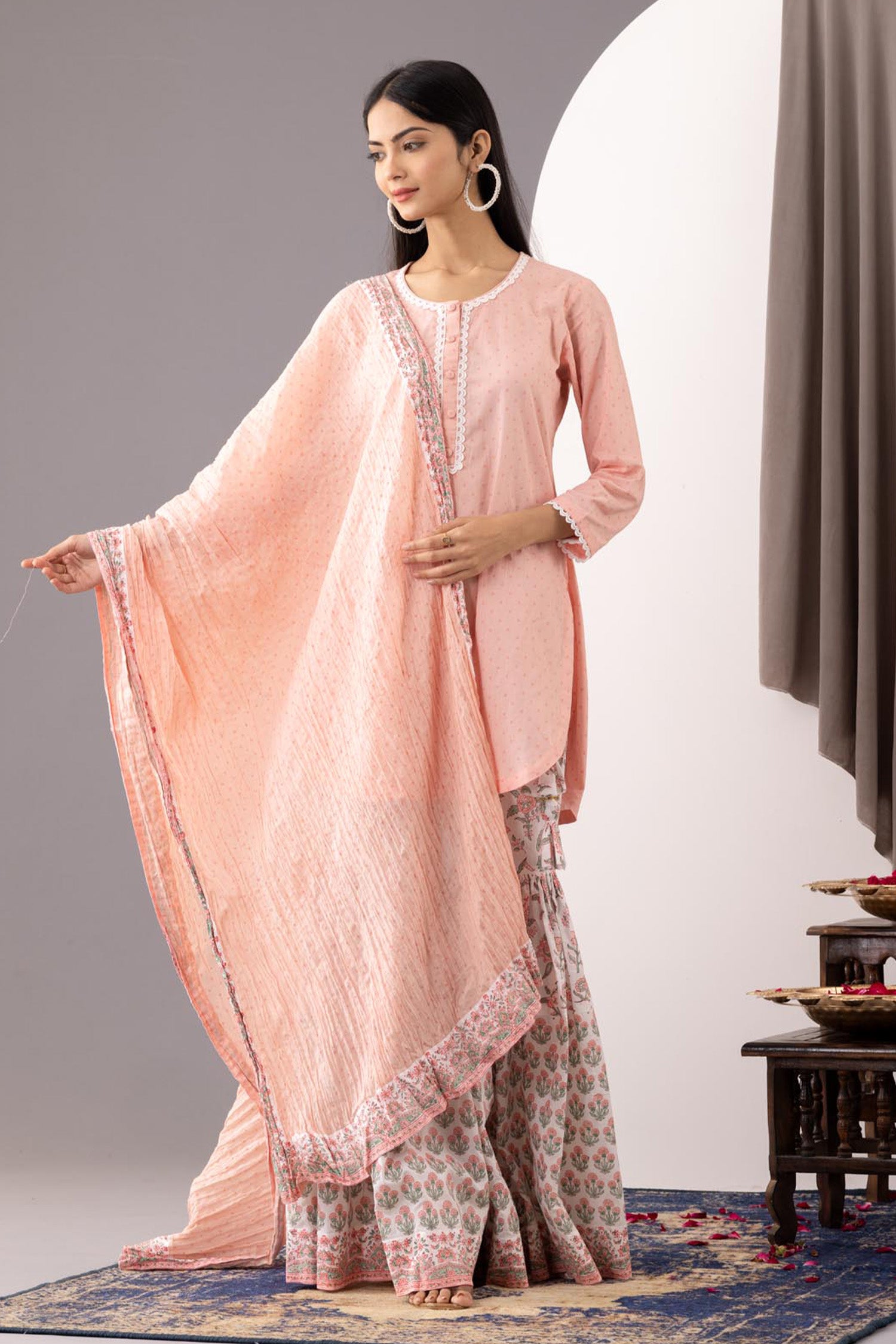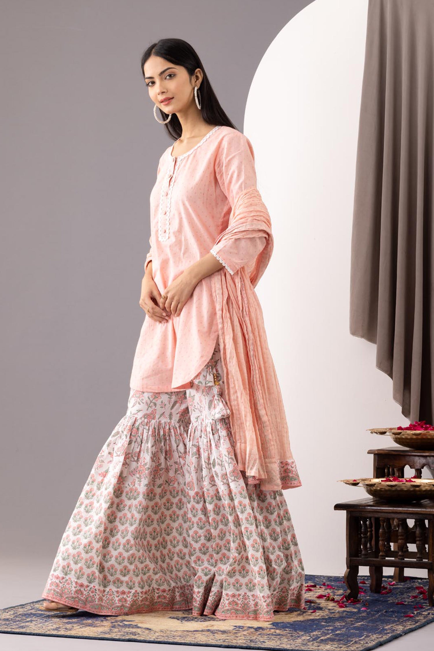 Block Printed Light Pink Cotton Kurta Gharara Set With Dupatta