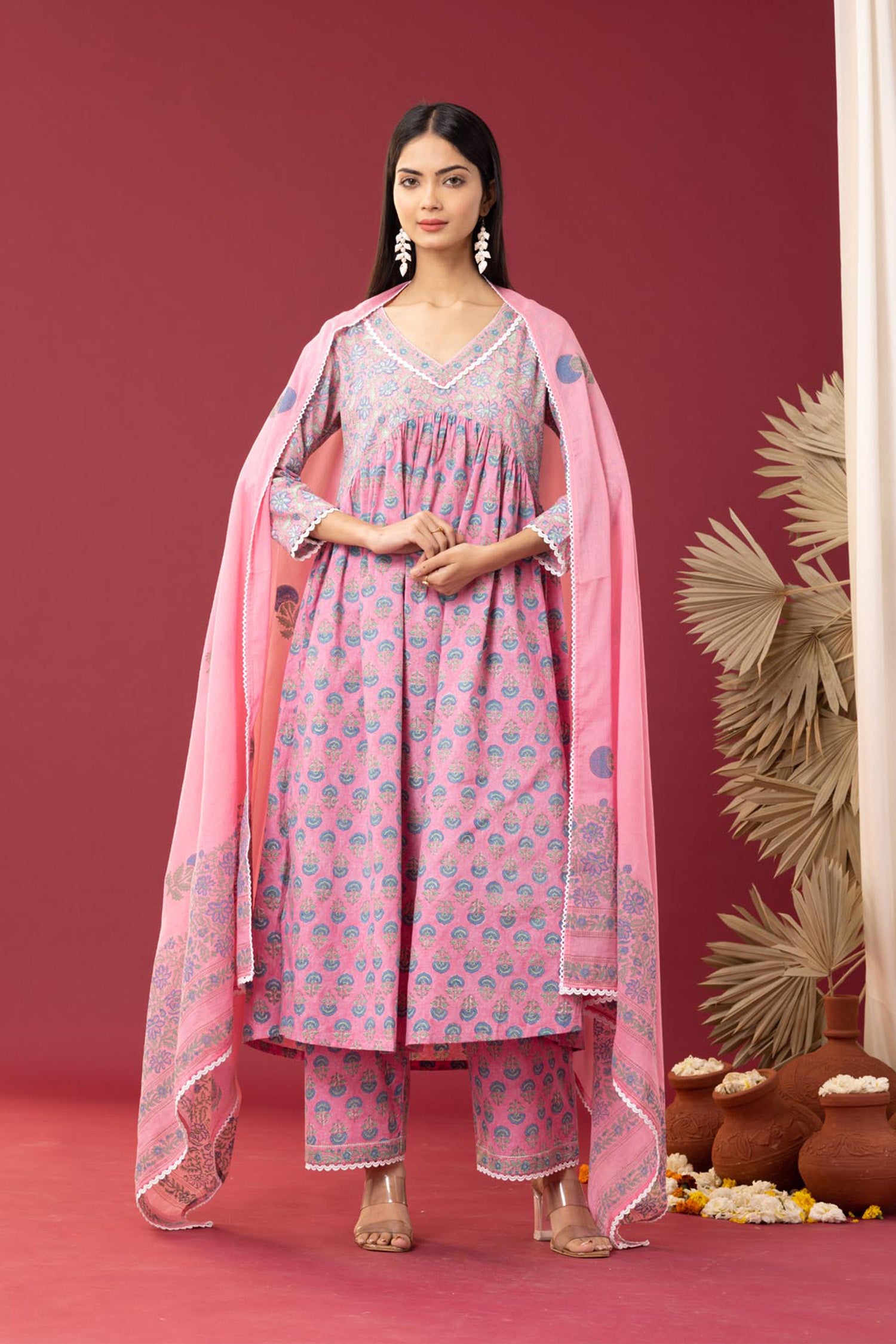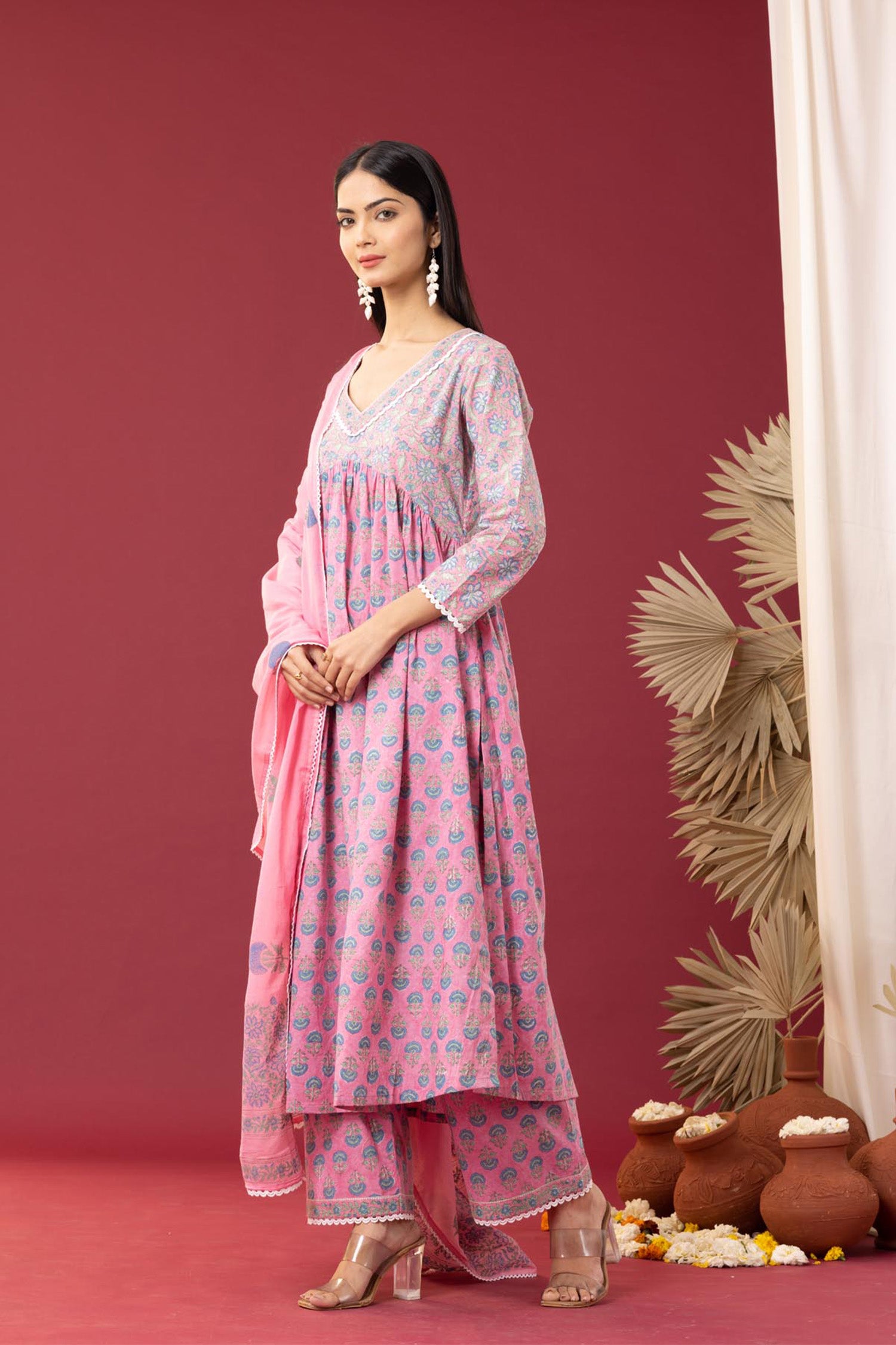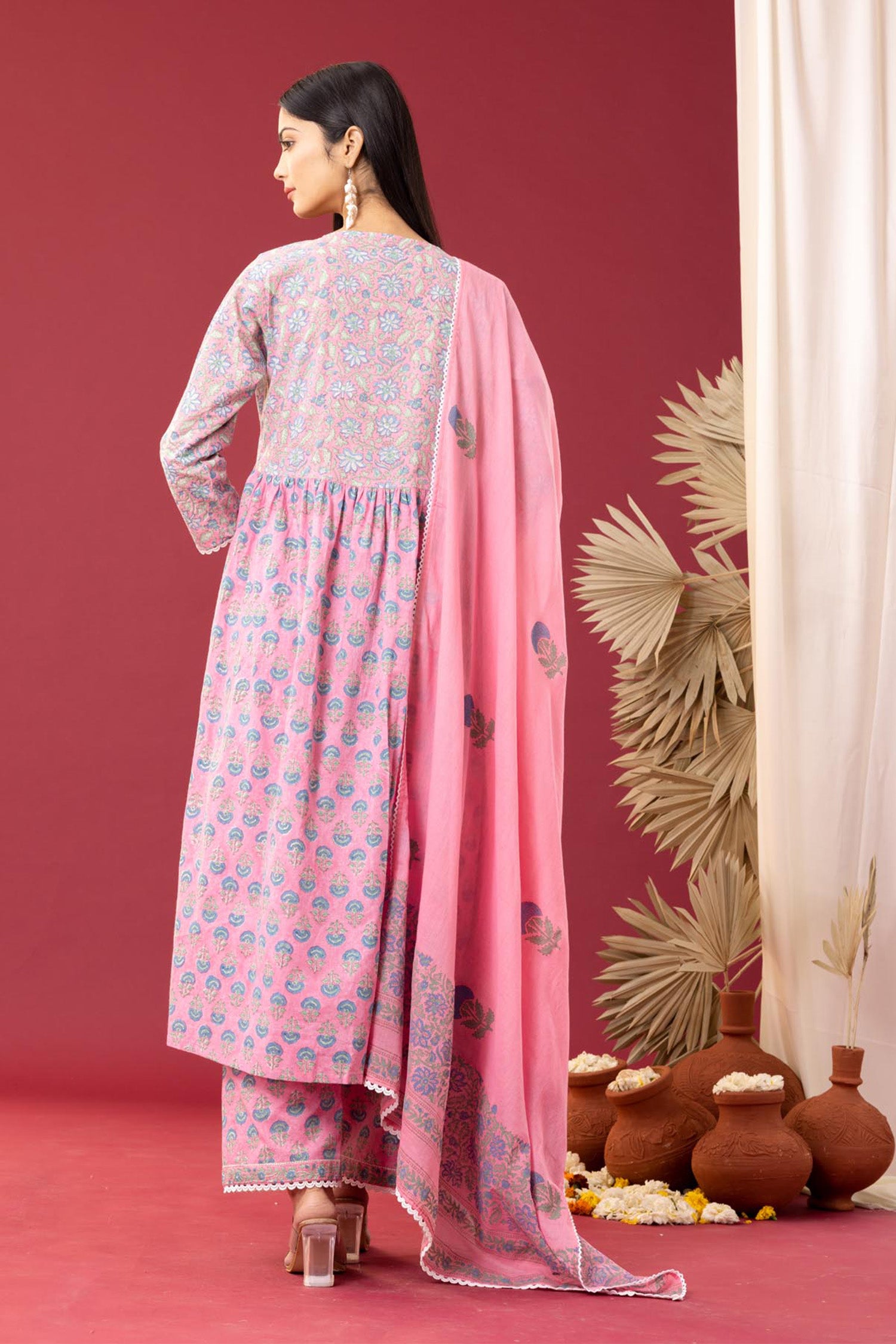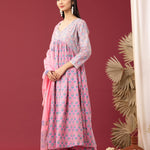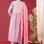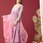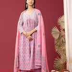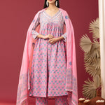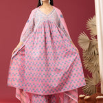 Block Printed Pink Gathered Cotton Kurti Set
