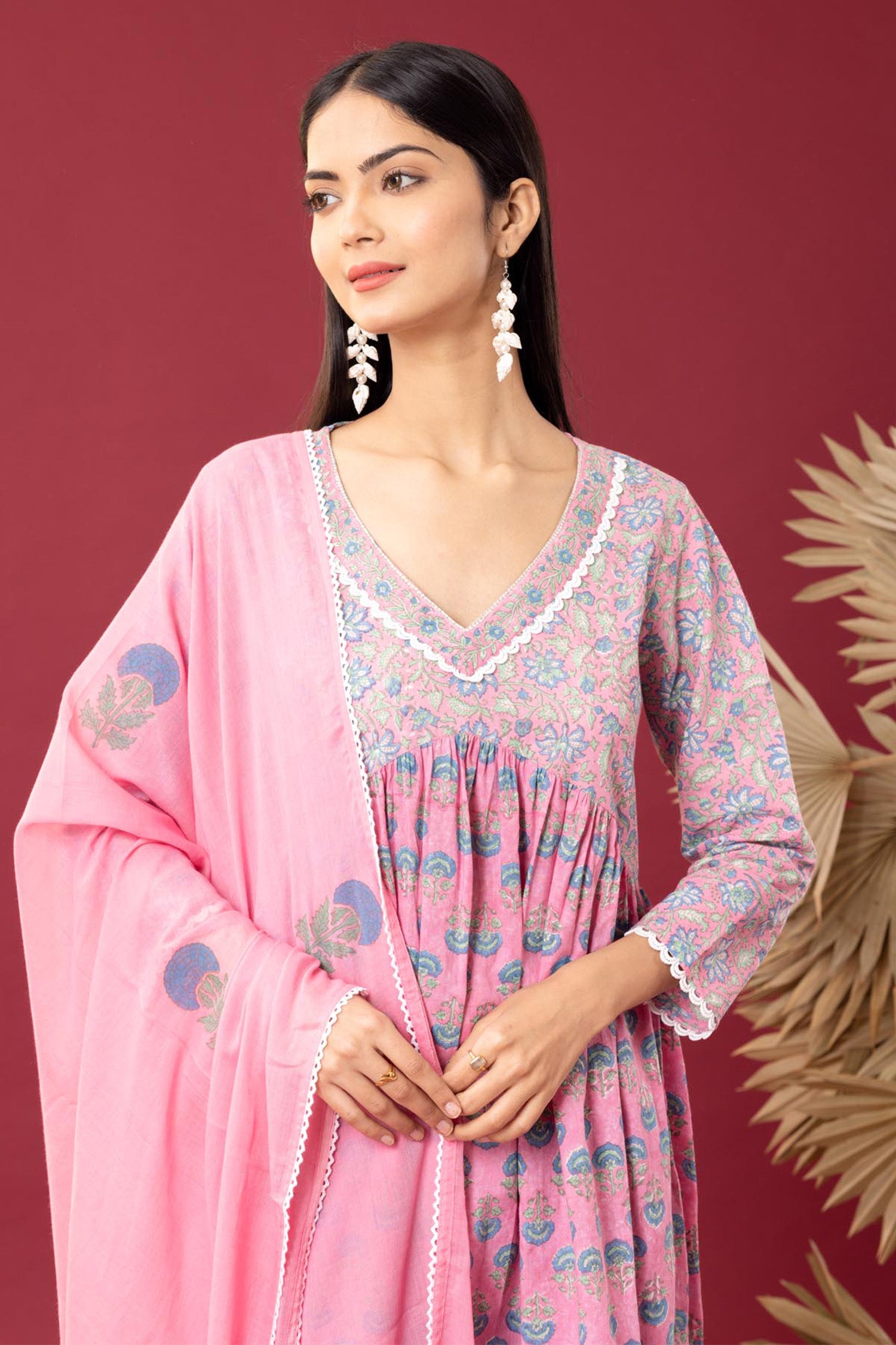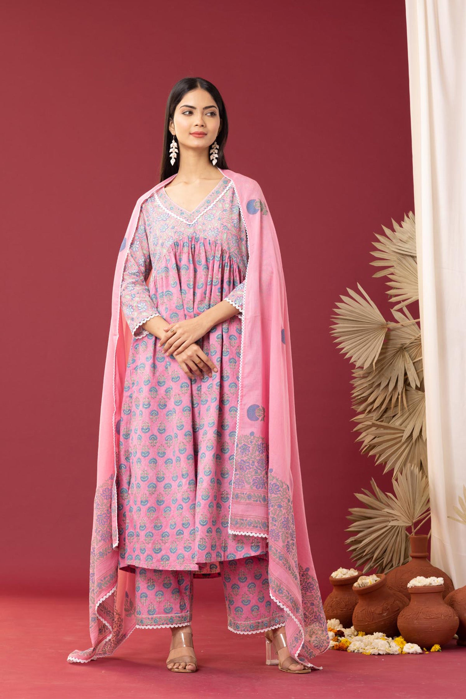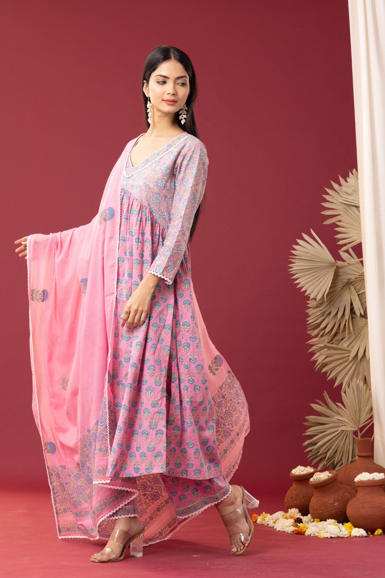 Block Printed Pink Gathered Cotton Kurti Set