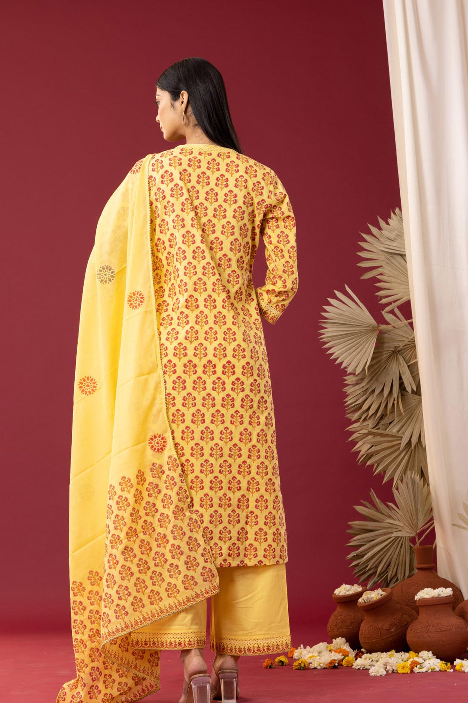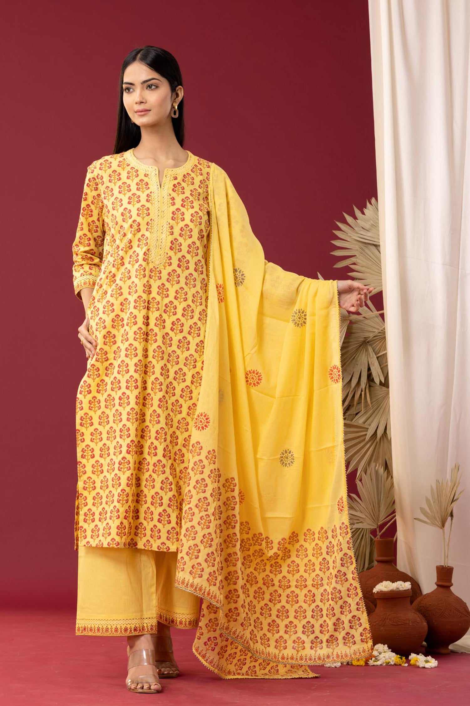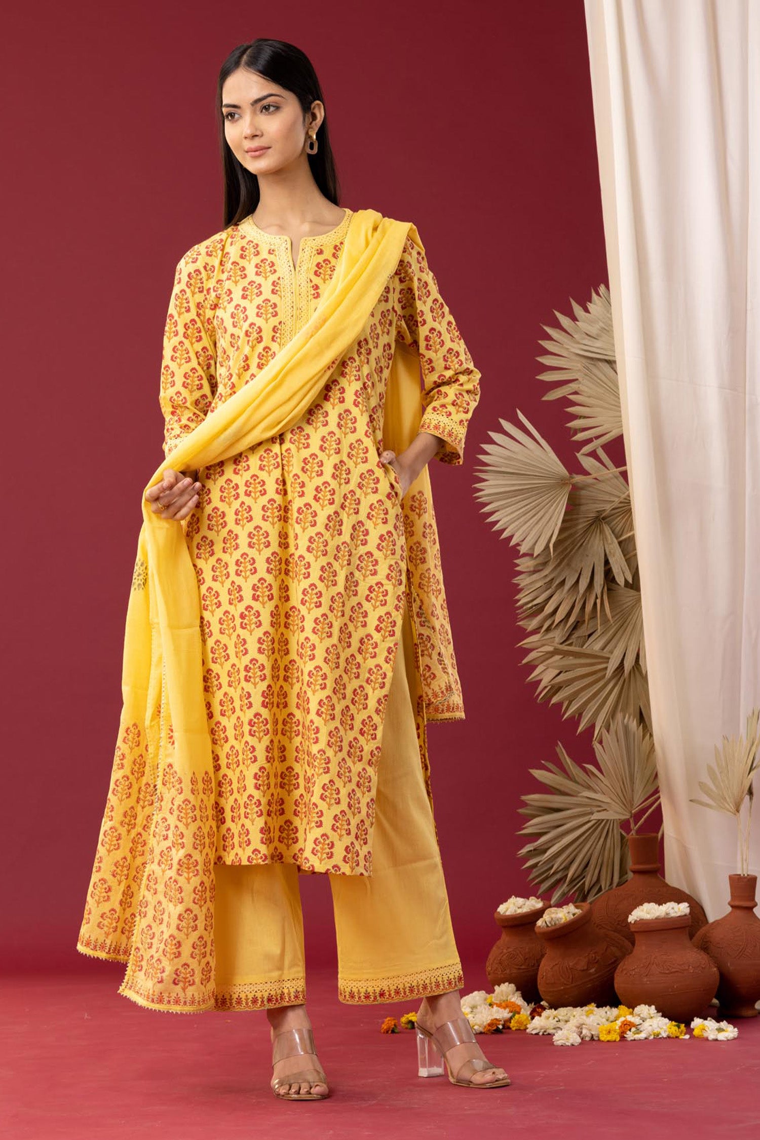 Block Printed Yellow Cotton Straight Kurta With Palazzo Set