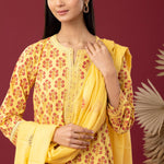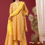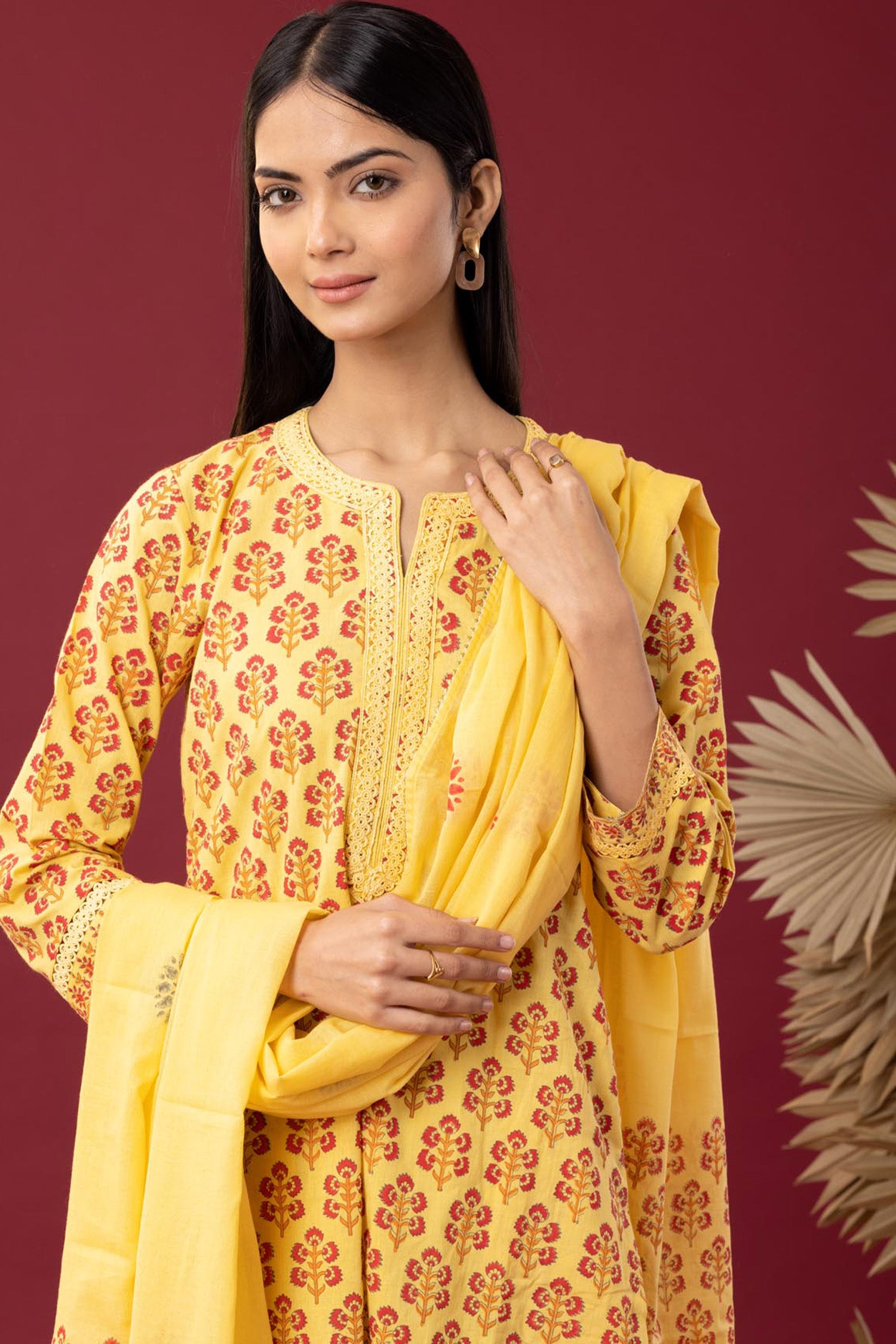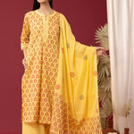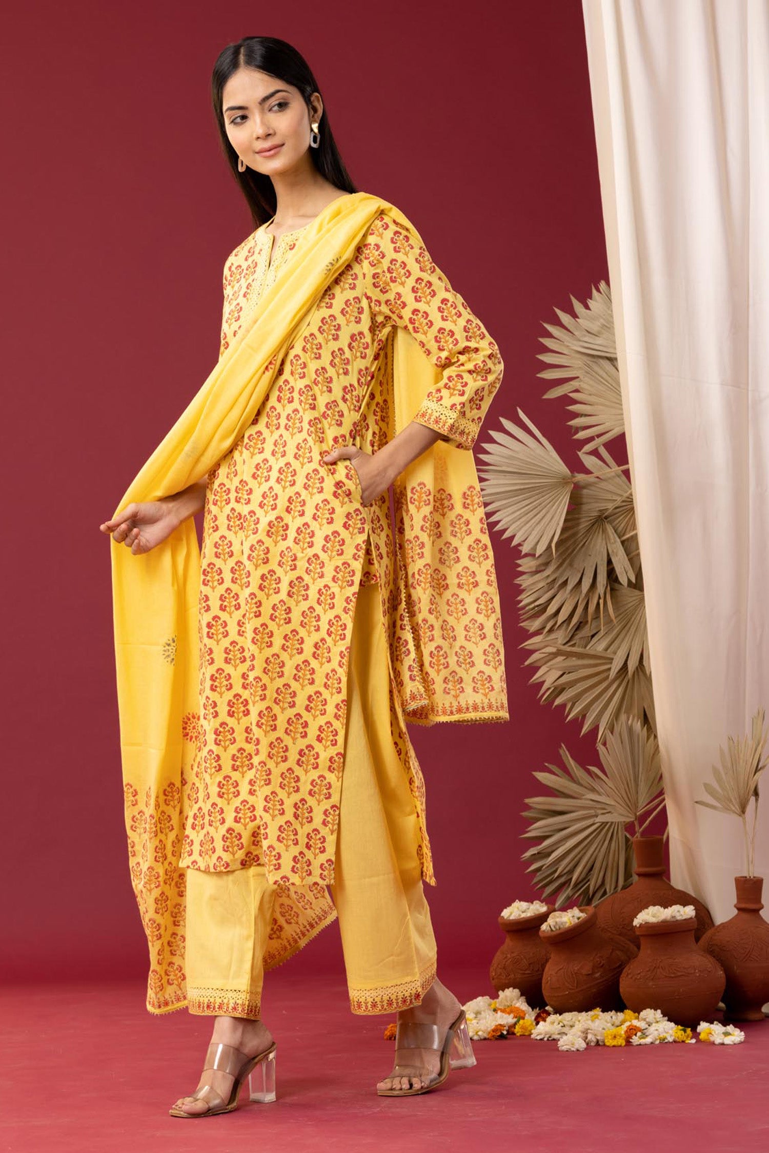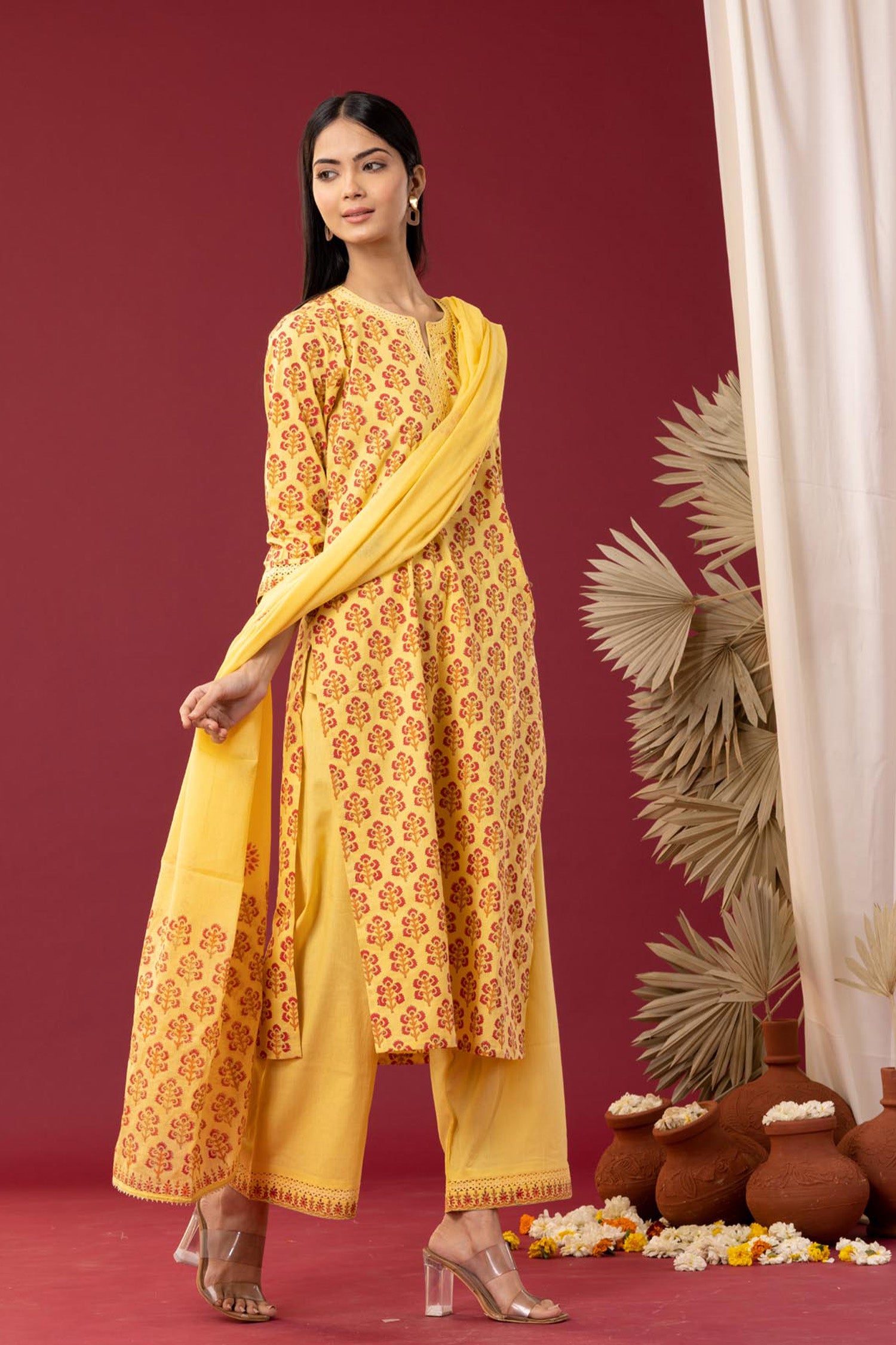 Block Printed Yellow Cotton Straight Kurta With Palazzo Set