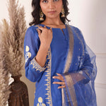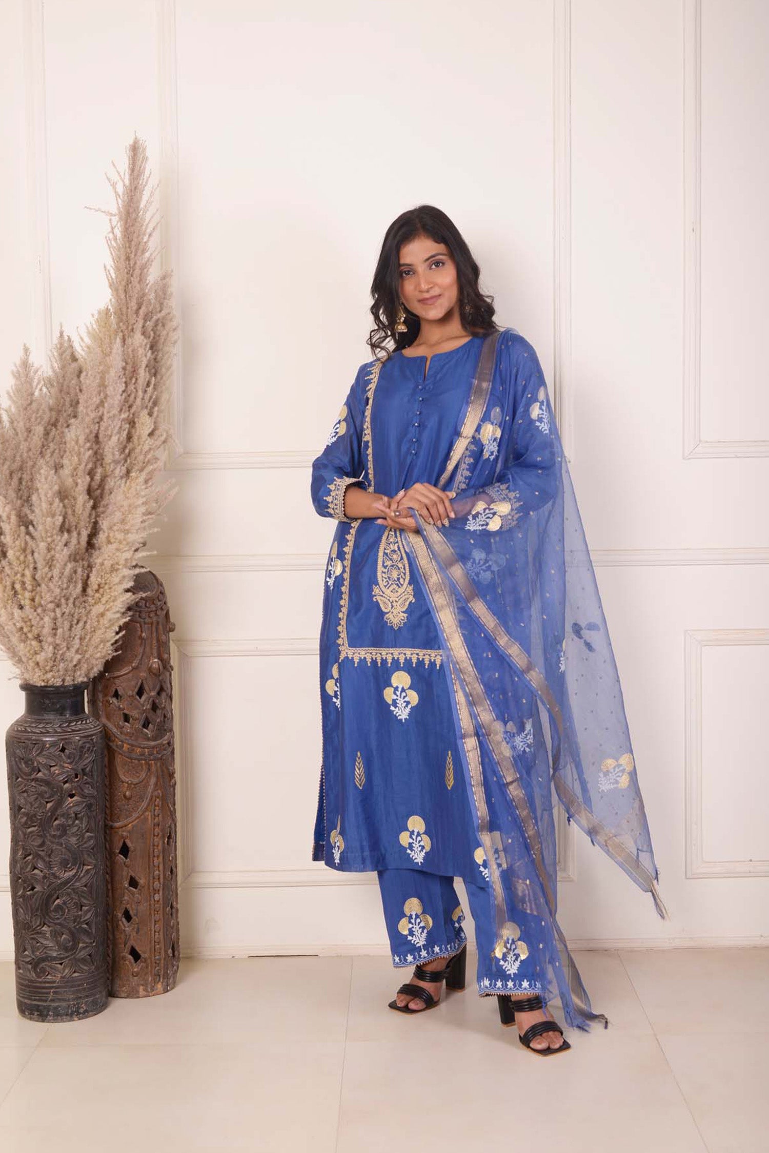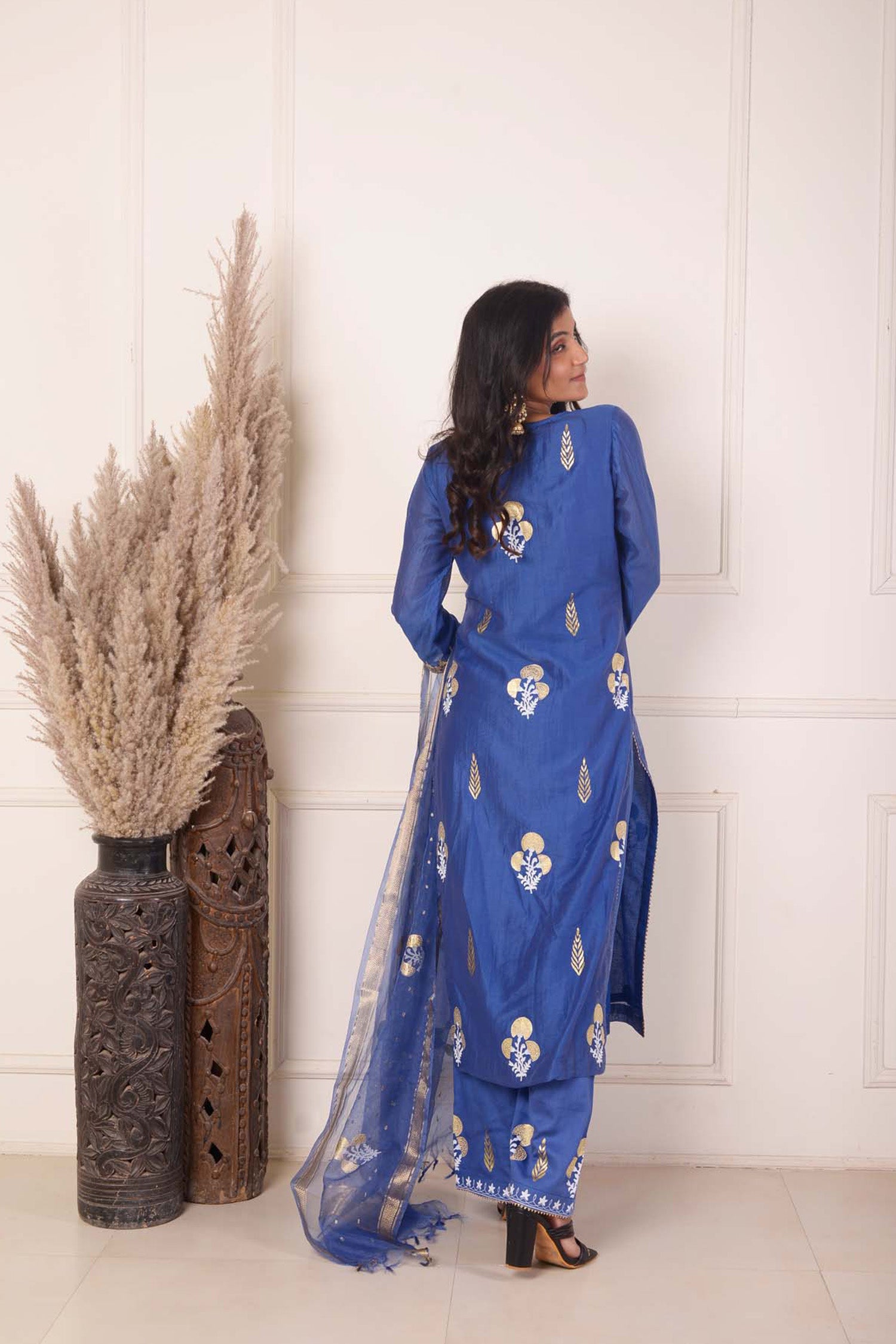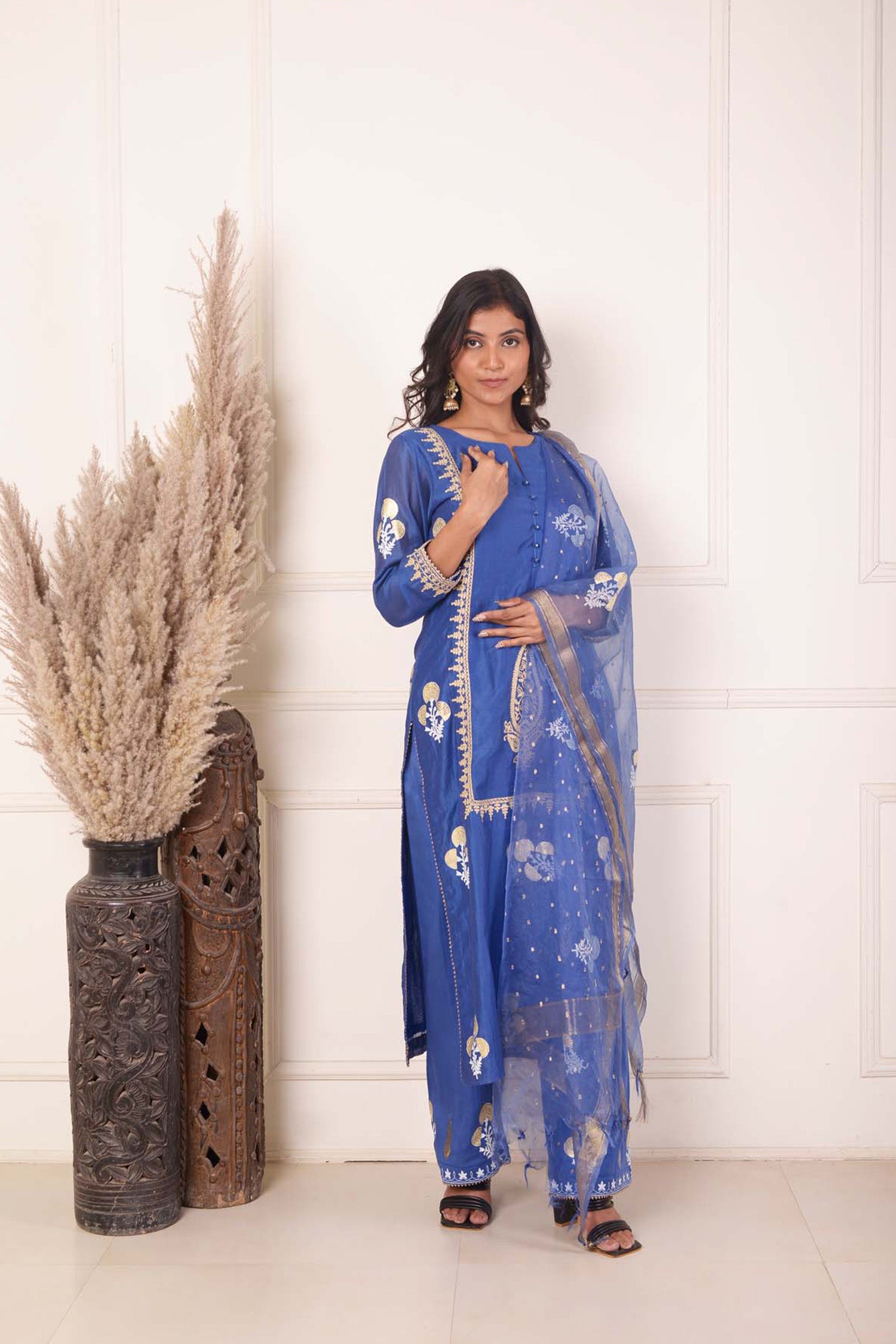 Blue Chanderi Straight Kurti With Pant And Dupatta