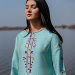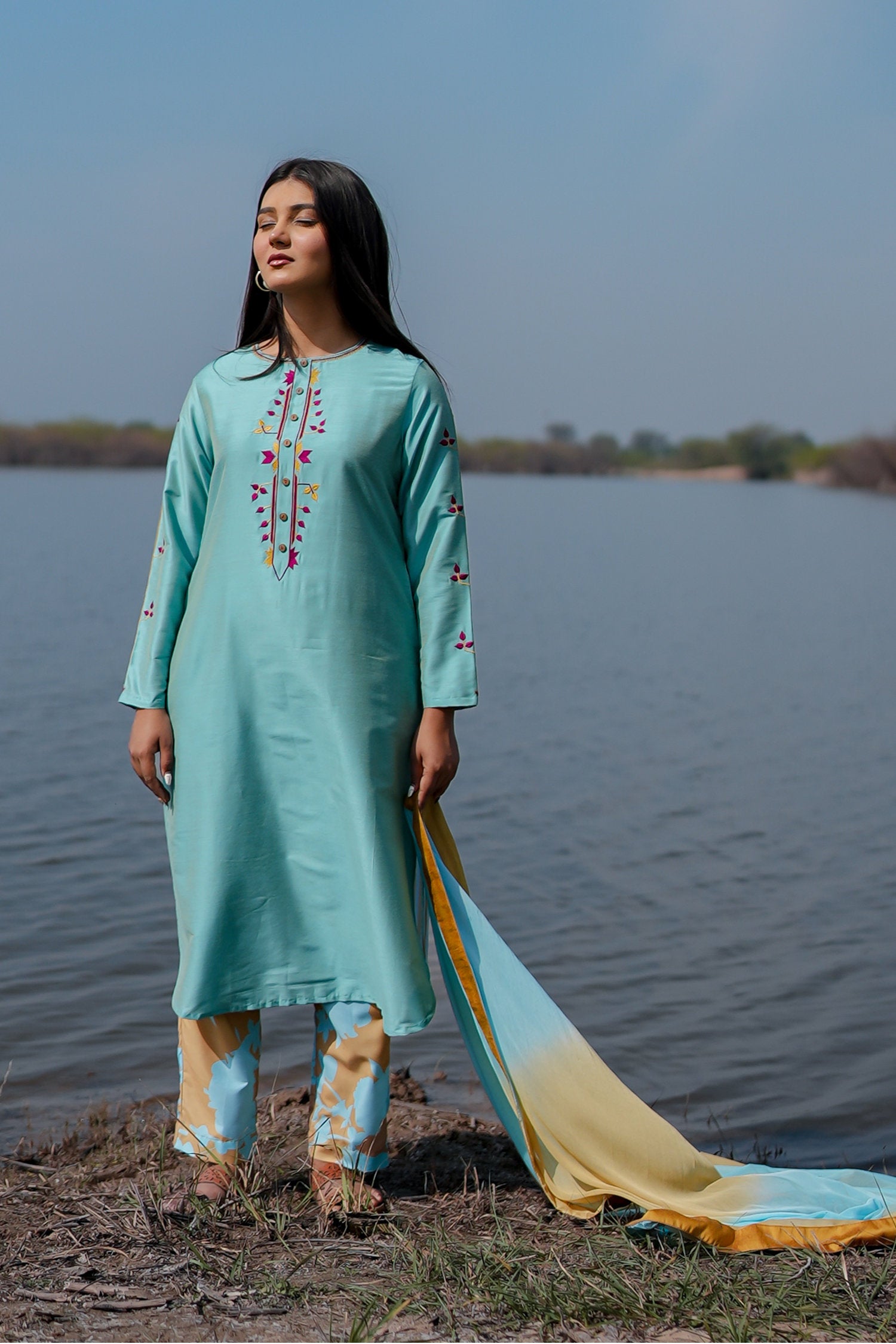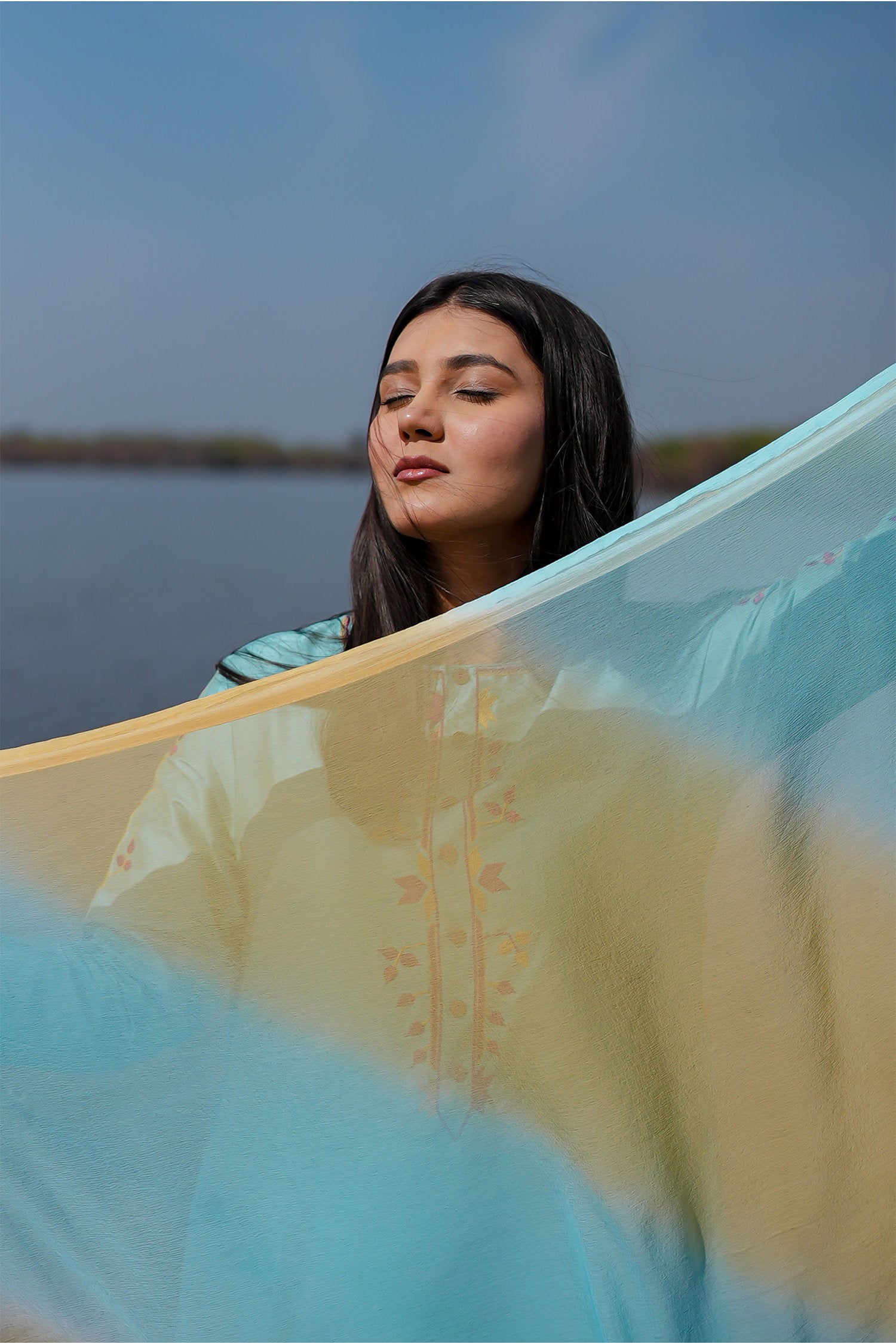 The blue cotton kurta set with hand embroidery and chiffon dupatta for a beautiful and stunning look with traditional touch.
