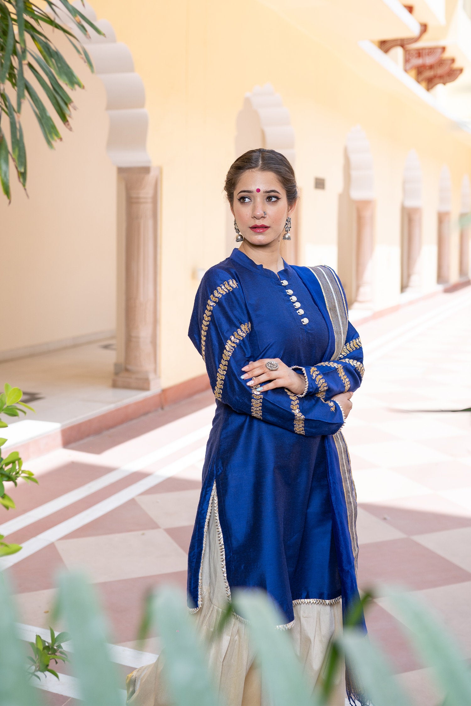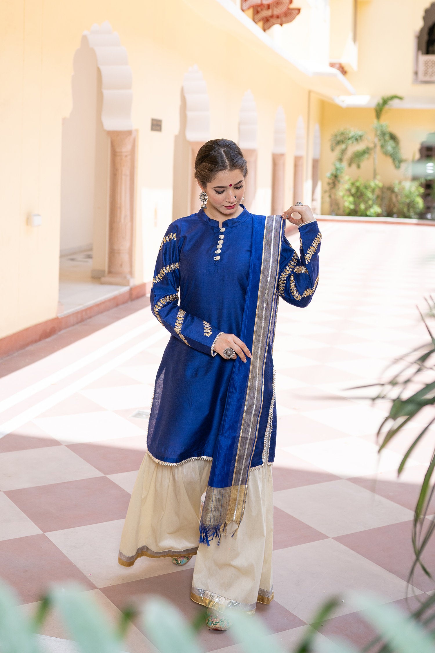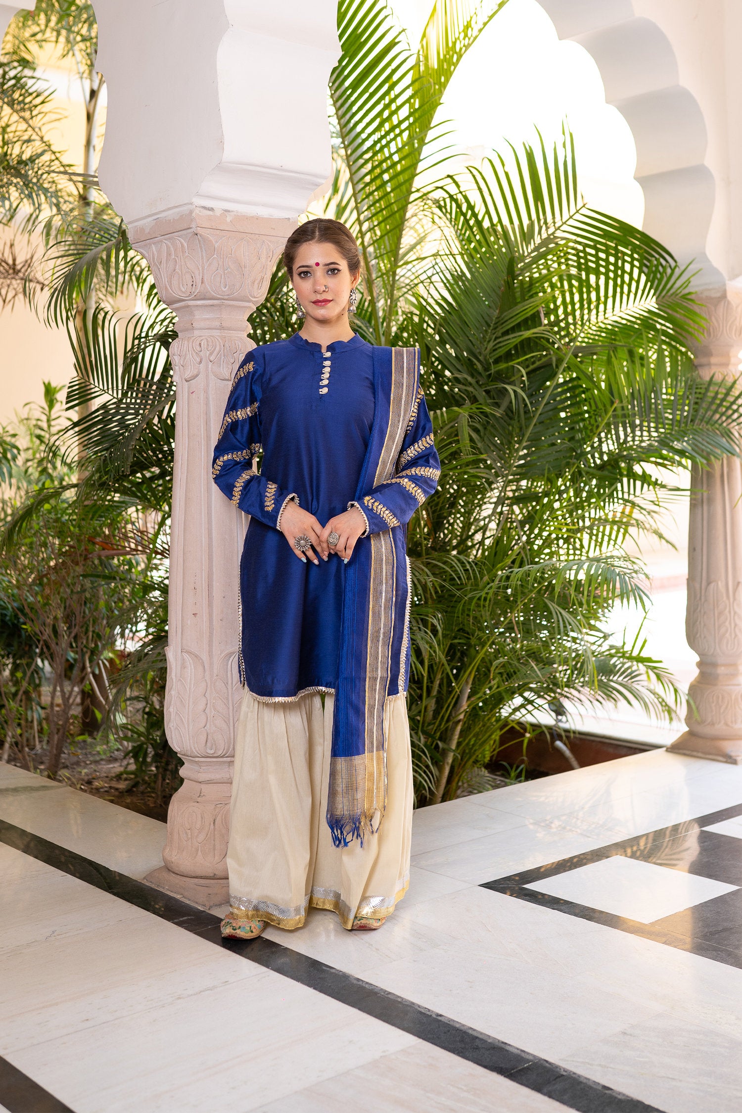 The blue cotton silk gota patti gharara suit set for a beautiful and majestic look combining style and tradition with class giving it an elegant look.