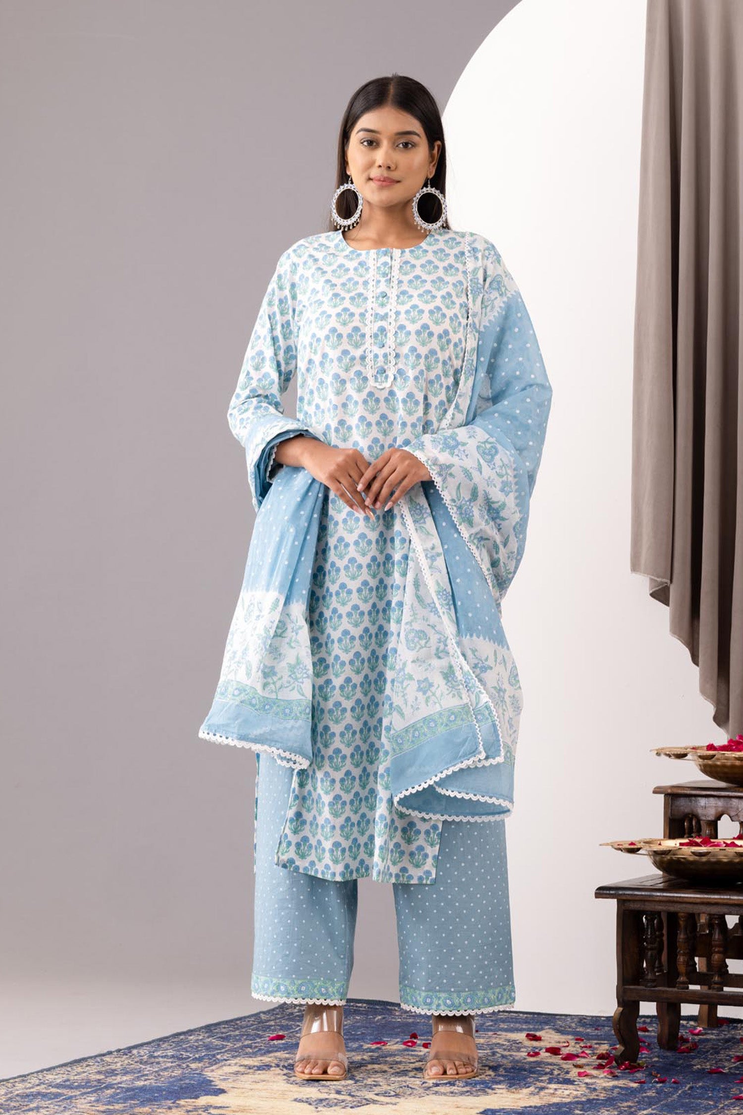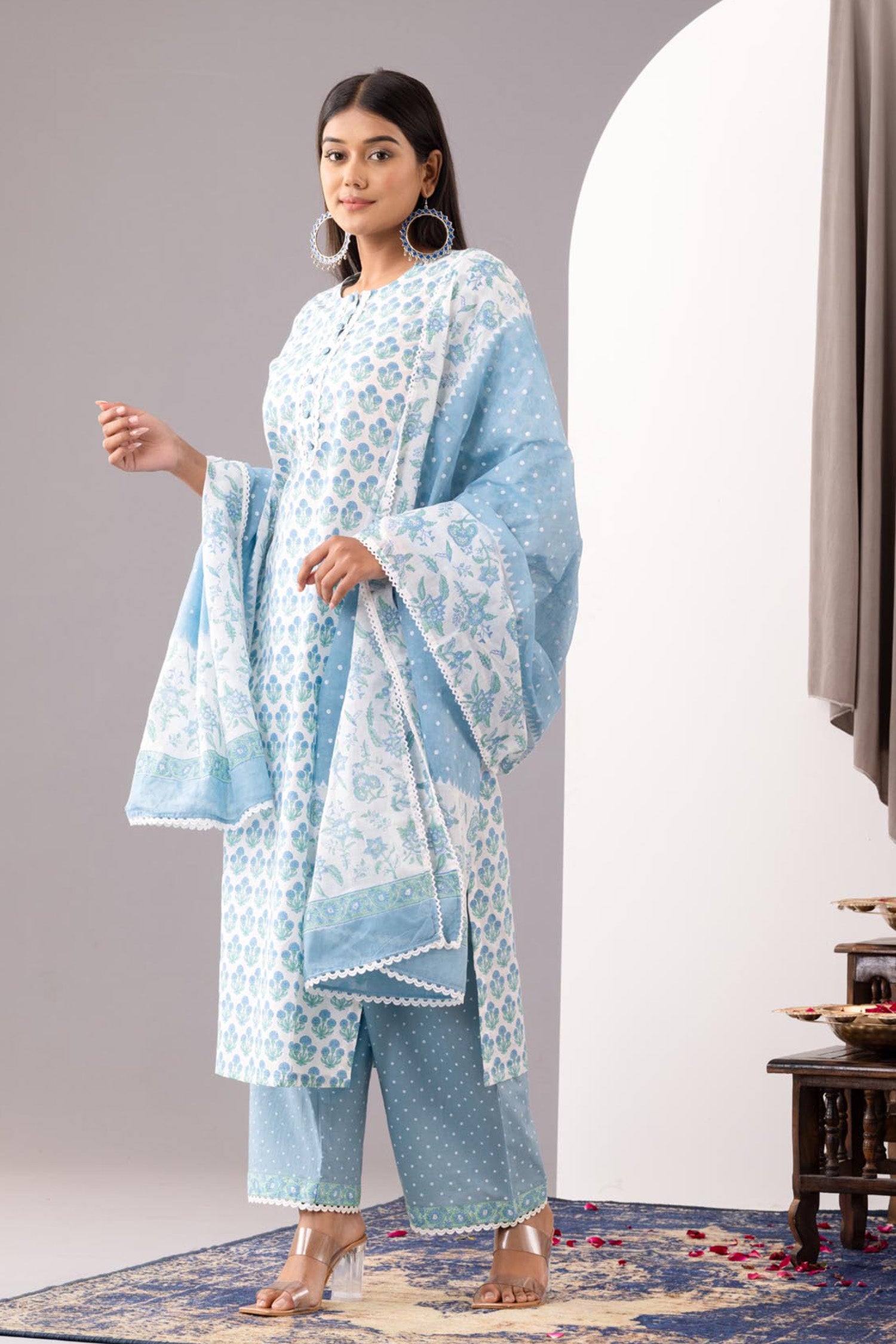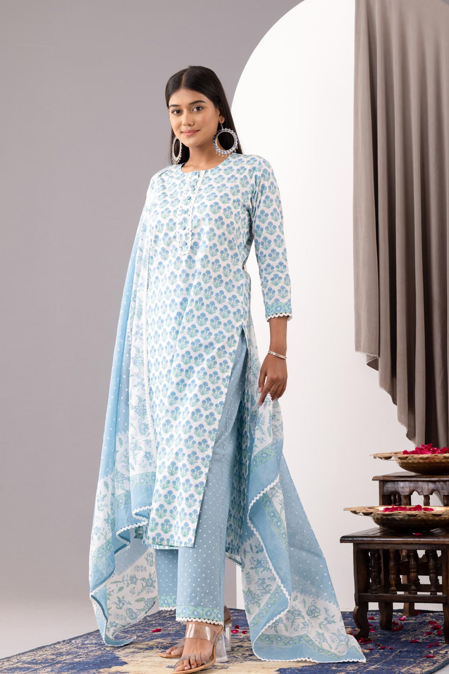 The Blue Hand Block Printed Straight cotton floral Print Kurta with matching Pant and dupatta for an elegant and stylish look.