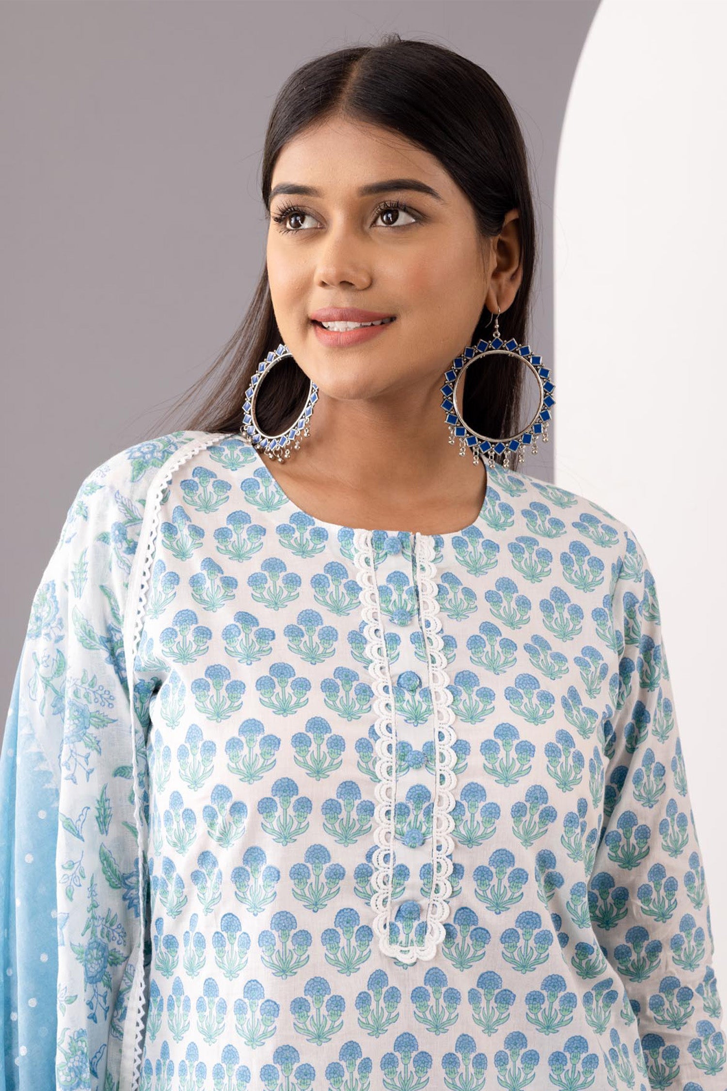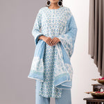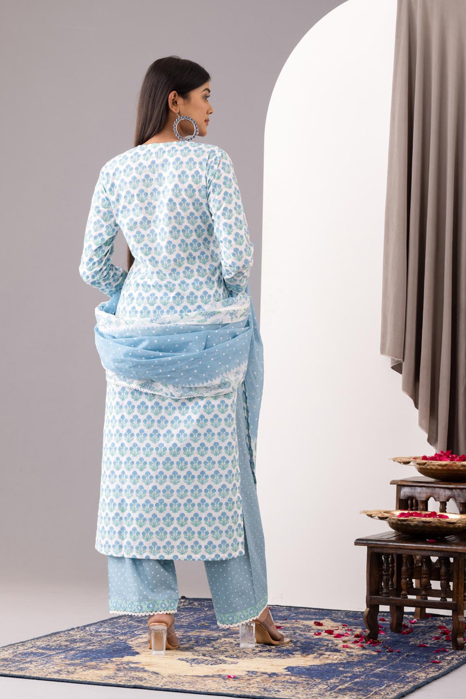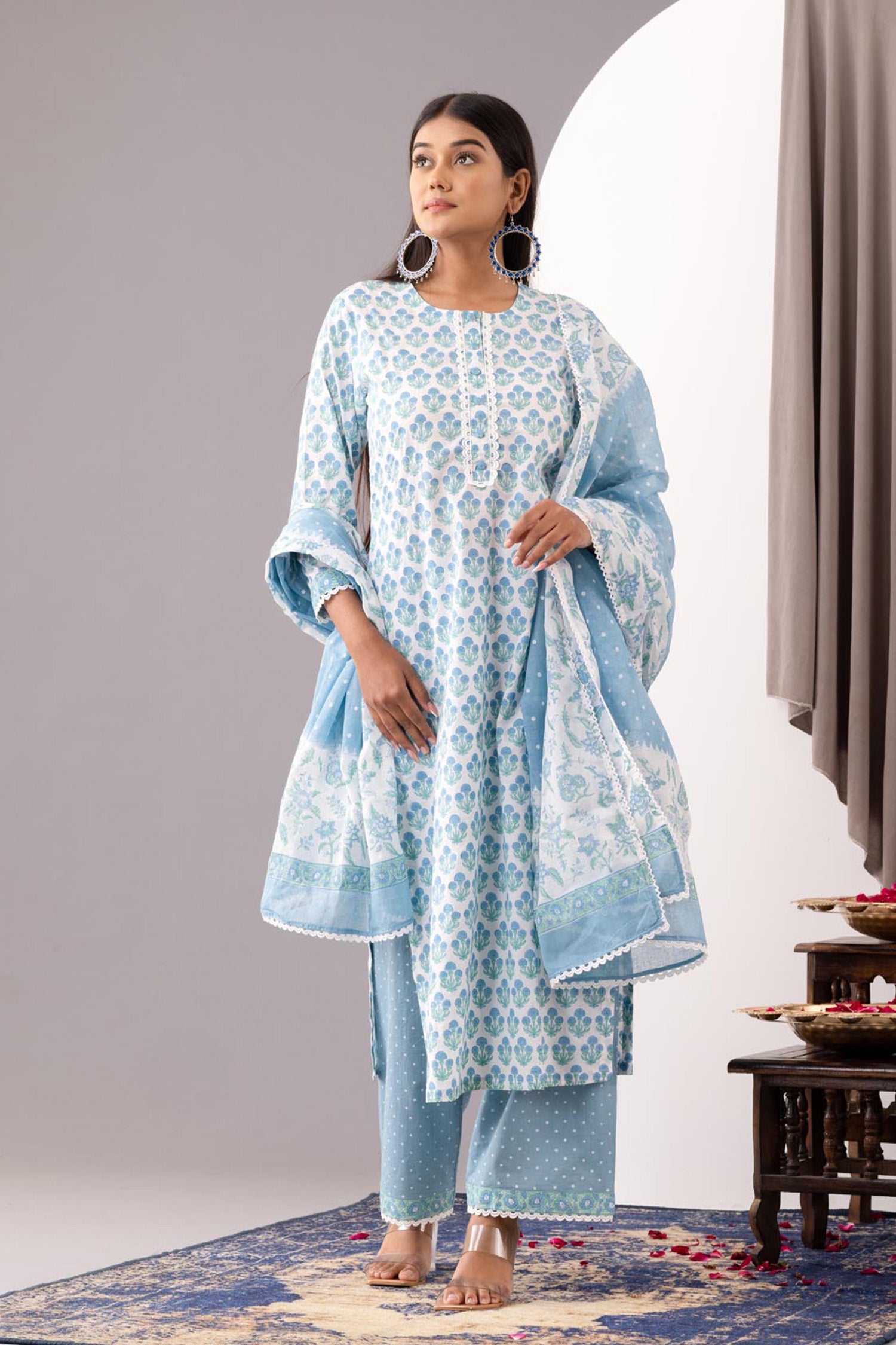 The Blue Hand Block Printed Straight cotton floral Print Kurta with matching Pant and dupatta for an elegant and stylish look.